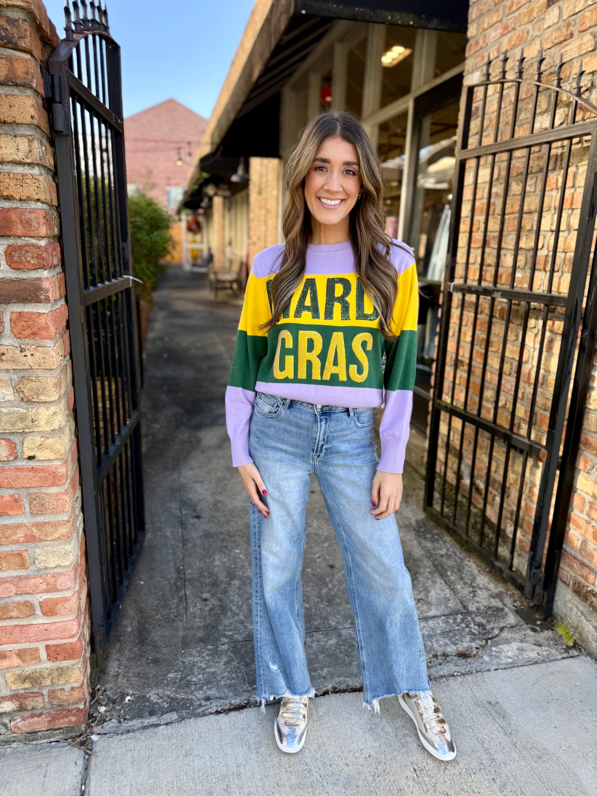 Celebrate in style with this vibrant Mardi Gras Colorblock Sweater! Featuring bold color blocking that pops, a cozy relaxed fit keeps you comfortable all day long. The chunky ribbed neckline, cuffs, and hemline add texture and structure, while shimmering sequins and a playful wordmark bring the party vibes. Perfect for mamboing all day and night.