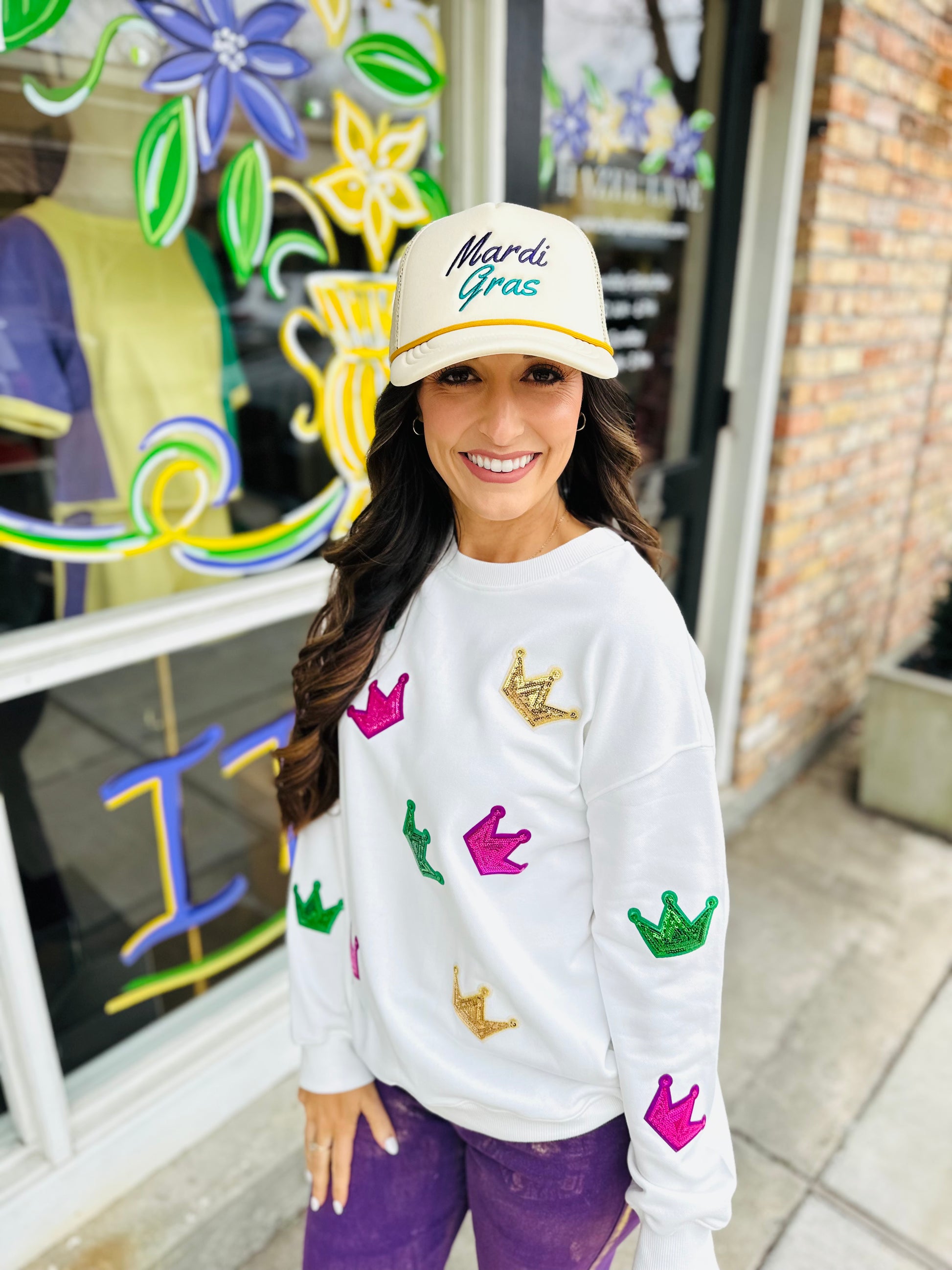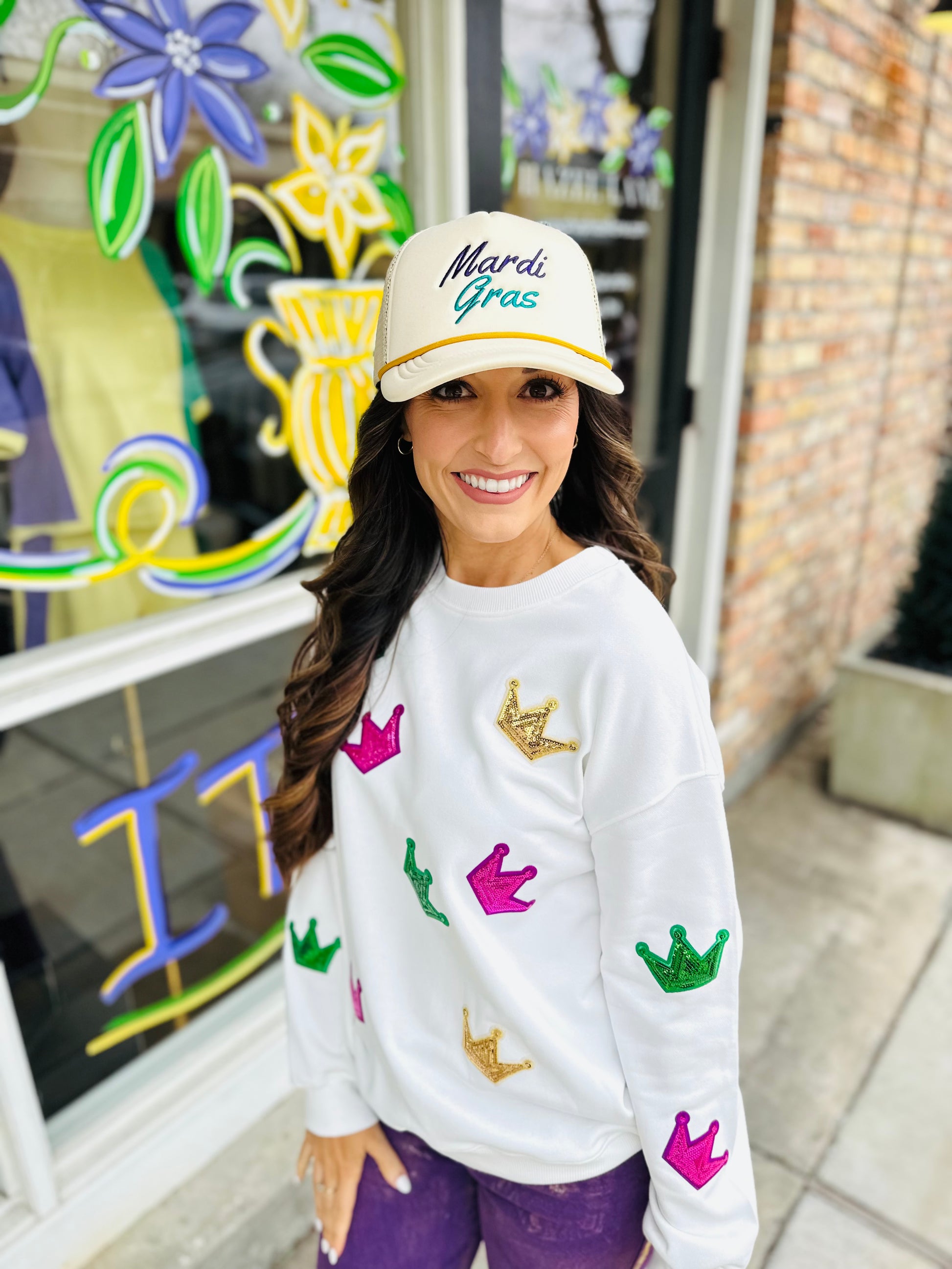 Stay stylish with our Mardi Grad Unisex Trucker Hat in ivory! Whether you're at a parade or a Mardi Gras party, this hat has you covered. And the best part? It fits everyone. Grab yours now!