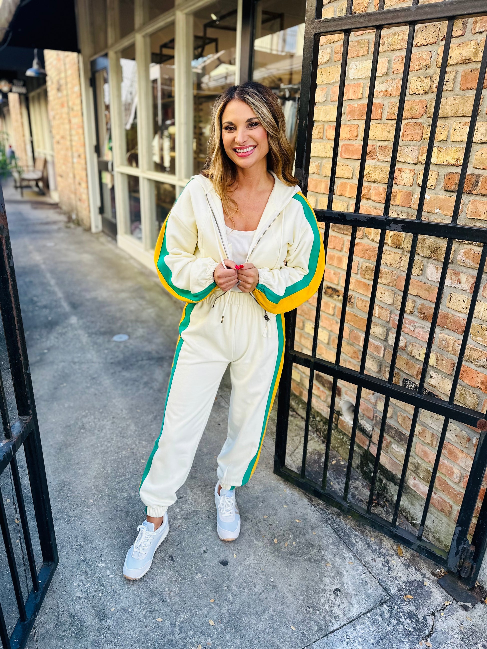 Celebrate in style with the Mardi Nation Sweatpants in ivory. These pants are parade route approved, so you can party without worrying about your outfit. Stay cozy and festive with this unique piece! Add the Mardi Nation Sweatshirt to complete your outfit.