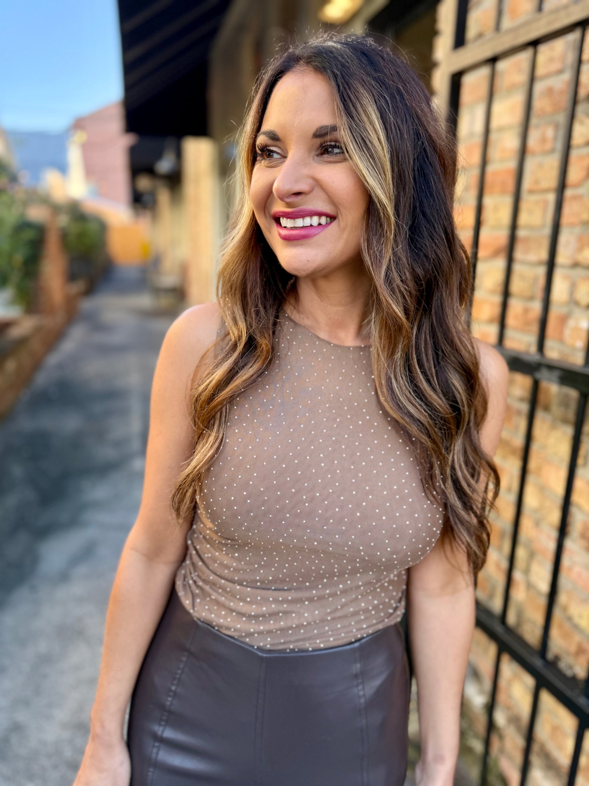 The Mariana Bodysuit is made from a stretch mesh with fabulous foil printed dots making this top perfect for dressy occasions. It has a slim fit, a crew neck and is fully lined.