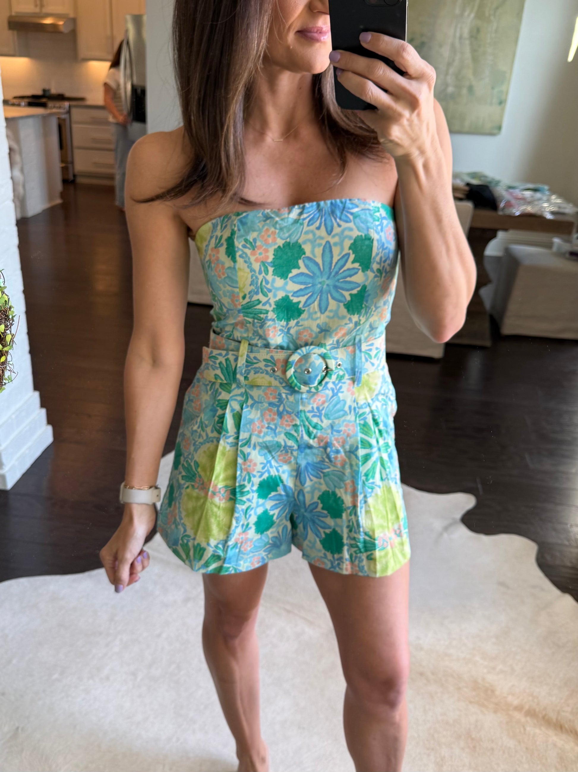 Introducing the Mason Belted Romper in refreshing multi blue lime pattern! Giving a summer vibe this romper is perfect for warm weather. With its playful design and comfortable fit, it's a must-have for any fashion lover. Upgrade your wardrobe now with our Mason Romper!