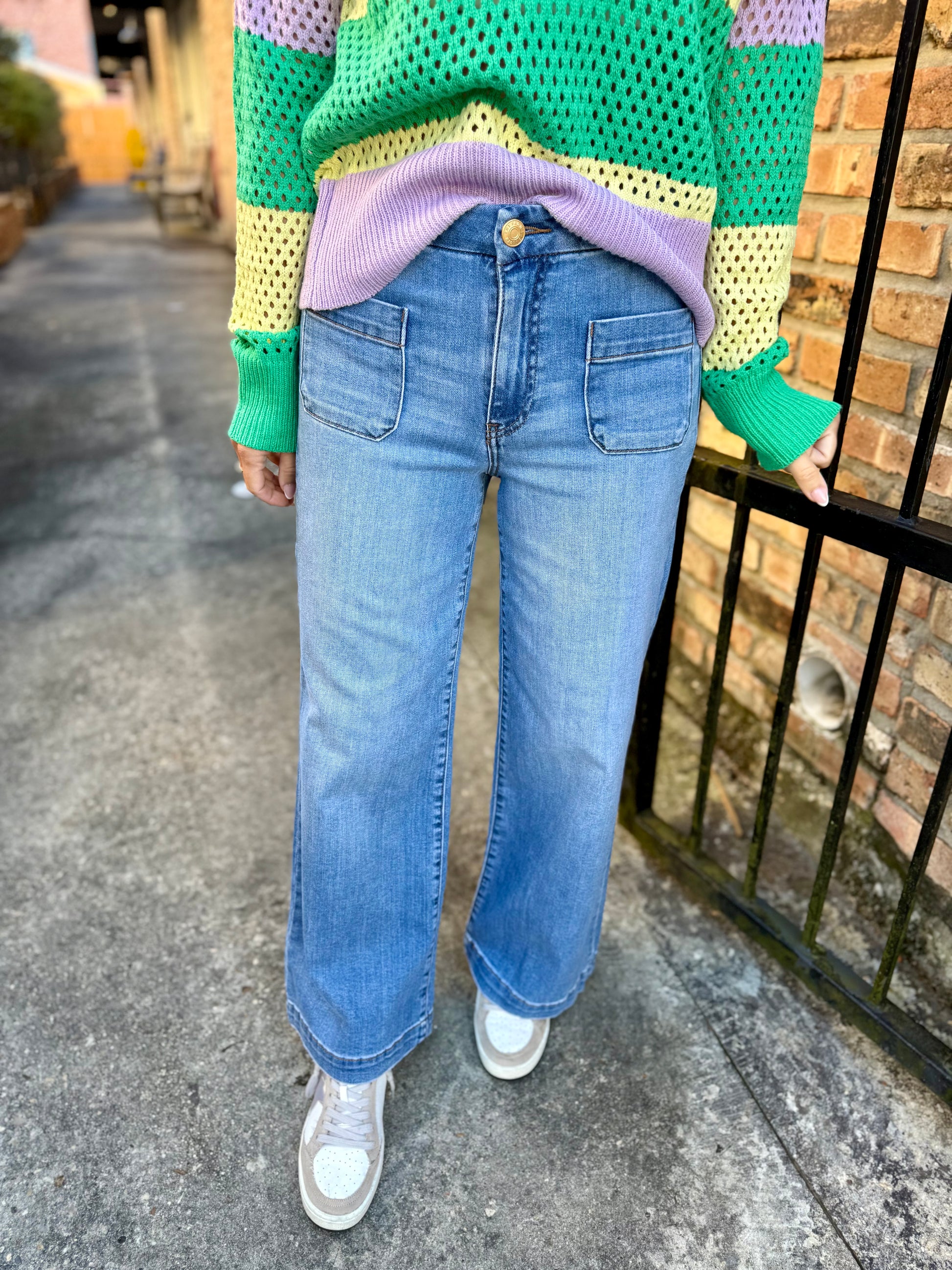 These high-rise wide leg jeans feature stylish patch pockets and a versatile medium wash for a timeless look. Crafted from very stretchy material, they offer exceptional comfort and freedom of movement. Effortlessly chic, they’re perfect for dressing up or down.