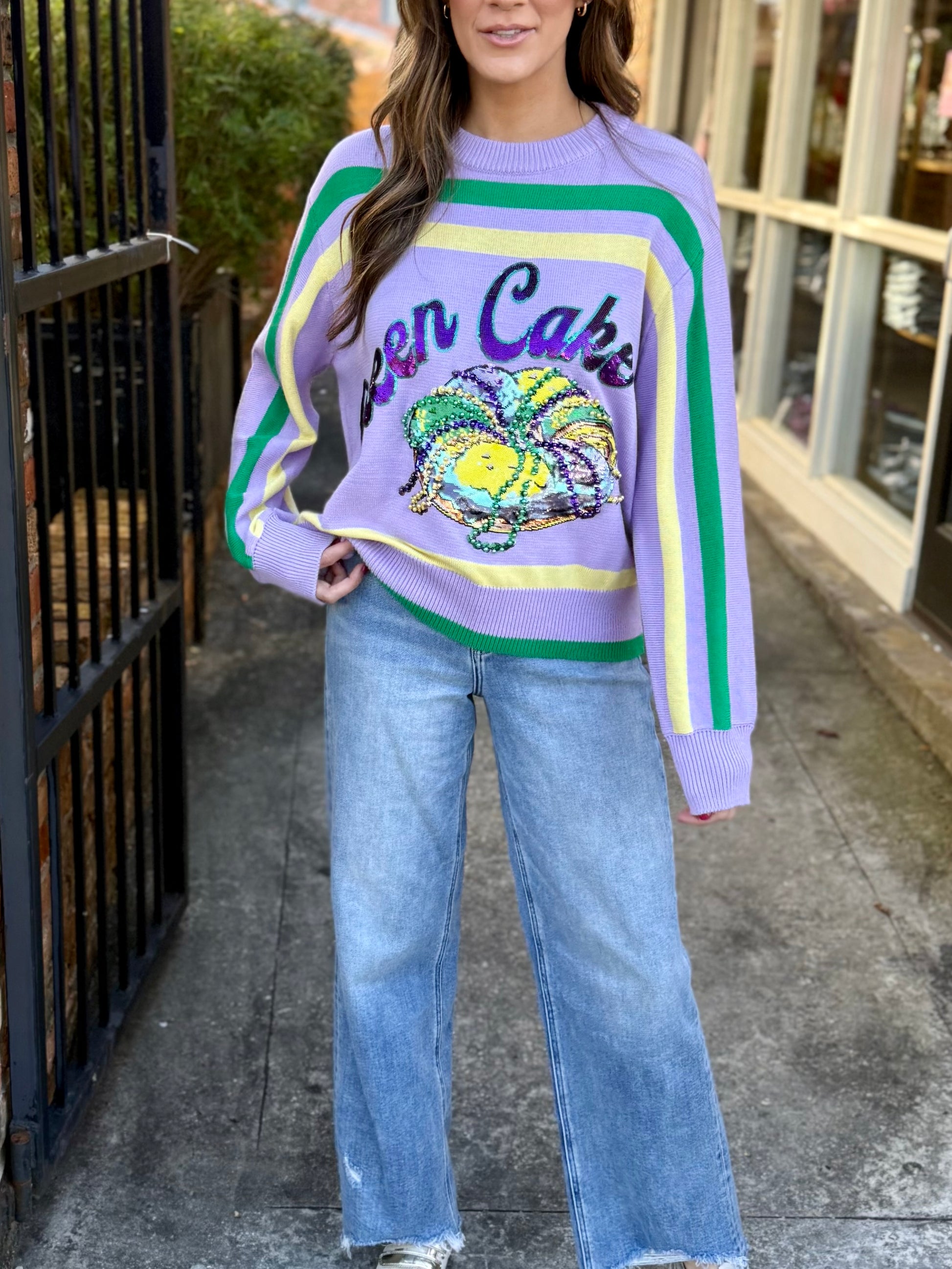 Get ready to turn heads at the parade in this show-stopping Mardi Gras Queen Cake Striped Sweater! Featuring bold, eye-catching stripes inspired by the iconic king cake, this piece brings flair and serious sparkle to your celebration. Perfect for Queen of Sparkles fans who want to make a statement, this sweater combines playful style with parade-ready pizzazz. Whether you're catching beads or heading to a king cake party, you'll be the most dazzling guest in the crowd. Let the good times roll!