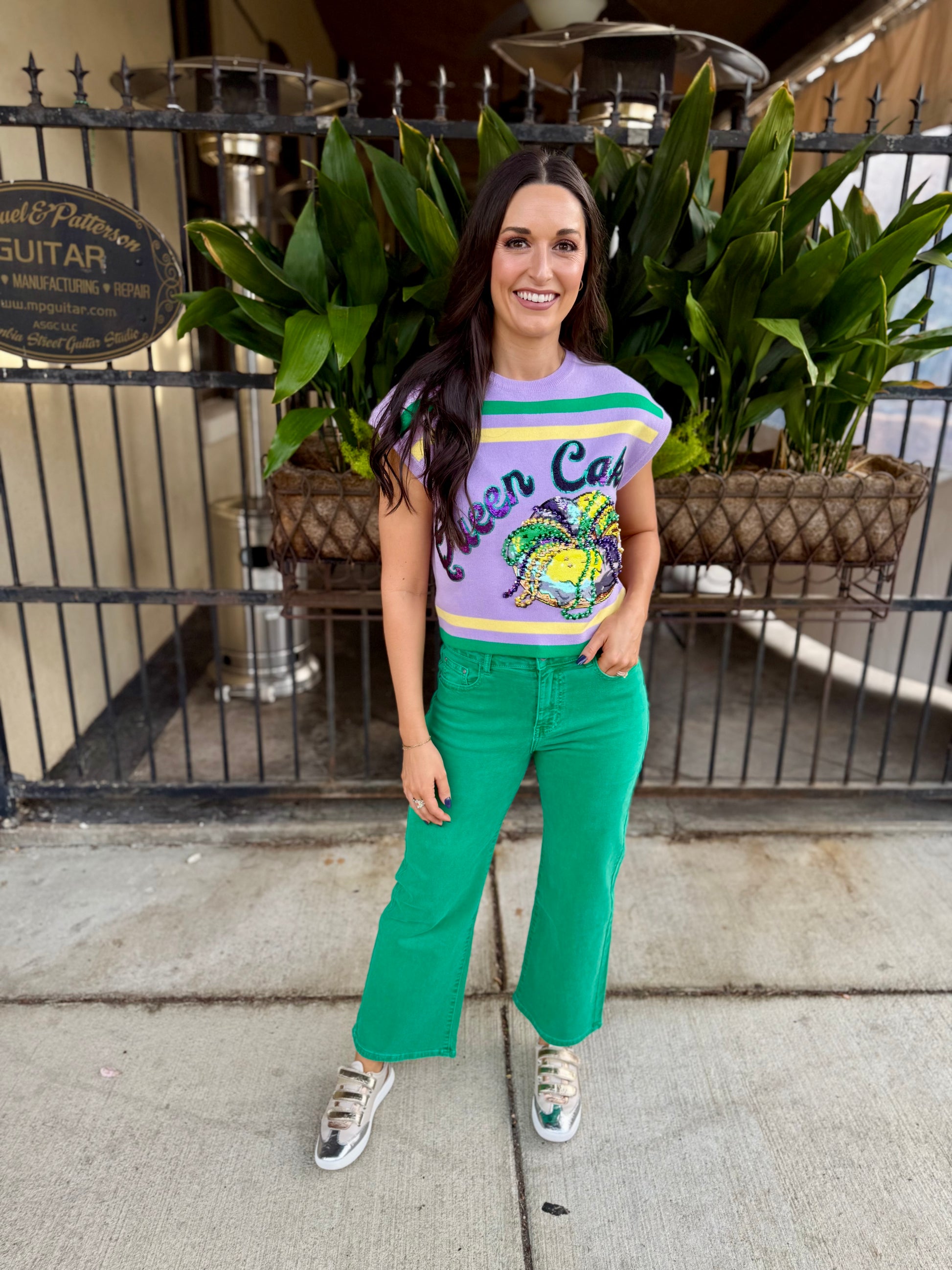 Get ready to turn heads at the parade in this show-stopping Mardi Gras Queen Cake Striped Top! This short sleeve bold, eye-catching top is inspired by the iconic king cake, this piece brings flair and serious sparkle to your celebration. Perfect for Queen of Sparkles fans who want to make a statement, this top combines playful style with parade-ready pizzazz. Whether you're catching beads or heading to a king cake party, you'll be the most dazzling guest in the crowd. Let the good times roll!
