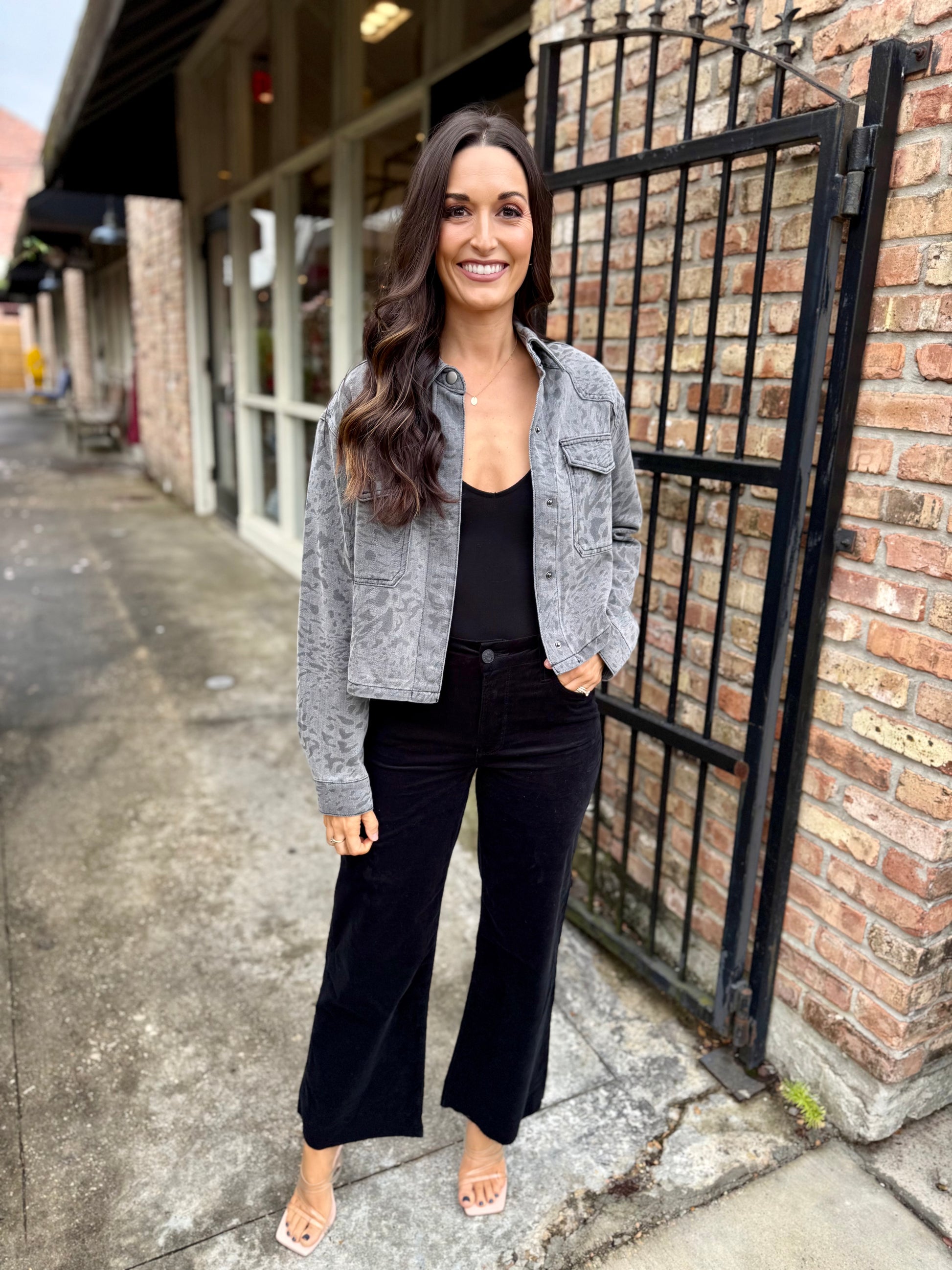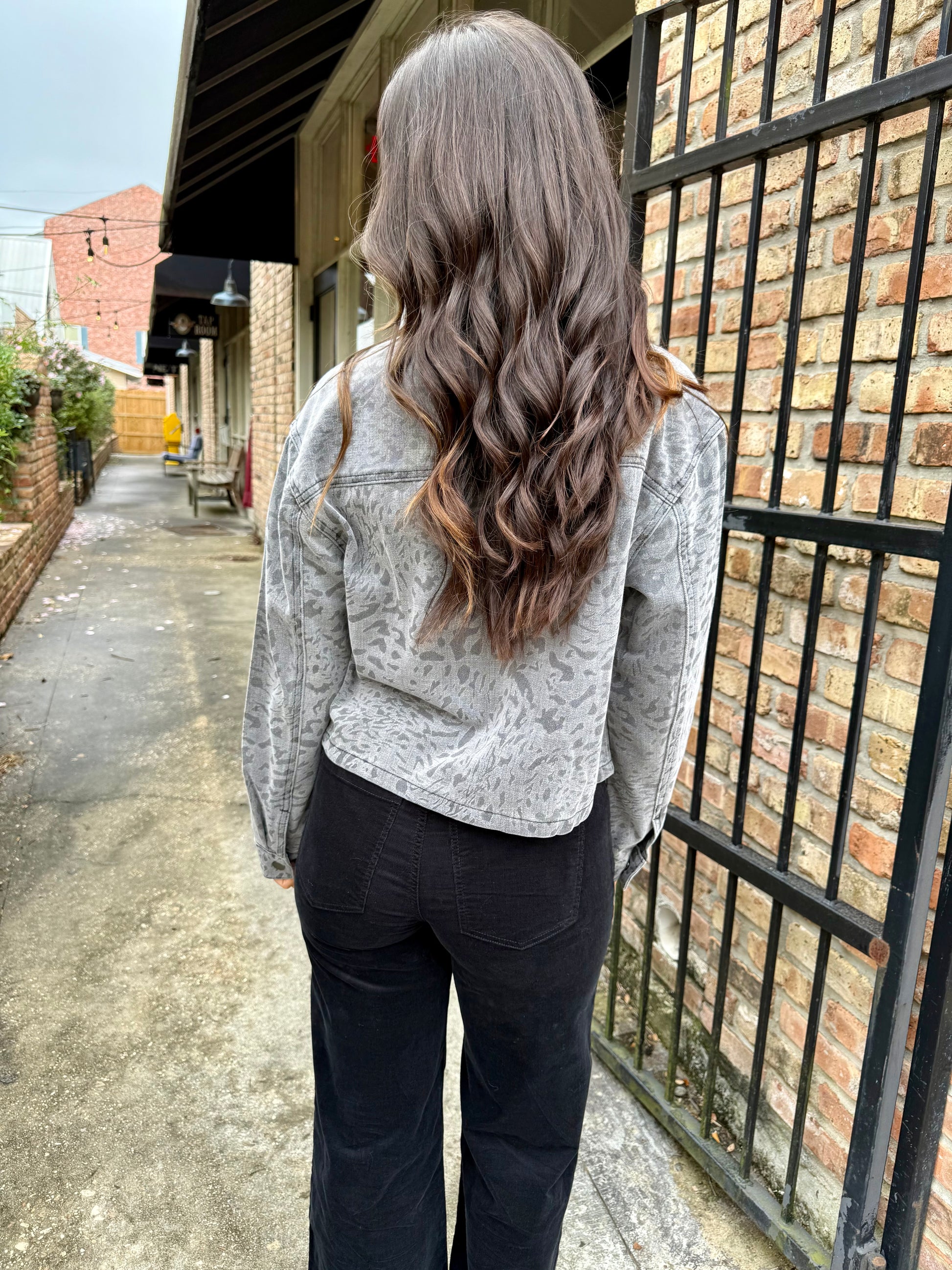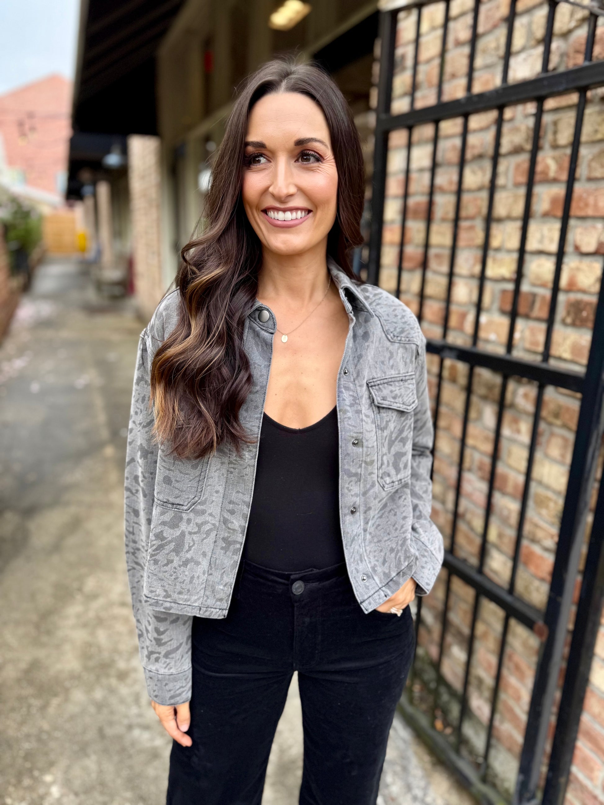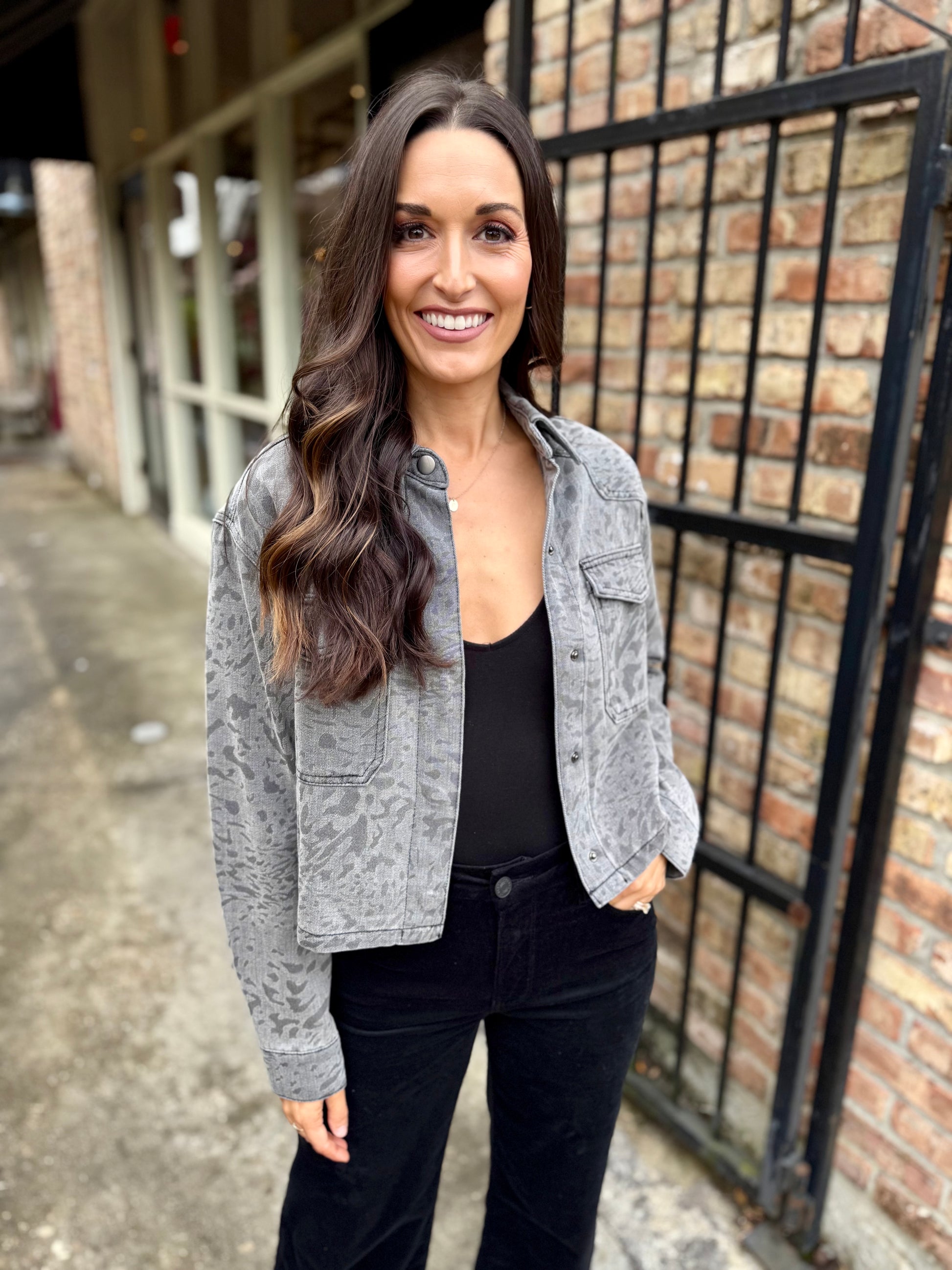 Wild meets wearable. This animal print jacket in a cool grey shade brings attitude to your outerwear with flap patch pockets, a crisp button-front closure, and just the right amount of stretch for all-day ease. Equal parts fierce and functional — your layering game just leveled up.