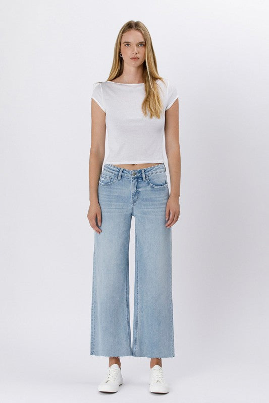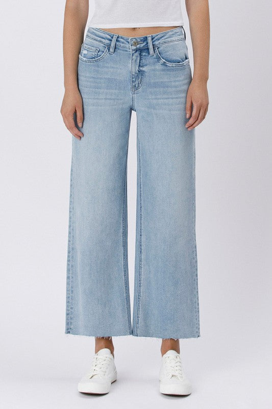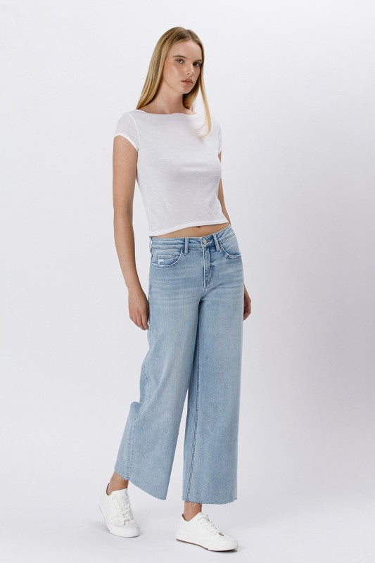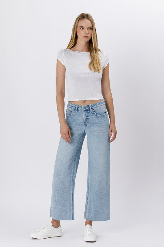 Step into effortless style with the Olivia High Rise Wide Leg Jeans in light blue. Crafted from comfy stretch denim, these jeans hug your waist while giving you room to move with their wide-leg cut. The clean raw hem and cropped length add a trendy twist, perfect for showing off your favorite shoes. Whether you're dressing up or keeping it casual, these jeans bring playful charm to any outfit.