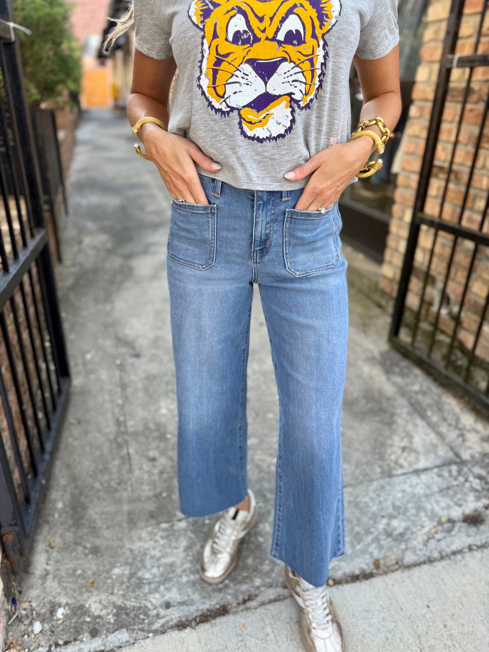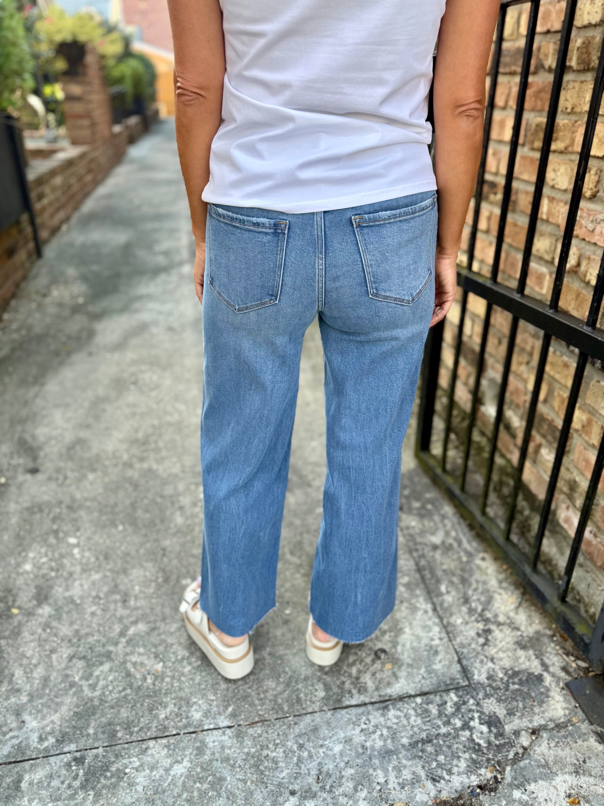 Step into effortless style with the Olivia High Rise Wide Leg Jeans in blue. Crafted from comfy stretch denim, these jeans hug your waist while giving you room to move with their wide-leg cut. The clean raw hem and cropped length add a trendy twist, perfect for showing off your favorite shoes. Whether you're dressing up or keeping it casual, these jeans bring playful charm to any outfit.