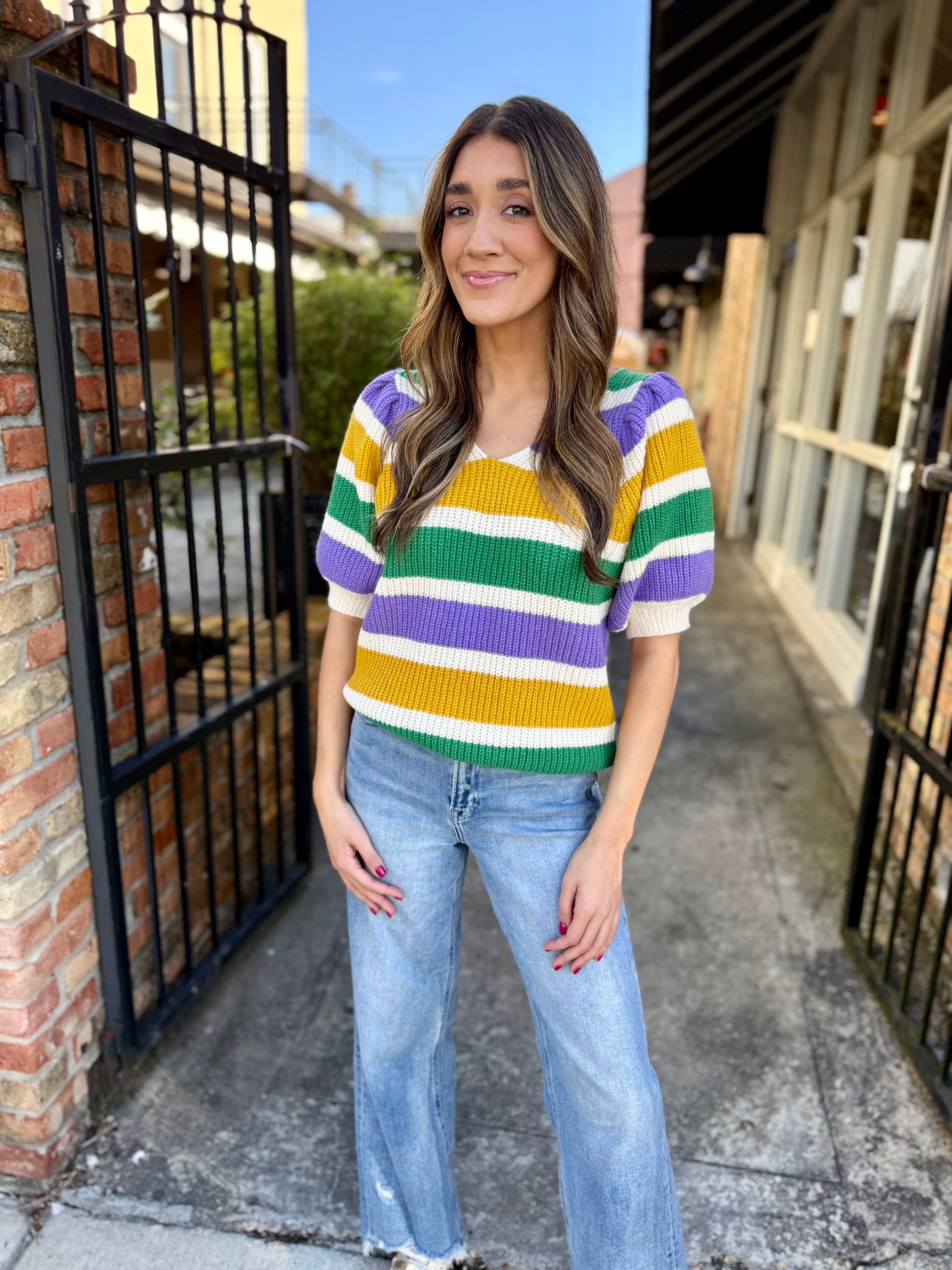 Get ready to turn heads at every celebration with this vibrant Mardi Gras-inspired sweater! Featuring bold stripes in classic carnival colors and statement puffy sleeves that demand attention, this V-neck top brings flair to your wardrobe. The playful design captures the spirit of the season while the comfortable knit fabric keeps you cozy. Perfect for parades, parties, or anyone who loves to celebrate in style. Make every moment feel like a festival!