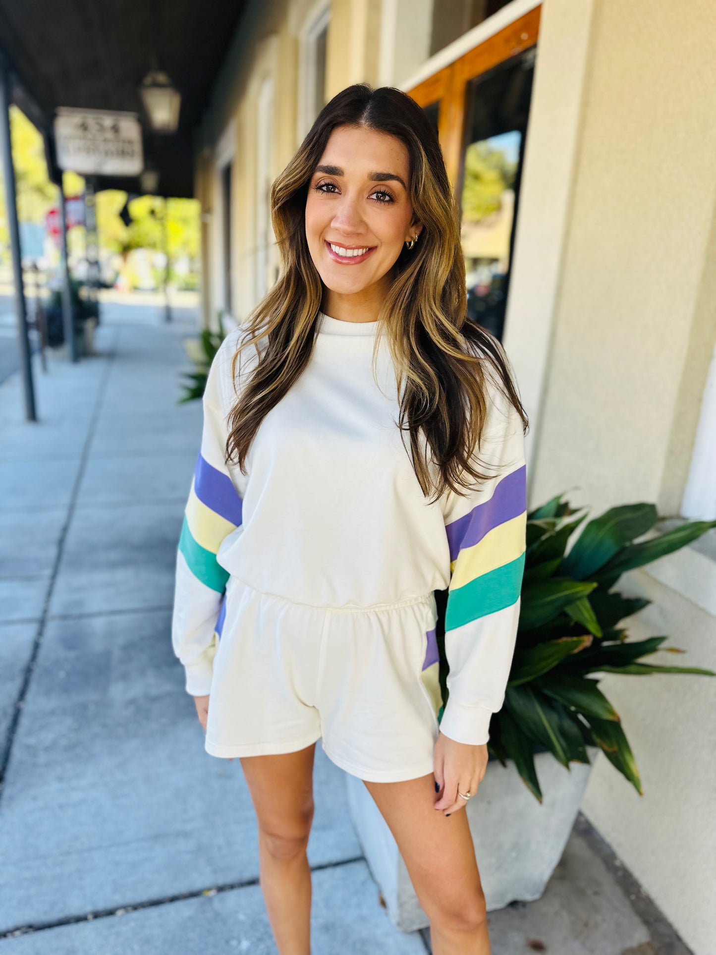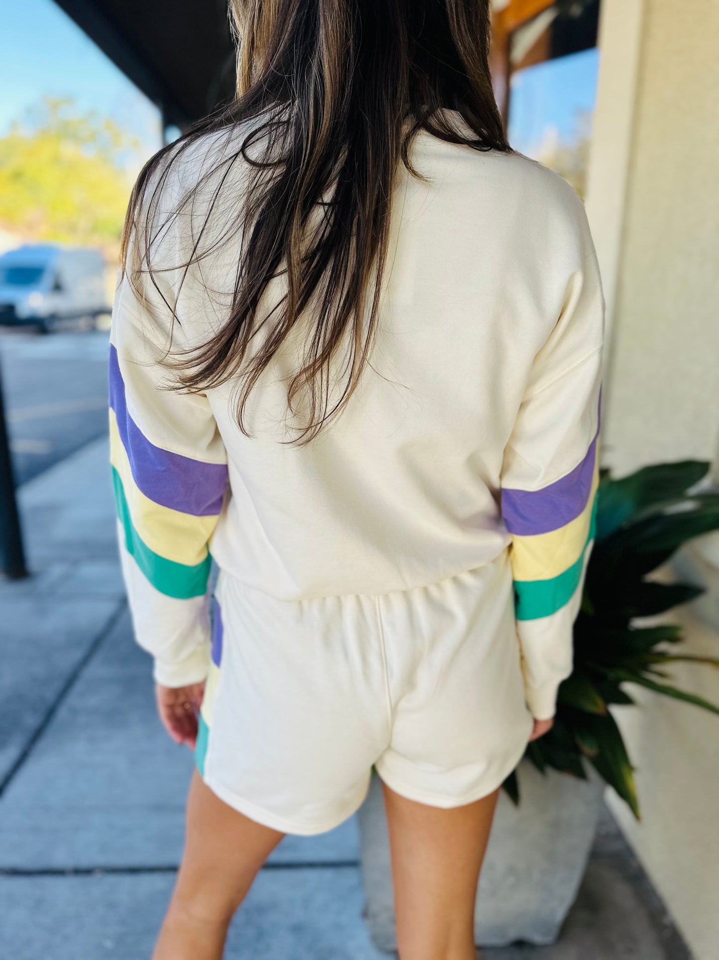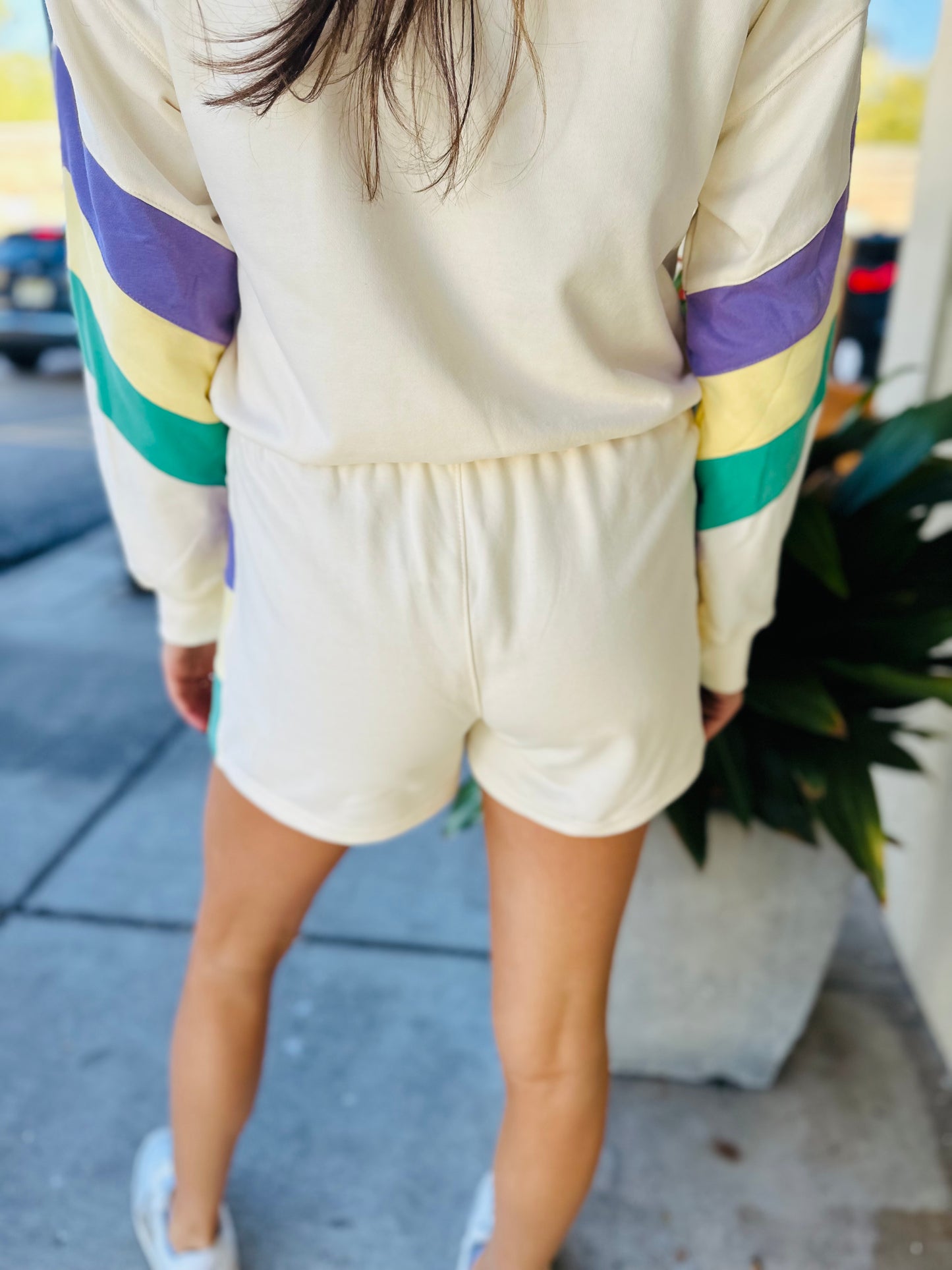 Stay on-trend with our Pastel Stripe Shorts (add the matching sweatshirt)! Its lightweight feel, make it perfect for any occasion. Get yours now before we sell out! Not just for Mardi Gras, wear it anytime!