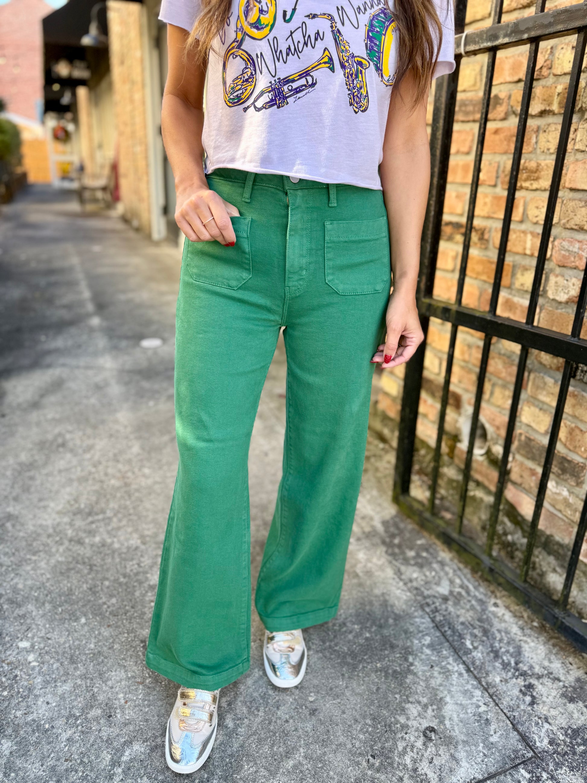 A trendy wide-leg jean with front patch pockets. With a high-rise waist and subtle flare through the leg, this wardrobe staple will take you through sandal season and back to boots in the fall without missing a beat. In a medium denim wash.