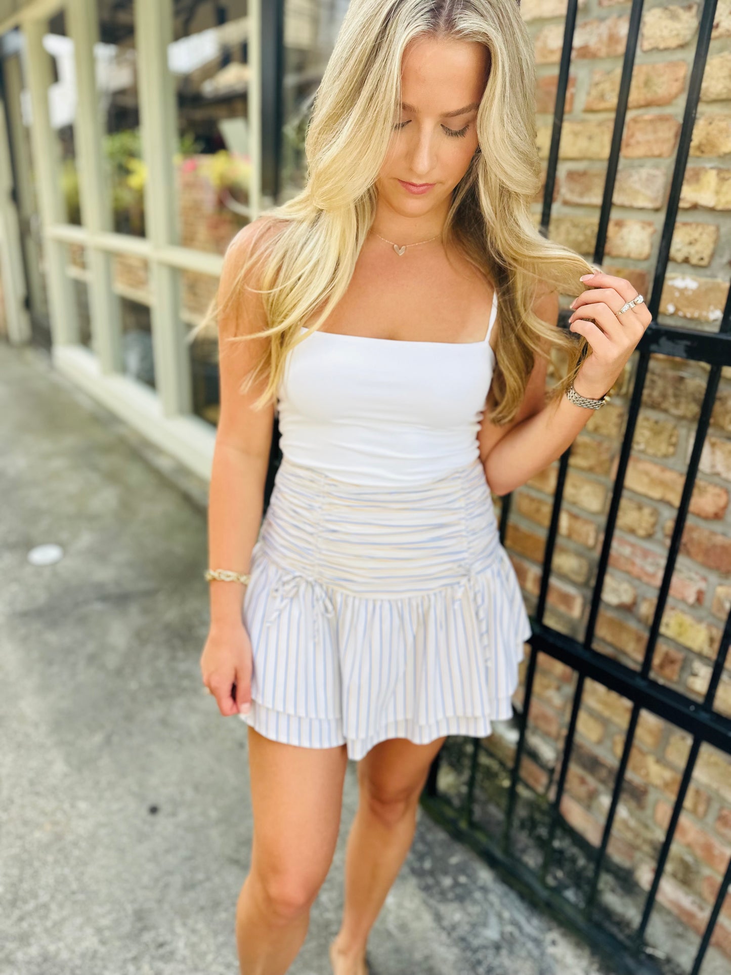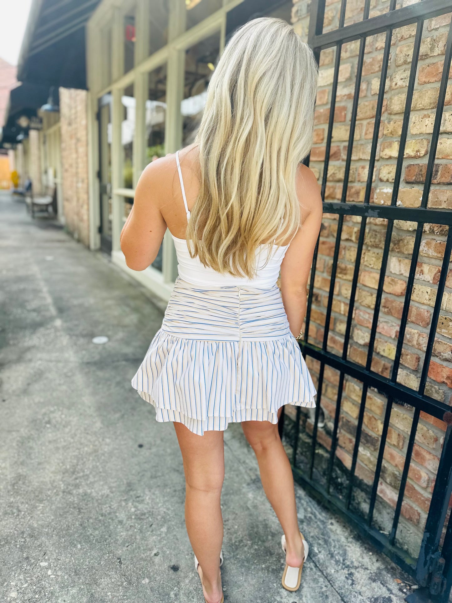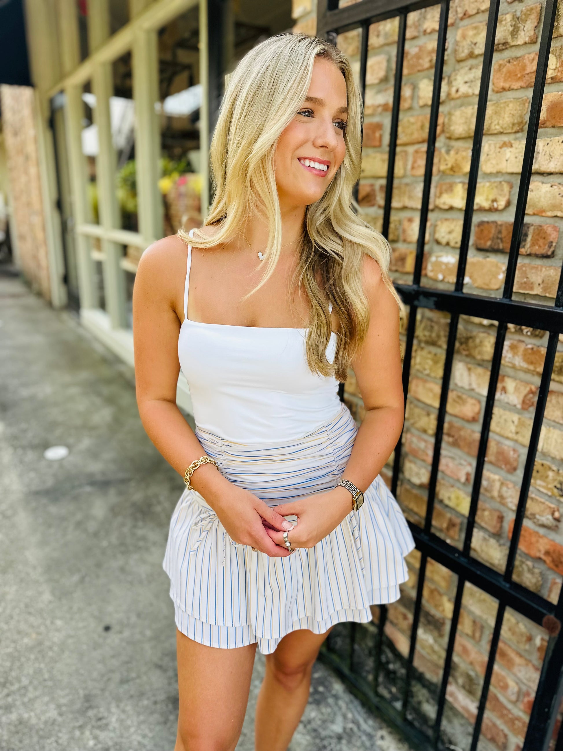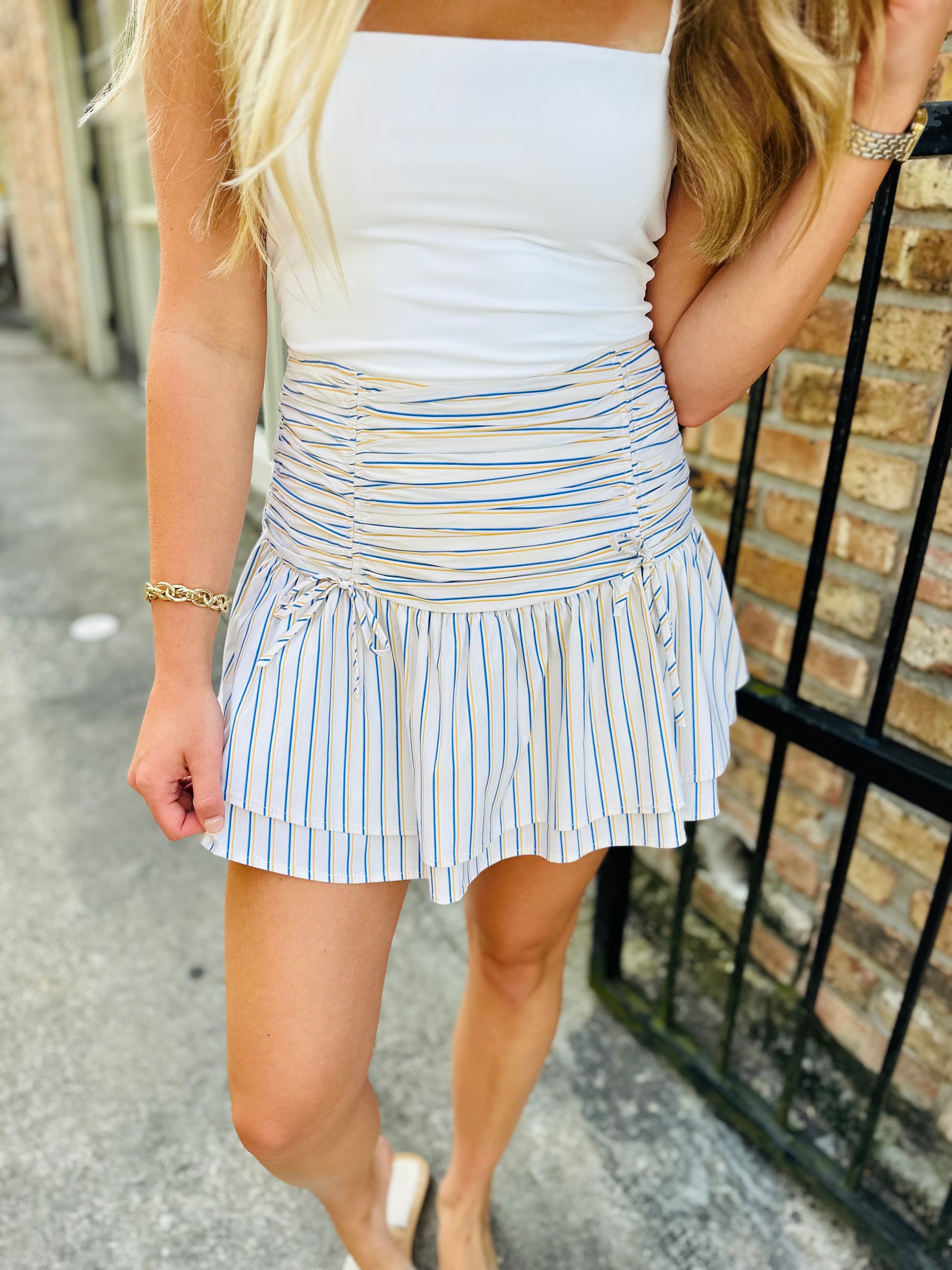 Add a splash of sunshine to your wardrobe with the Paul Striped Mini Skort in Lemon Multi. Featuring a playful striped pattern, a flirty ruffle hem, and a chic tie detail, this skort combines the ease of shorts with the style of a skirt. Perfect for sunny days and casual outings, it offers comfort and a fun, feminine vibe that’s sure to turn heads.