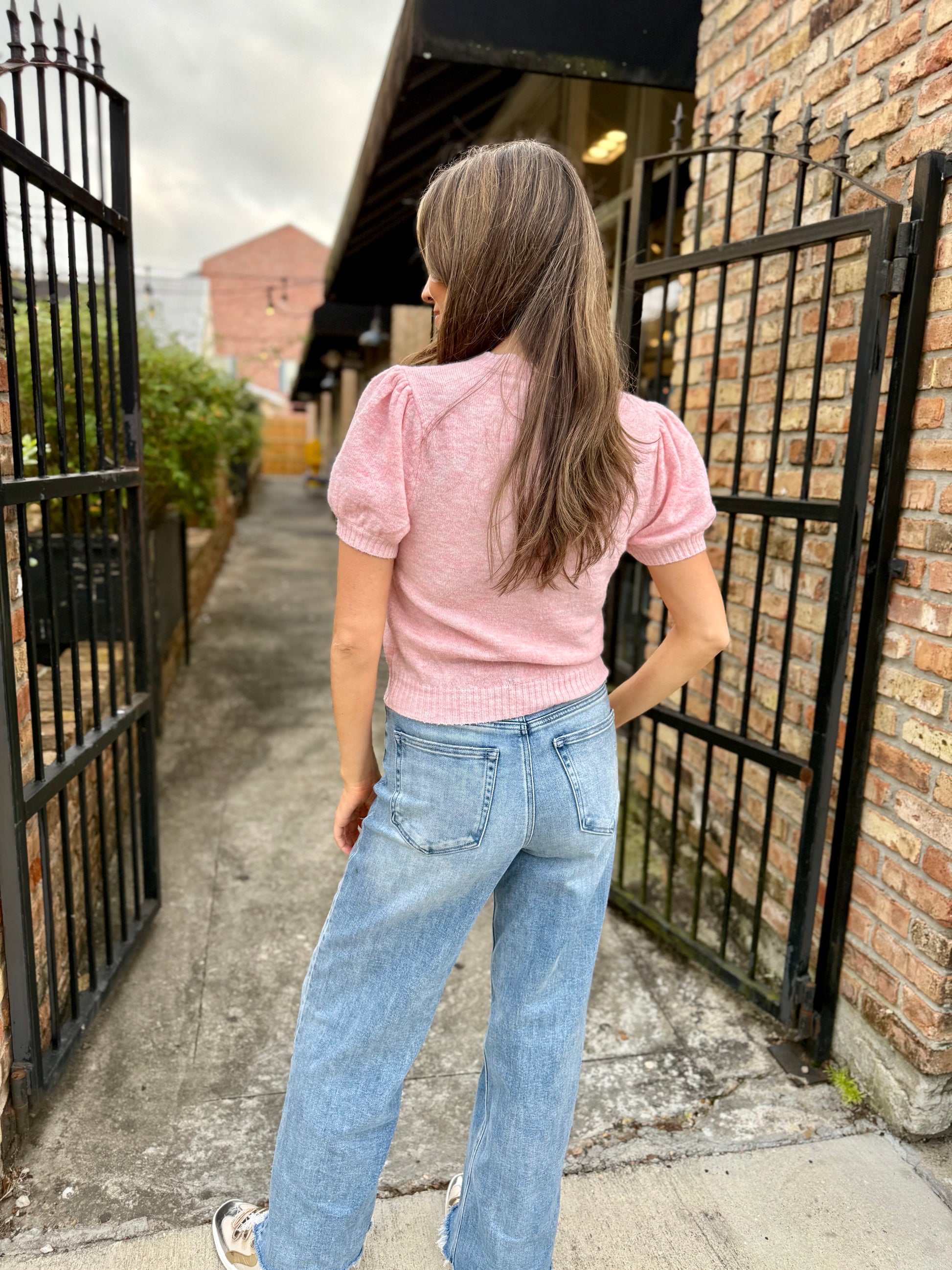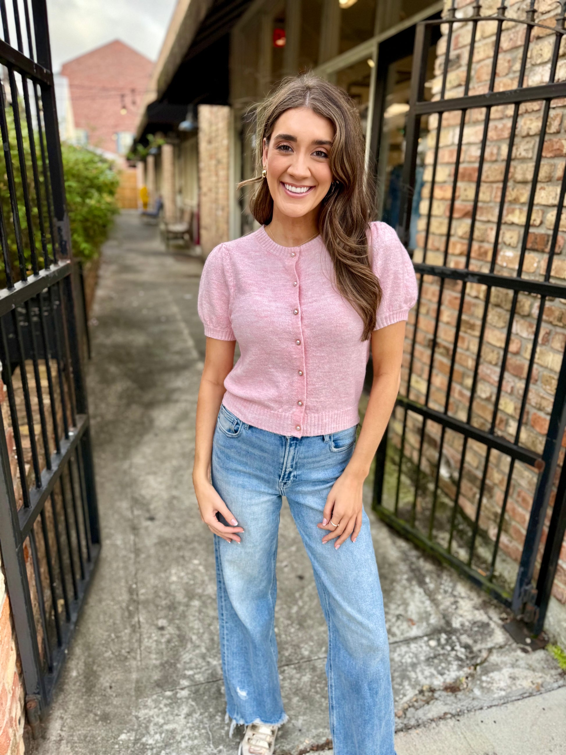 Effortlessly chic and oh-so-cozy, the Peter Cardigan Top in light pink is your new go-to layer. This short-sleeve crew neck knit sweater strikes the perfect balance between polished and relaxed—dress it up with a skirt or keep it casual with your favorite basics. The soft, breathable fabric feels as good as it looks, making it ideal for transitional weather or layering year-round.