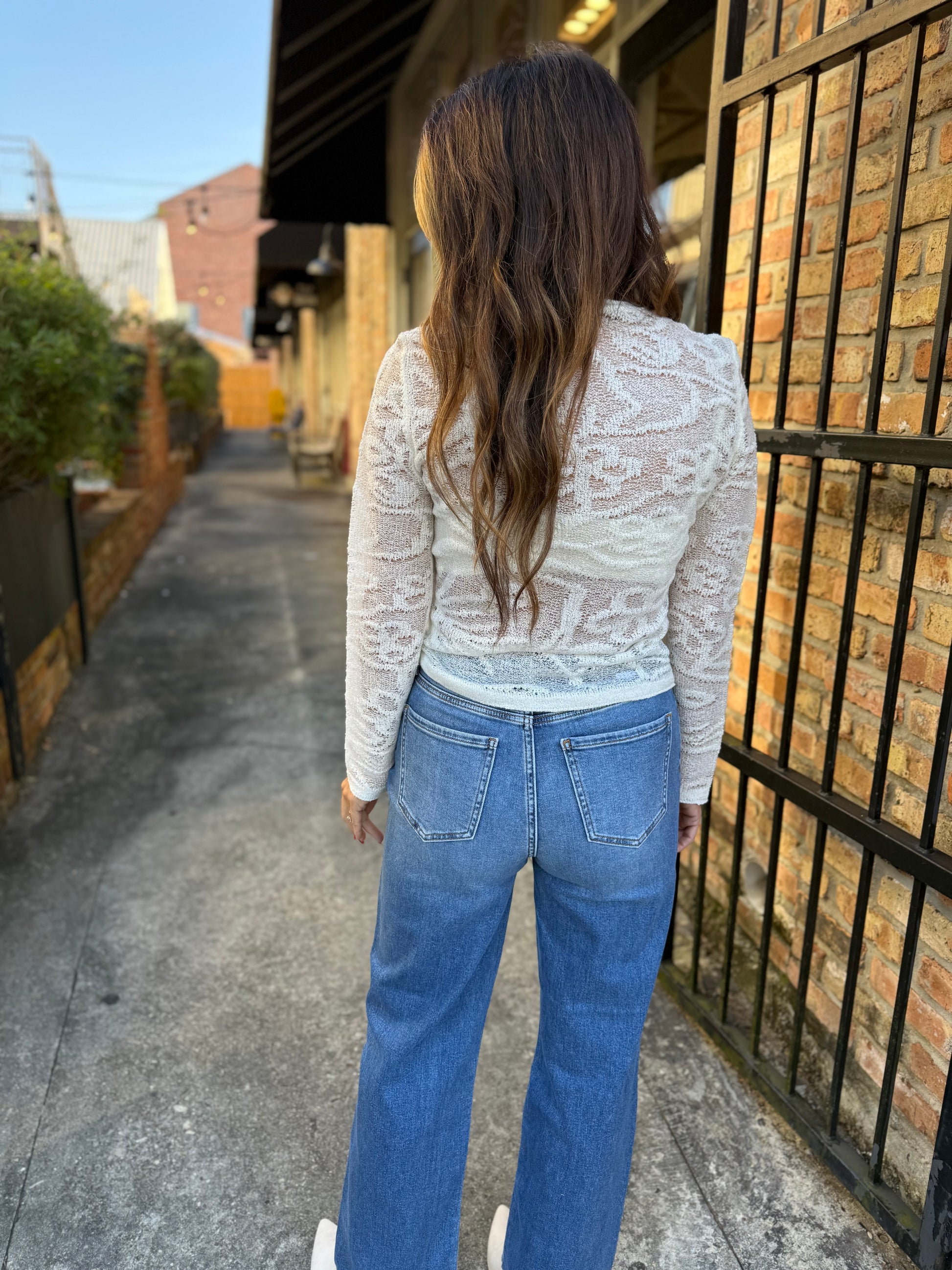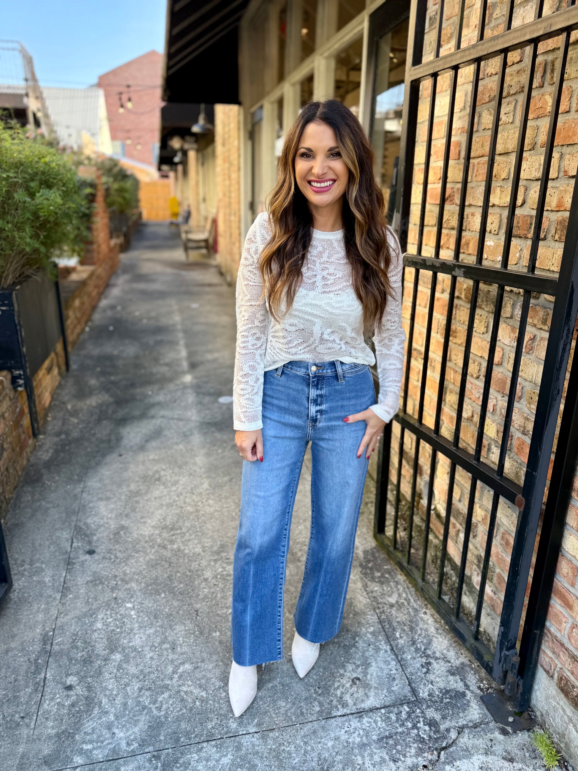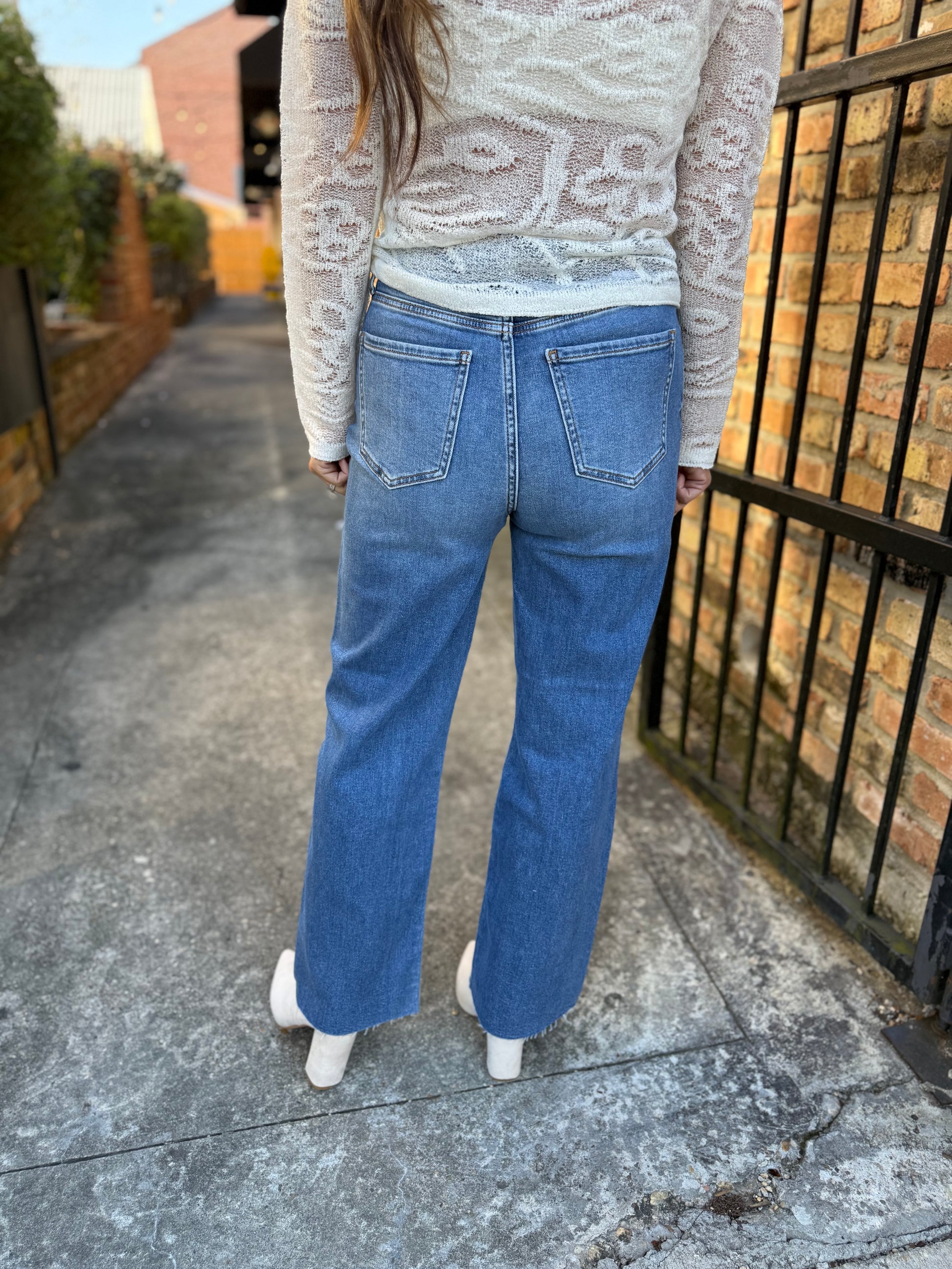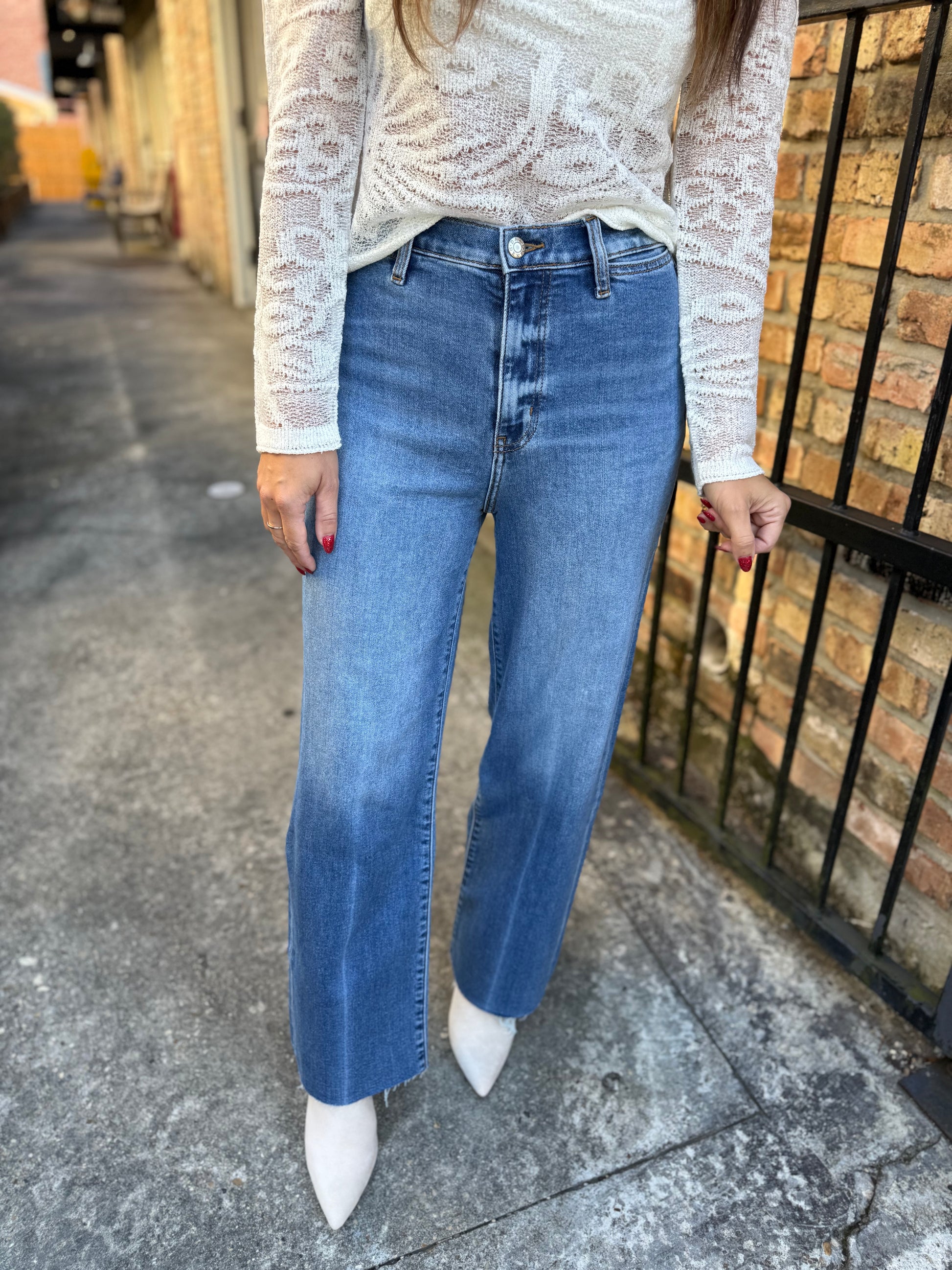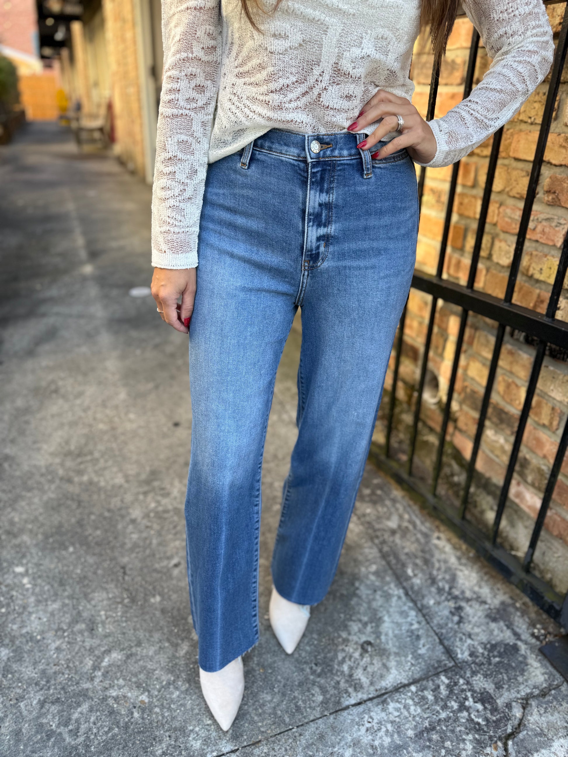 The Pleaser in Indigo Wave is our tried and true high rise wide ankle in a dark blue indigo with soft fading. Constructed from our Hug fabric, this jean is flexible enough to hug your body, yet heavy enough to cinch you in.