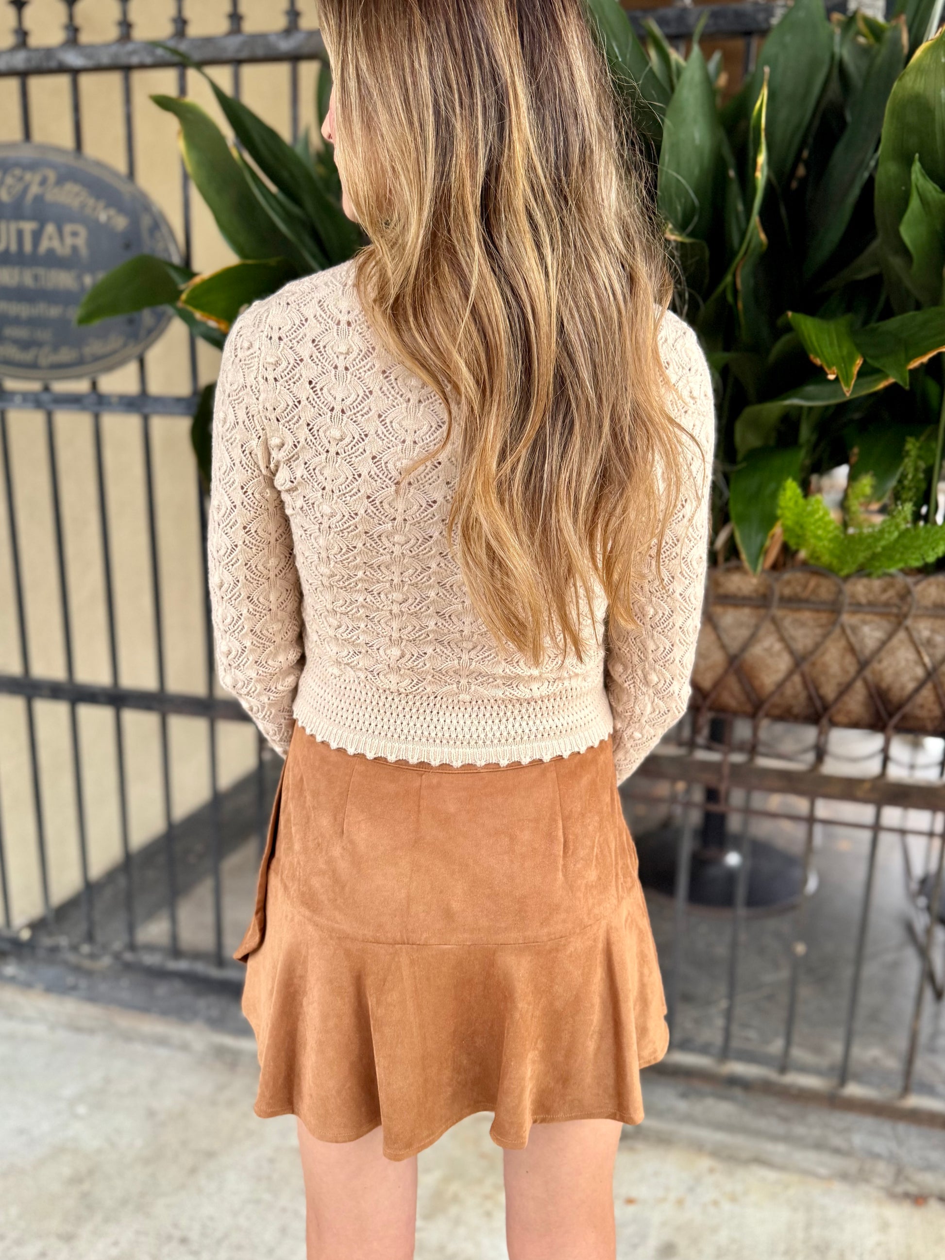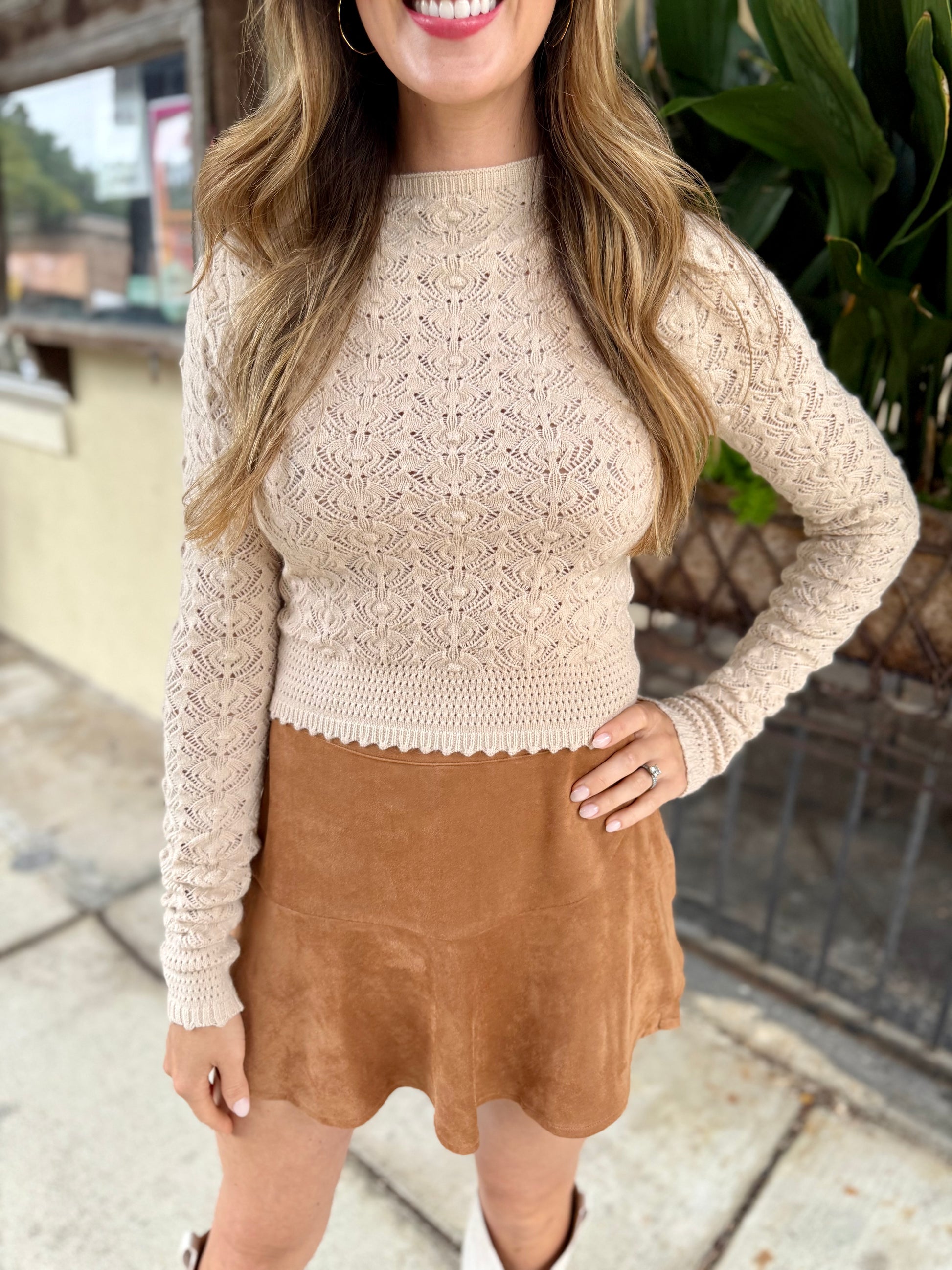 Add a playful twist to your wardrobe with our Polly Pointelle Knit Sweater. Its charming detailed texture and delicate knit pattern bring artisanal flair to your look, while the snug fit highlights your natural shape in the most flattering way. Perfect for those in-between weather days, this sweater keeps you cozy without sacrificing style—making every outfit effortlessly chic and comfortable.
