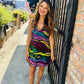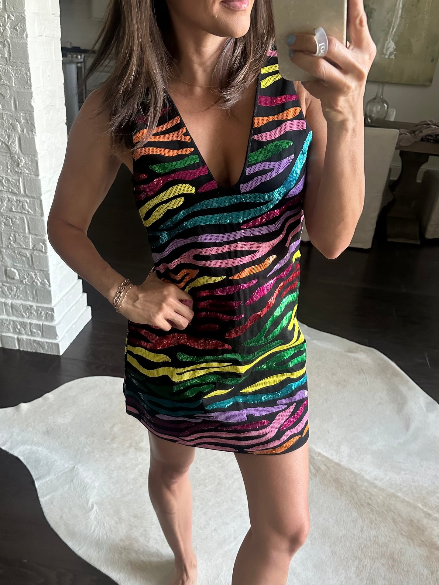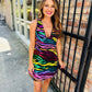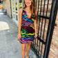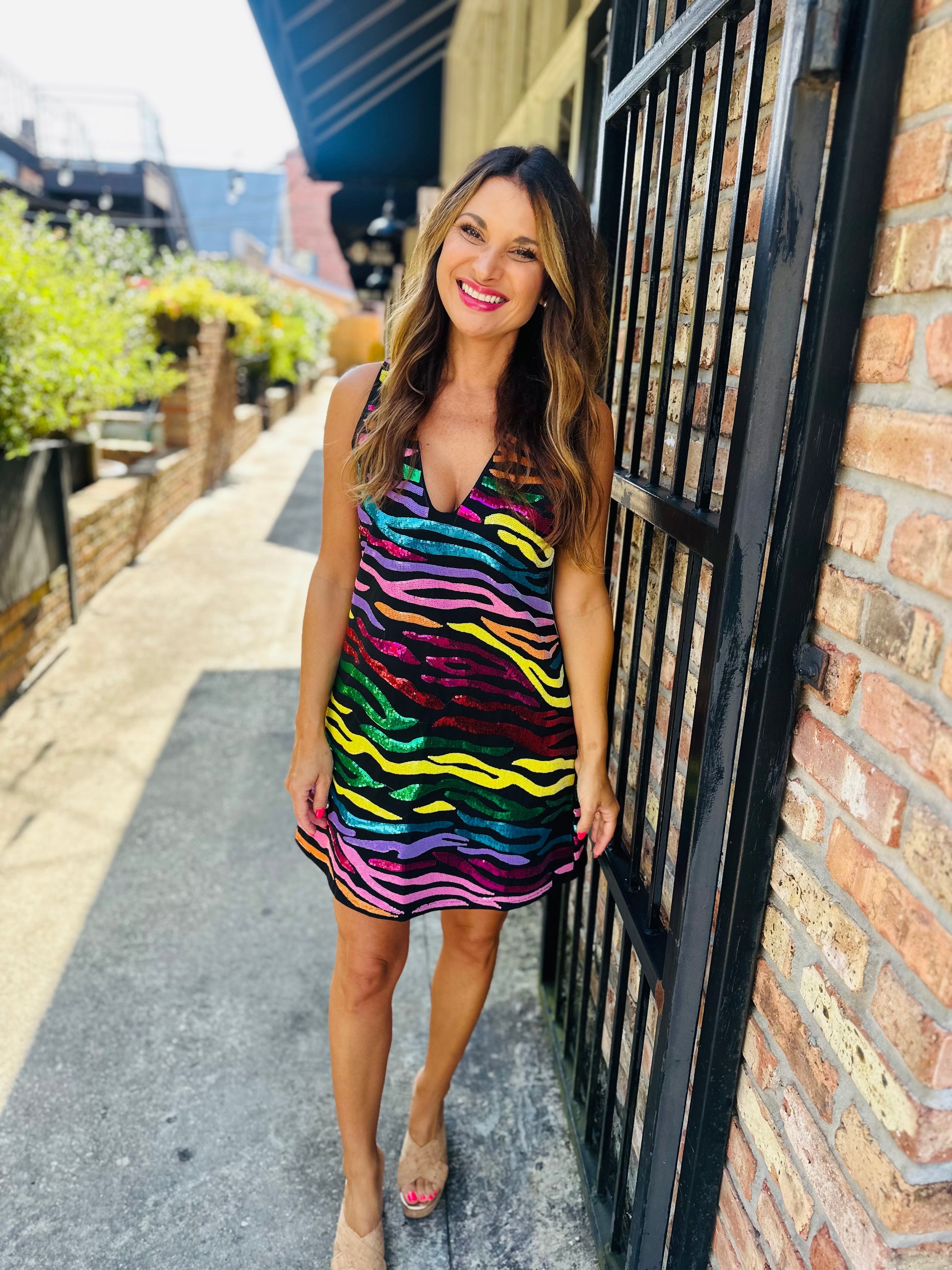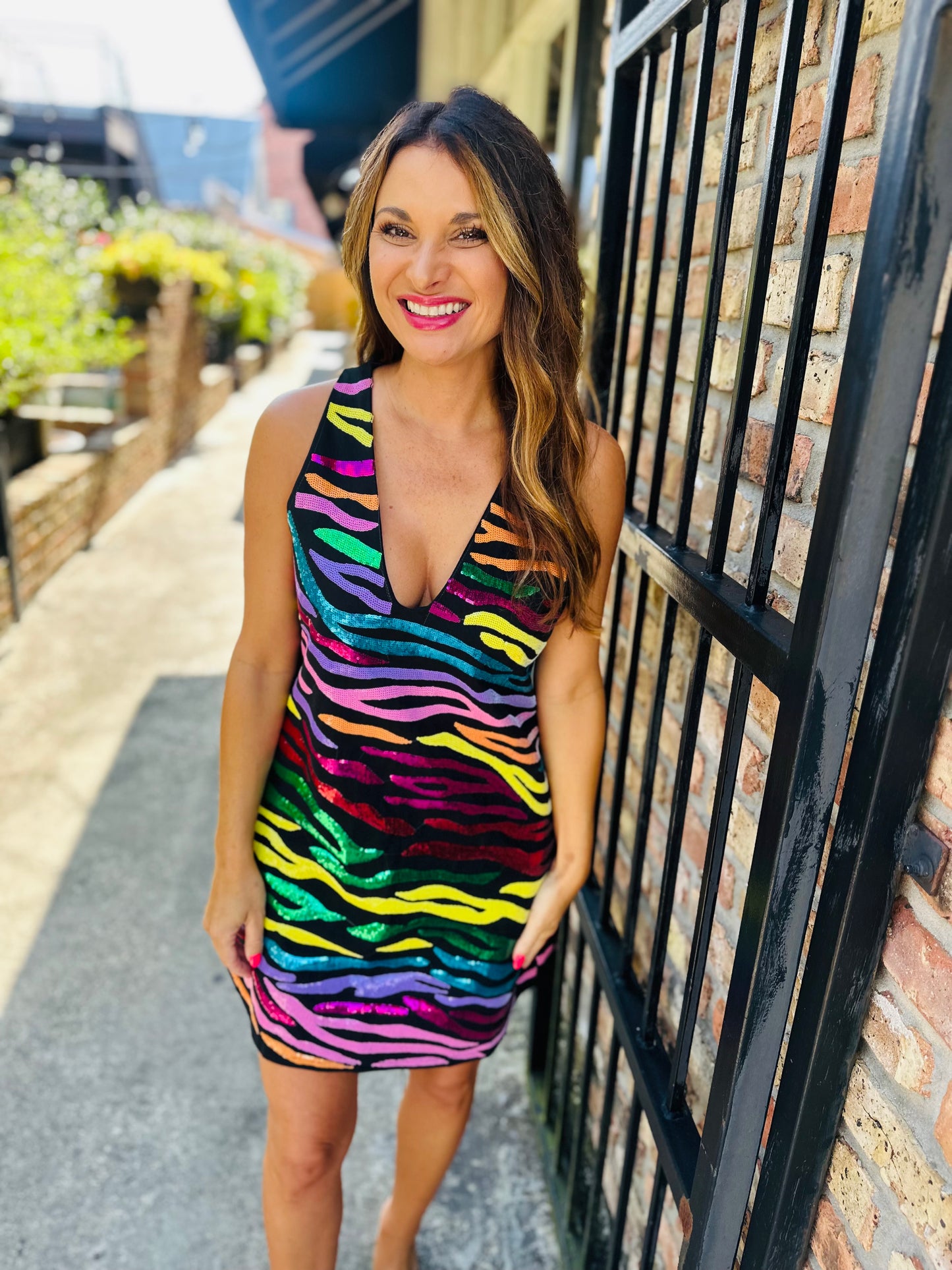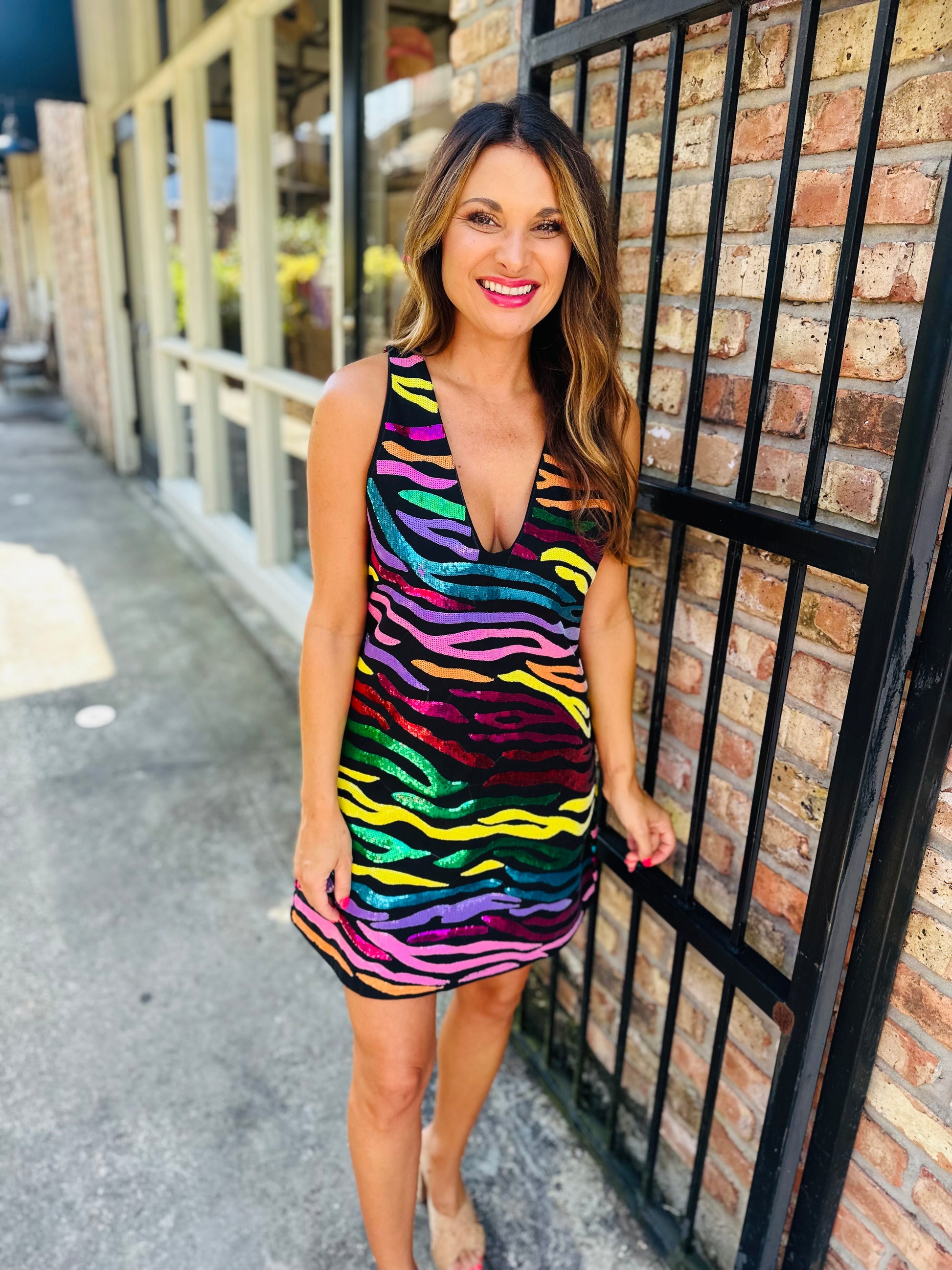 Step out in style and be the Queen of Sparkles with this Rainbow Tiger Denim V Neck Dress. Obsessed with the latest trends? This dress is so fun and perfect for any LSU party. Get ready to shine and turn heads in this must-have piece.