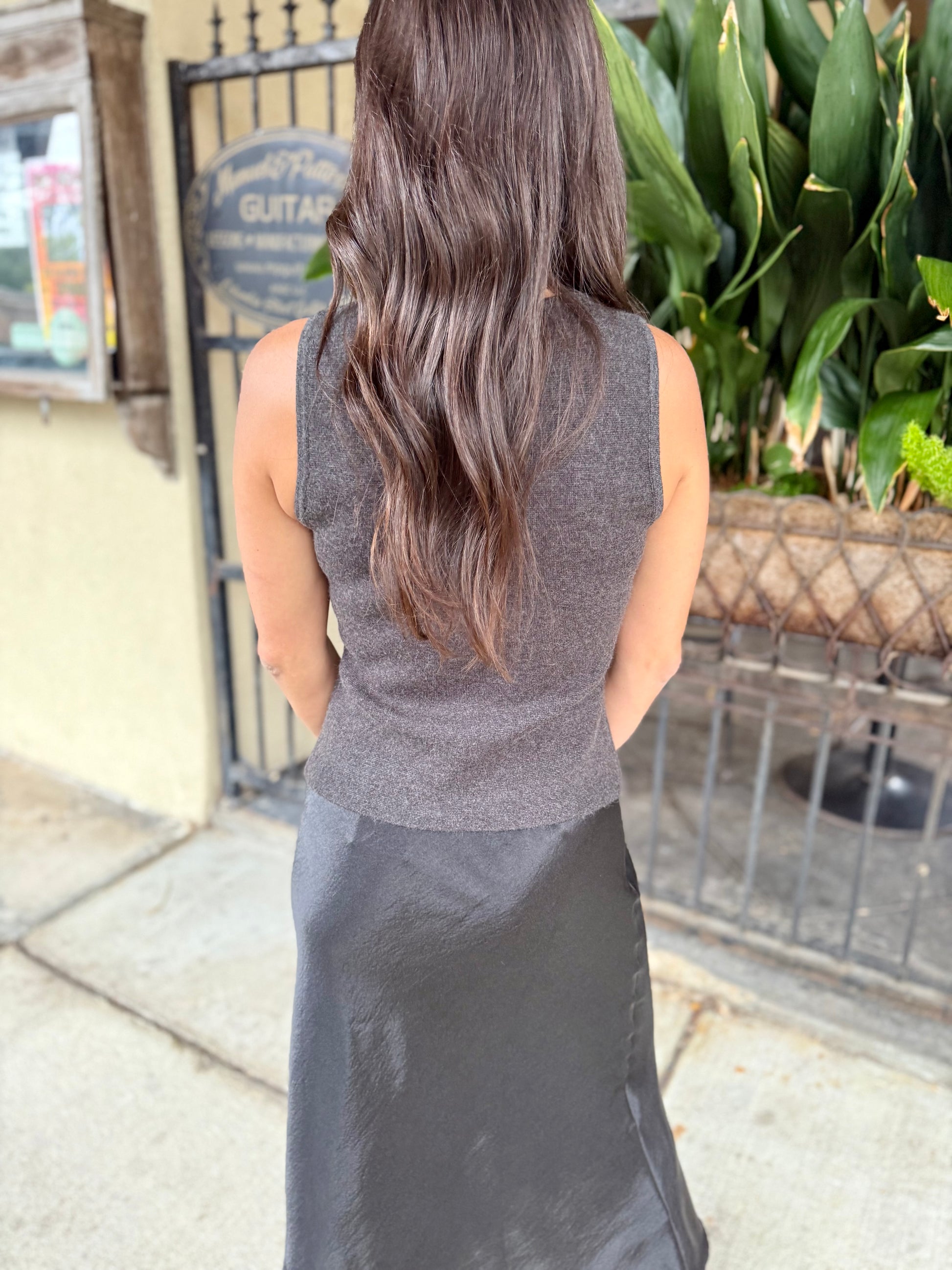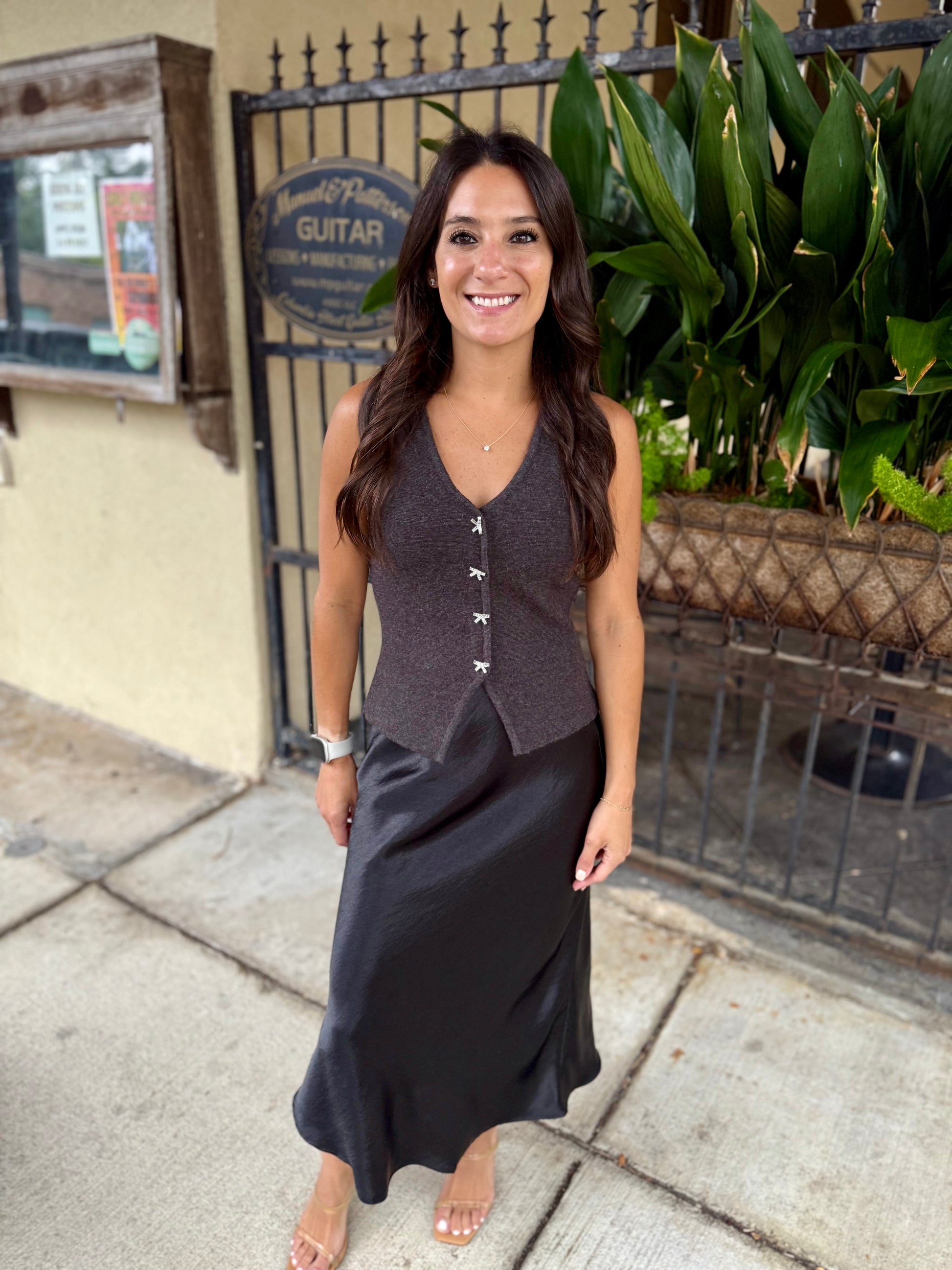Add a sparkly twist to your tops game with this Rhinestone Bow Button Vest in charcoal. This cozy knit sweater vest features charming bow-shaped buttons adorned with rhinestones, bringing holiday cheer to your outfit. Perfect for festive gatherings or everyday sparkle, it pairs effortlessly with dressy shorts or pants to cheer up your look with playful elegance.