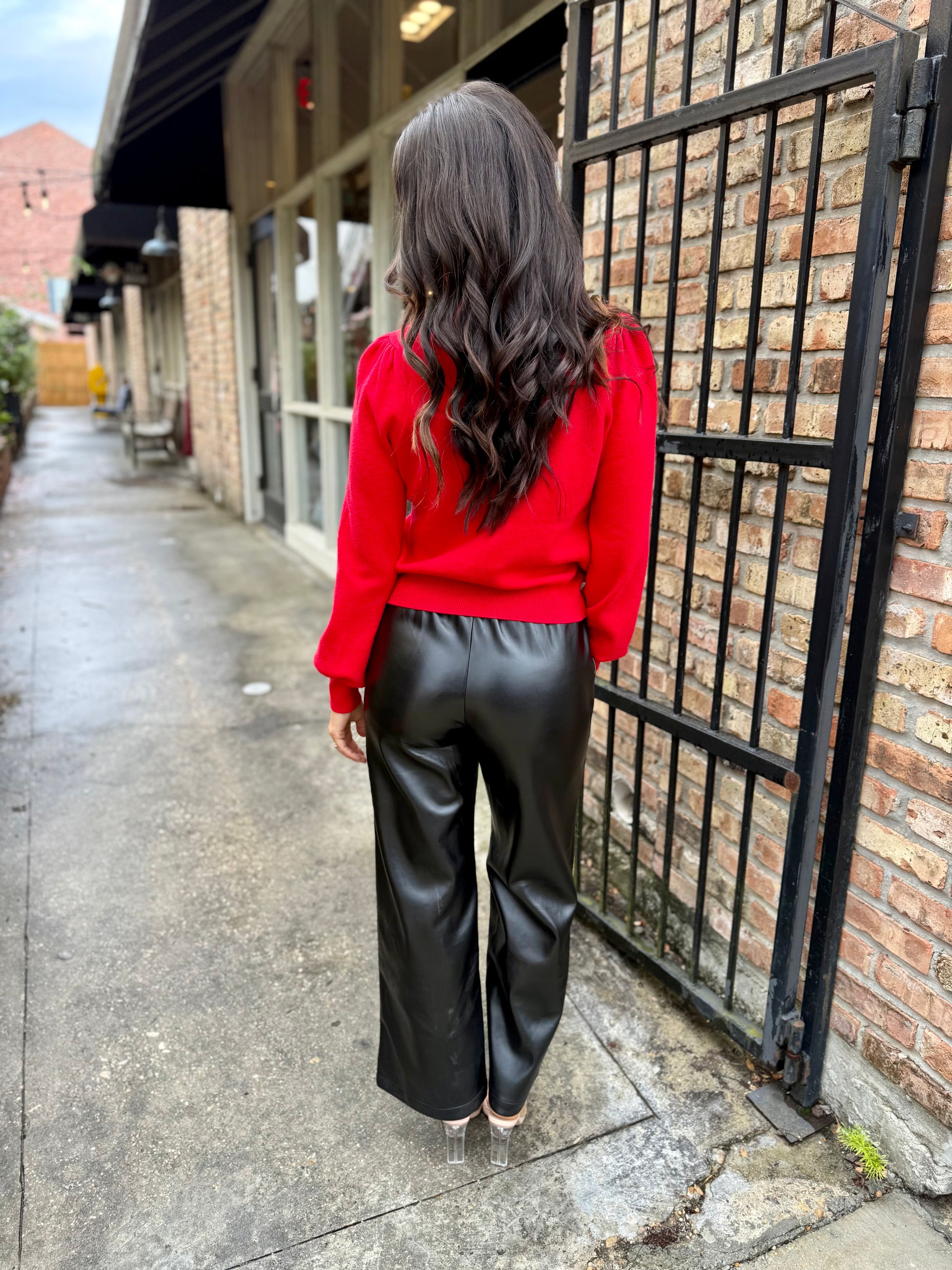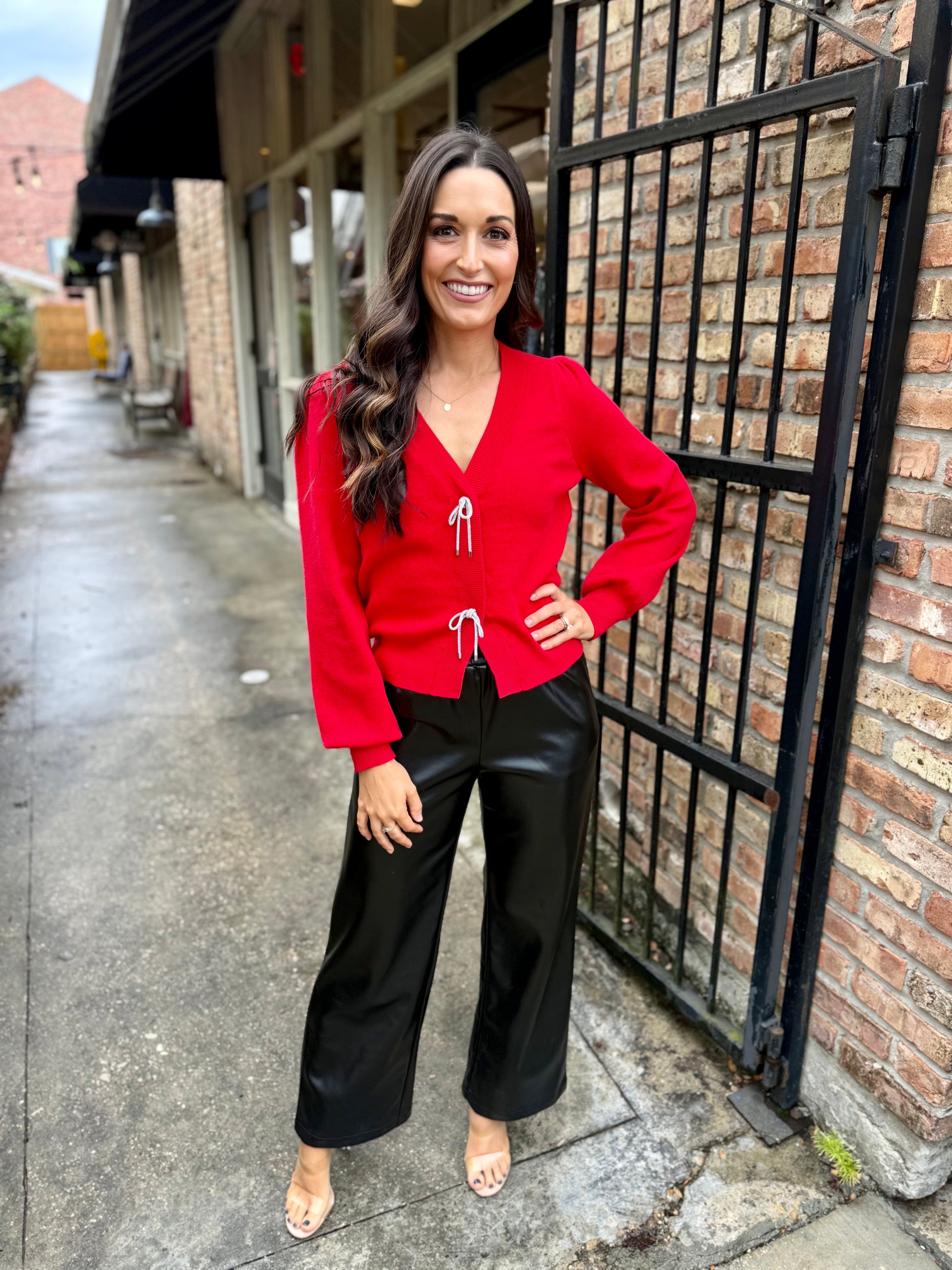 Wrap yourself in pure elegance with this stunning red cardigan that's equal parts sophisticated and fun. The rhinestone bow accents catche the light beautifully, making it perfect for adding a sparkly finishing touch to your wardrobe. Whether you're dressing up for a special occasion or elevating your everyday look, this cardigan delivers sweetness and style in one irresistible package.