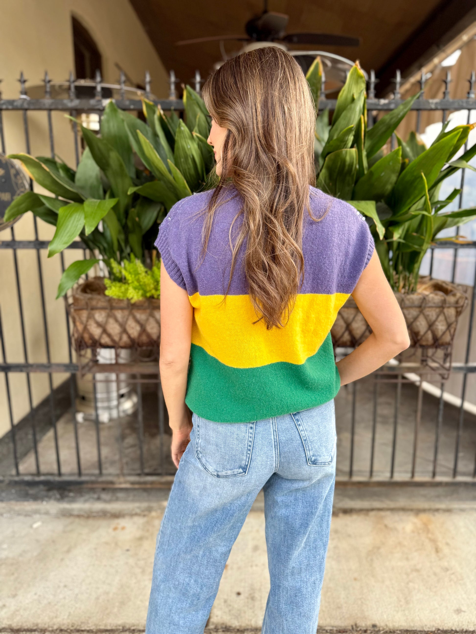 Celebrate in style with this dazzling Mardi Gras sweater vest that brings the party wherever you go. Featuring eye-catching sequinS and festive purple, green, and gold stripes, this piece sparkles with every move. Perfect for holiday gatherings, themed events, or anyone ready to add some glittery glamour to their wardrobe. Layer it over your favorite tee for an instant statement look that's sure to turn heads and spread the joy.