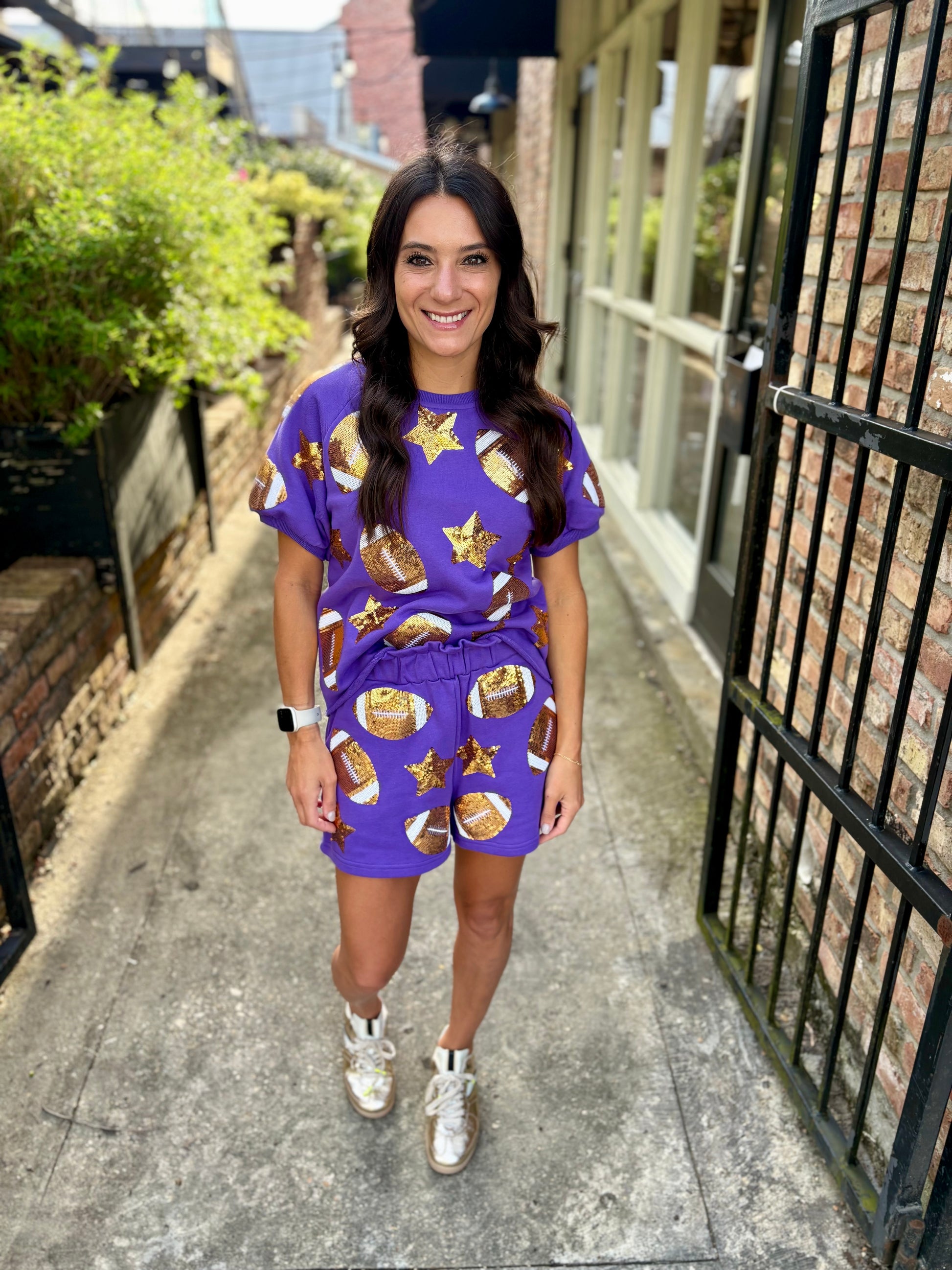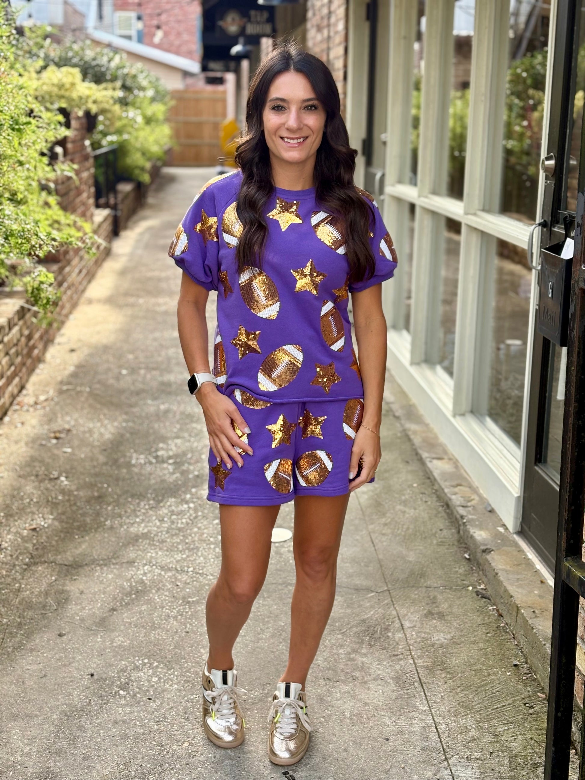Get game day ready with these playful Scattered Football & Stars Shorts in purple! Featuring a fun pattern of footballs and stars, they pair perfectly with the matching Scattered Football & Stars Top for a coordinated look. Comfortable and spirited, these shorts are ideal for cheering on your team in style.