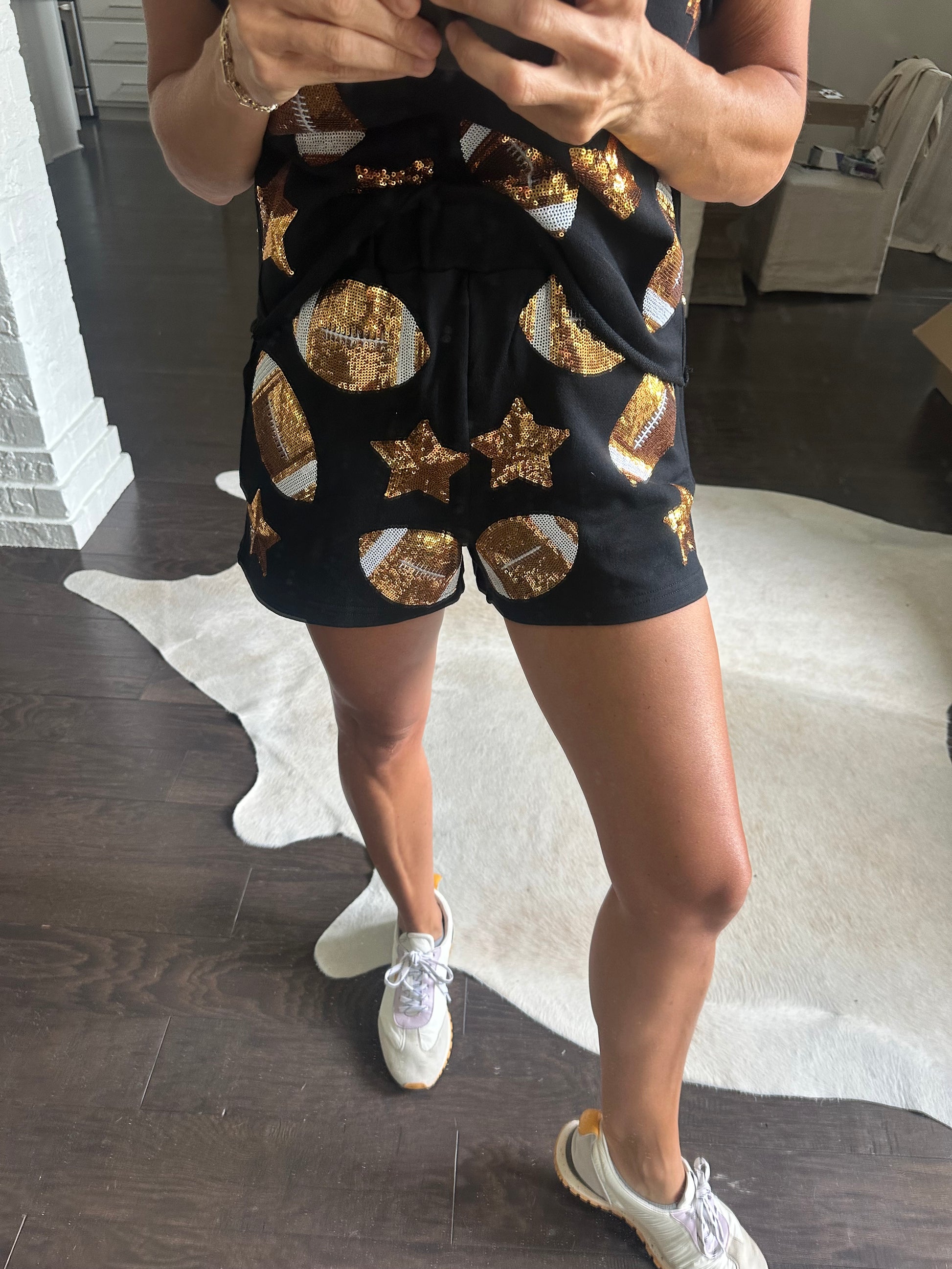 Show your team spirit in style with the Scattered Football & Stars Top in black and gold. Cute paired with denim or make it a set with the matching Scattered Football & Stars Shorts. This playful gameday outfit lets you cheer on the Saints comfortably while turning heads with its fun, sporty design. Ideal for game day or casual wear, it combines spirited flair with easygoing comfort.