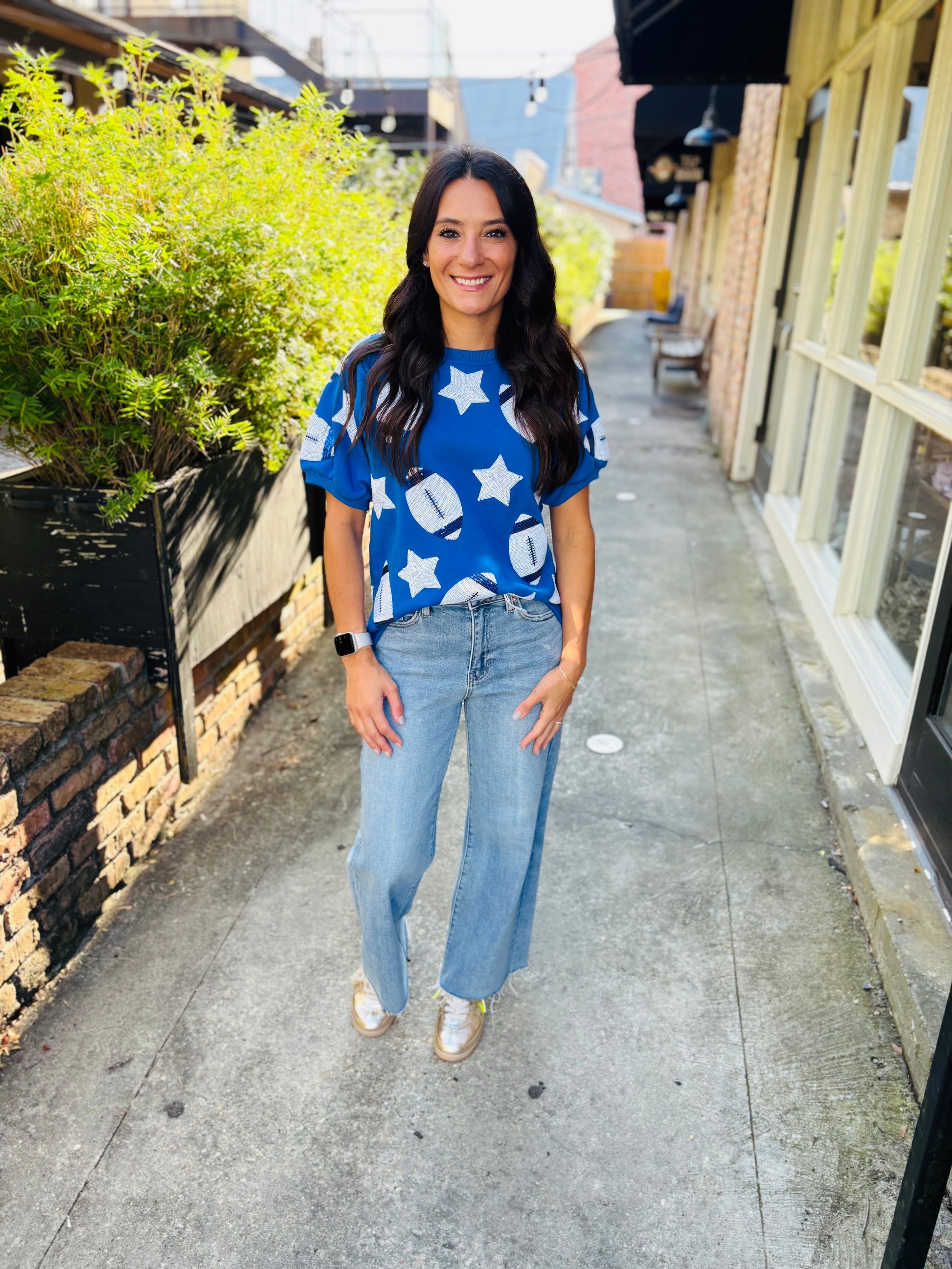 Show your team spirit in style with the Scattered Football & Stars Top in royal and white. It looks cute paired with white denim This playful gameday outfit lets you cheer on favorite team comfortably while turning heads with its fun, sporty design. Ideal for game day or casual wear, it combines spirited flair with easygoing comfort.