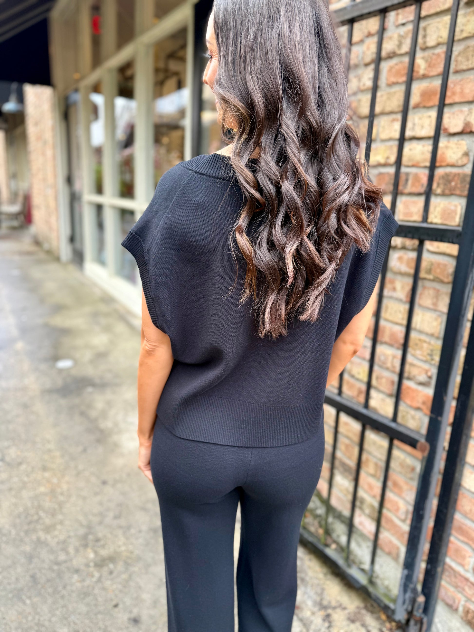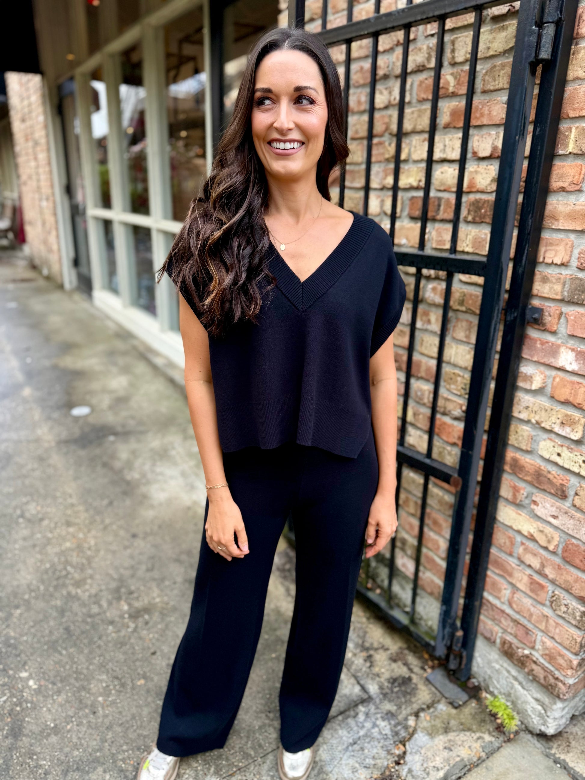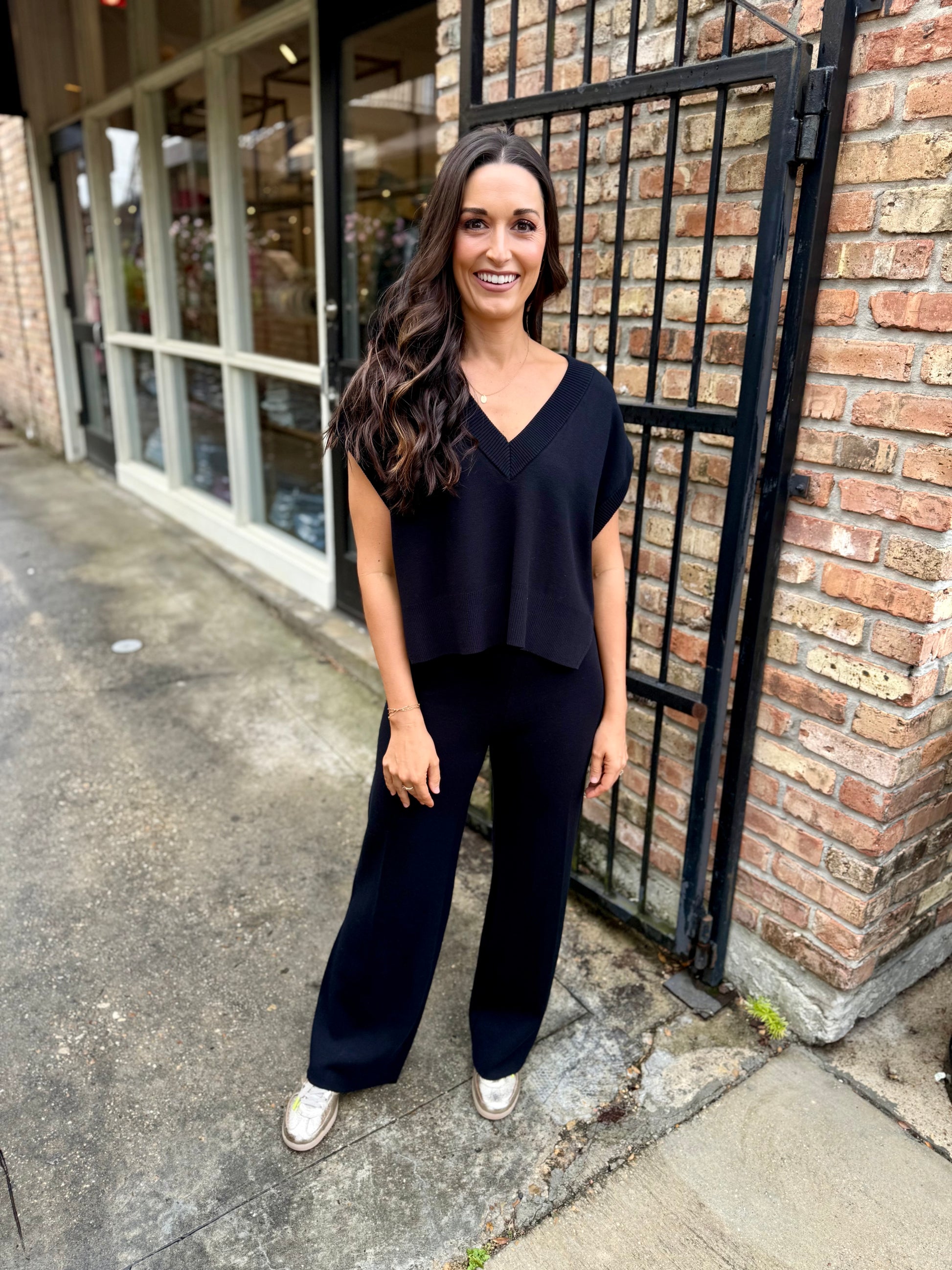 Slip into effortless style with our Stacey Knit Pants in classic black. These cozy bottoms feature a comfortable banded waistline and a sleek straight leg that works with everything in your closet. Pair them with our matching Stacey Knit Vest Top for a coordinated look that's equal parts chic and comfy. Perfect for days when you want to feel put-together without sacrificing comfort.