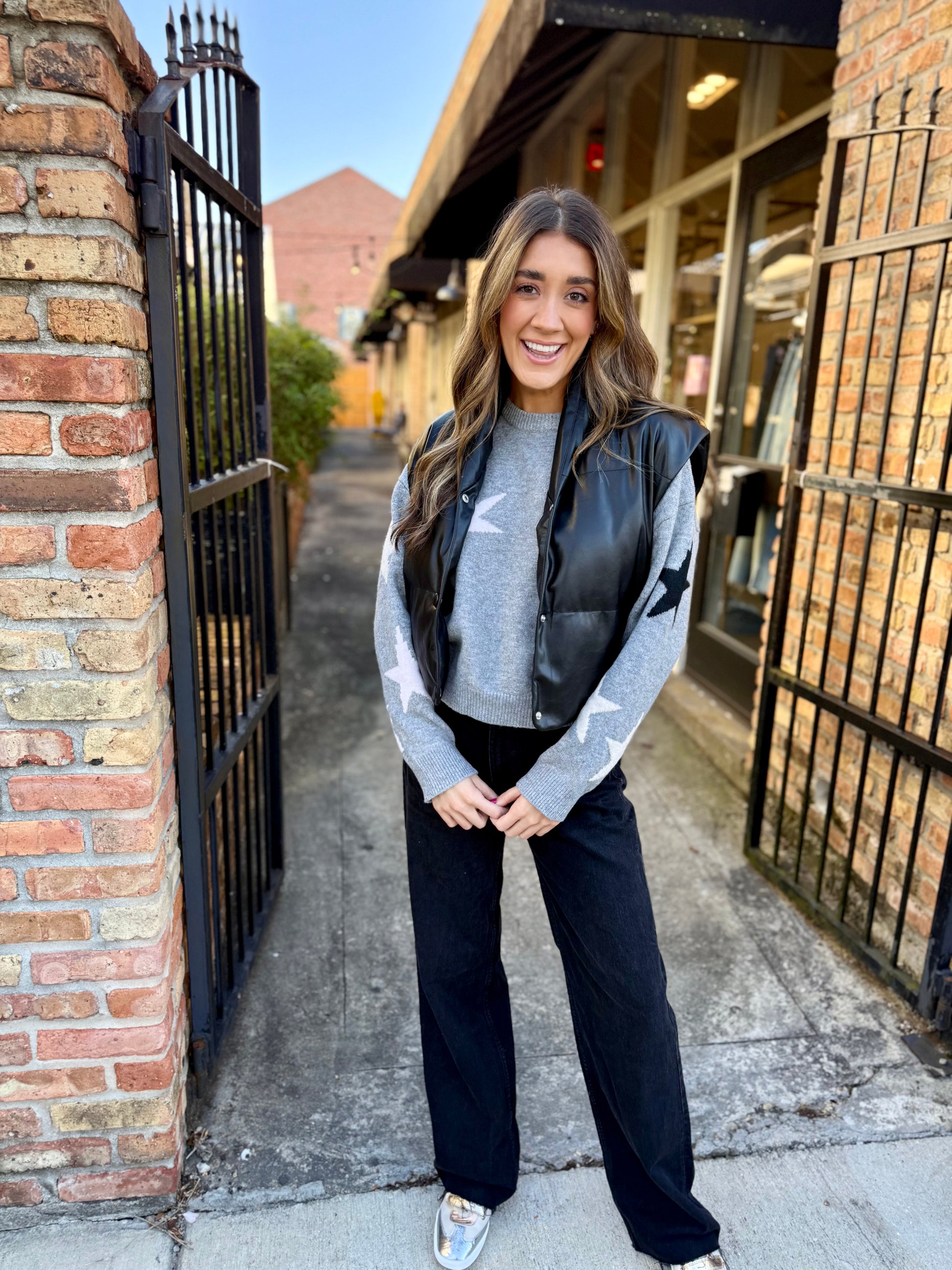 Reach for cozy comfort with this charming Star Knit Sweater in soft heather gray. Featuring an all-over star pattern that adds a whimsical touch to your everyday wardrobe, this knit piece is perfect for layering or wearing solo. The relaxed fit and breathable fabric make it ideal for casual outings, weekend hangouts, or snuggling up at home. A timeless staple that brings a little extra somthing to your style.