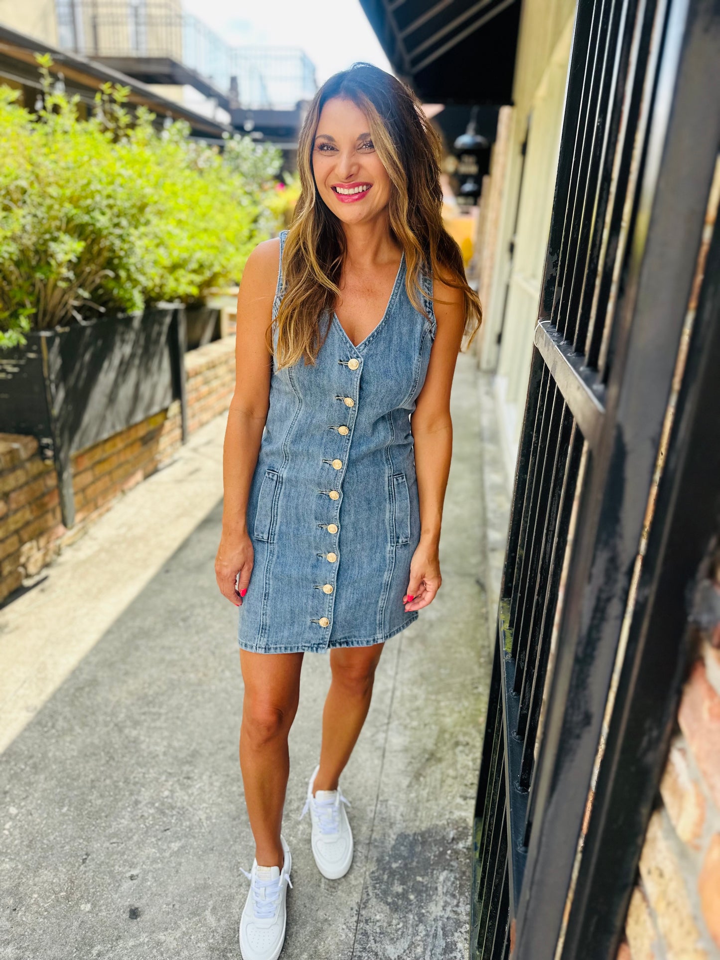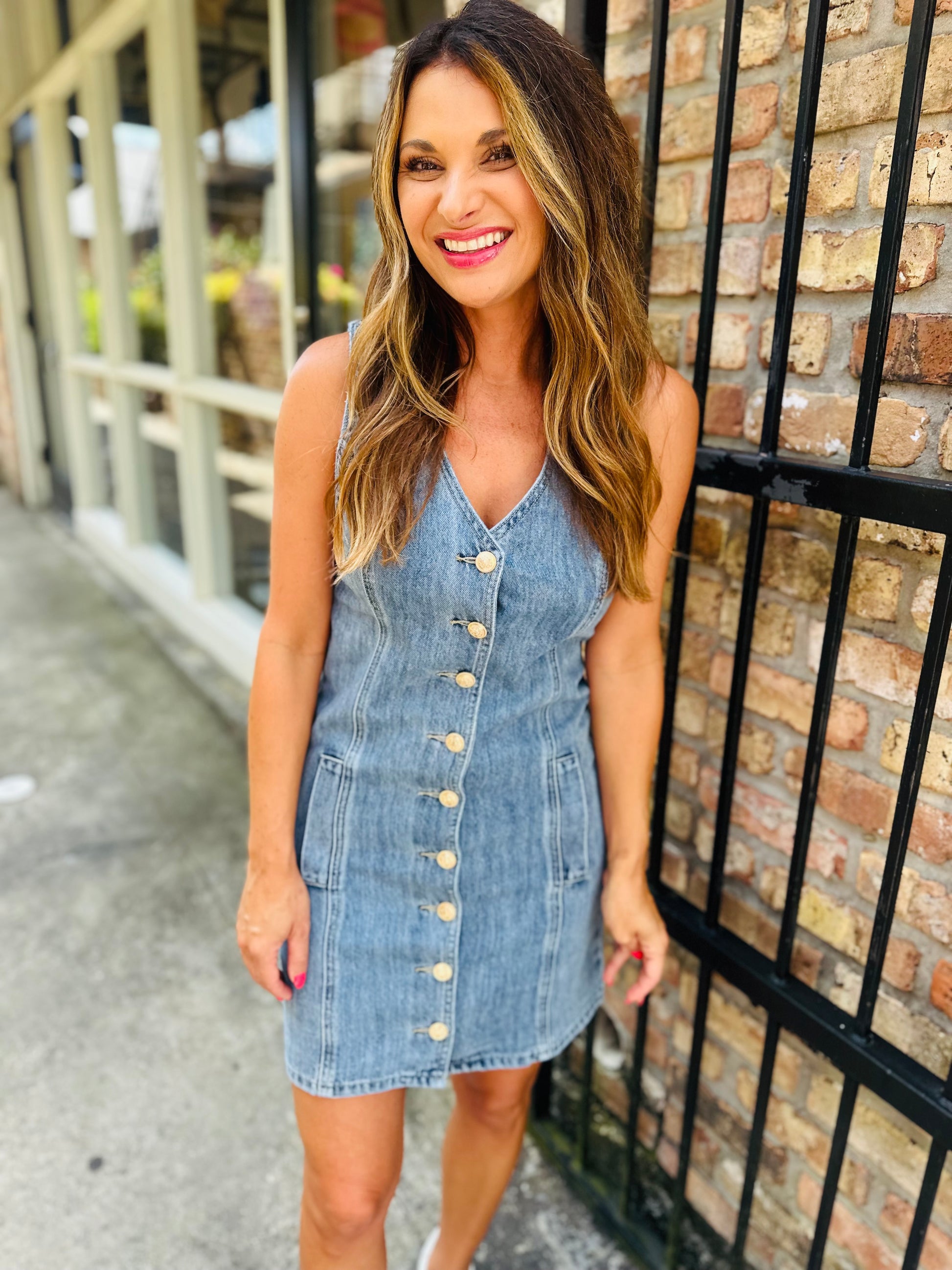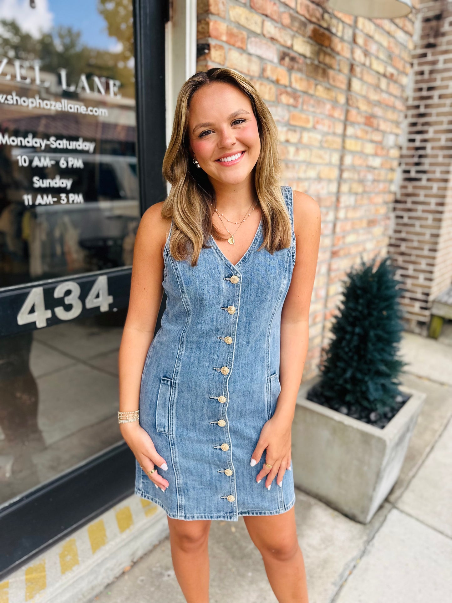 Made from a soft denim, the Tanela Dress is a closet staple. It features a slim fit, novelty button closure and a flattering v-neck.