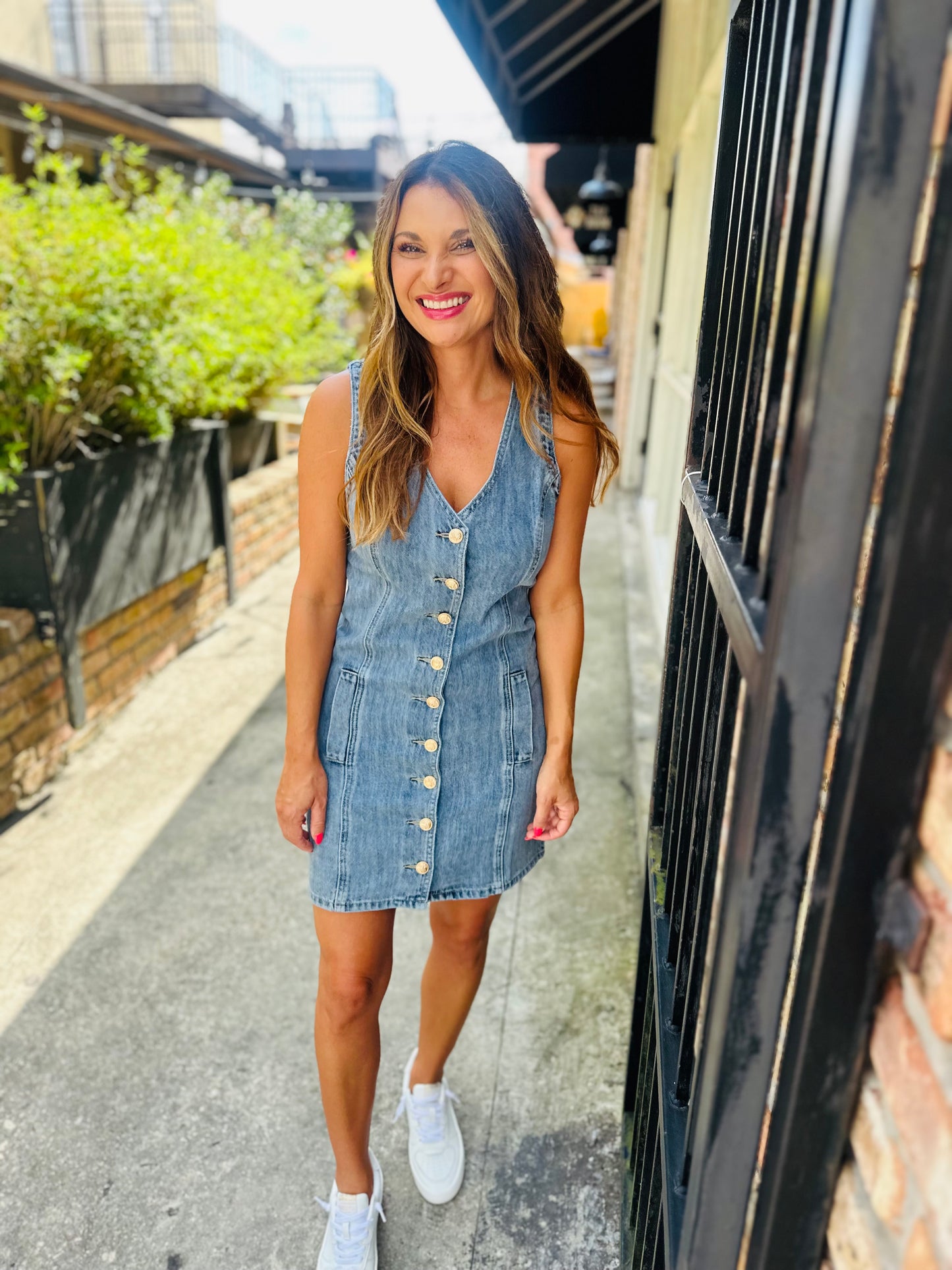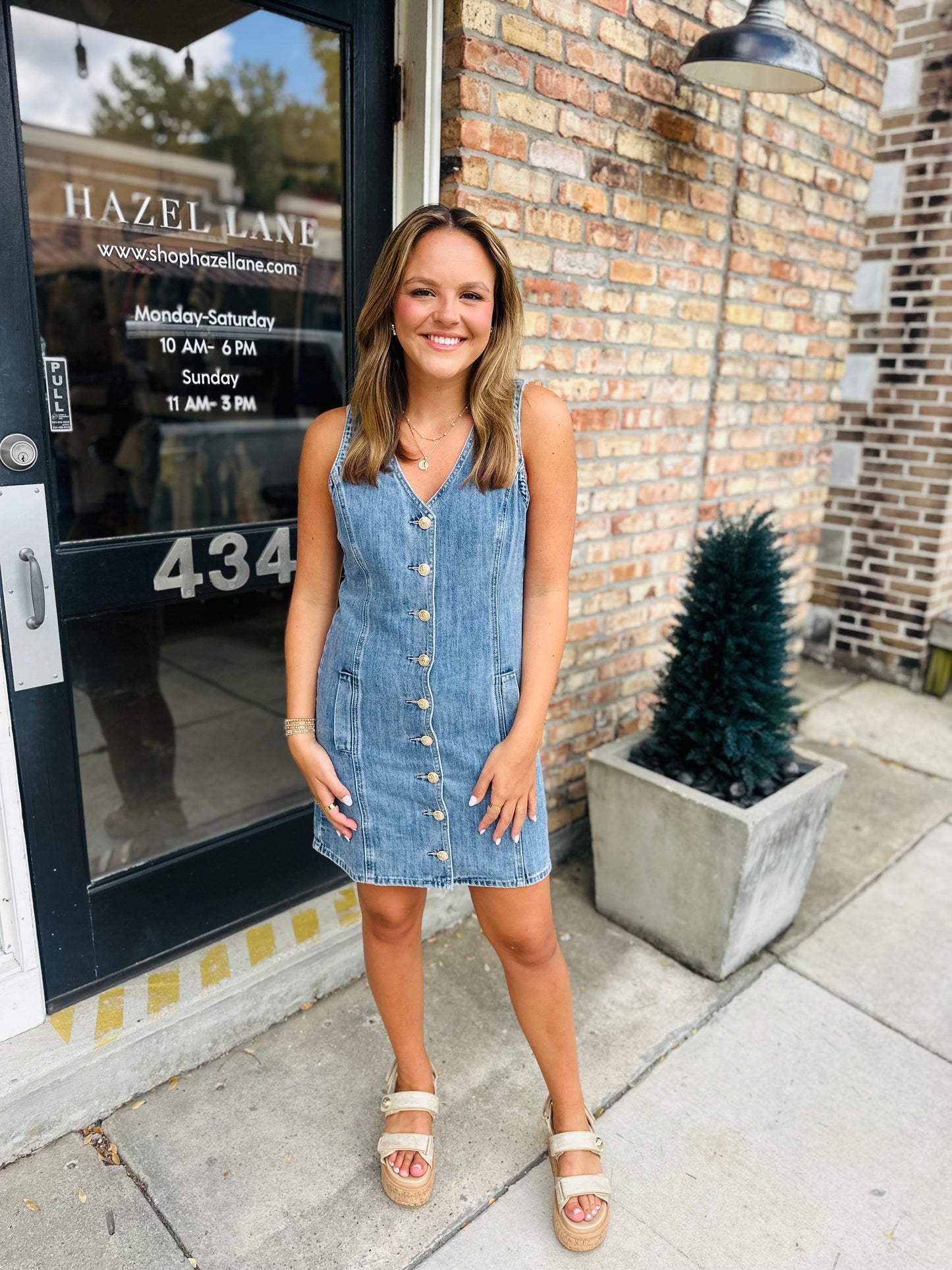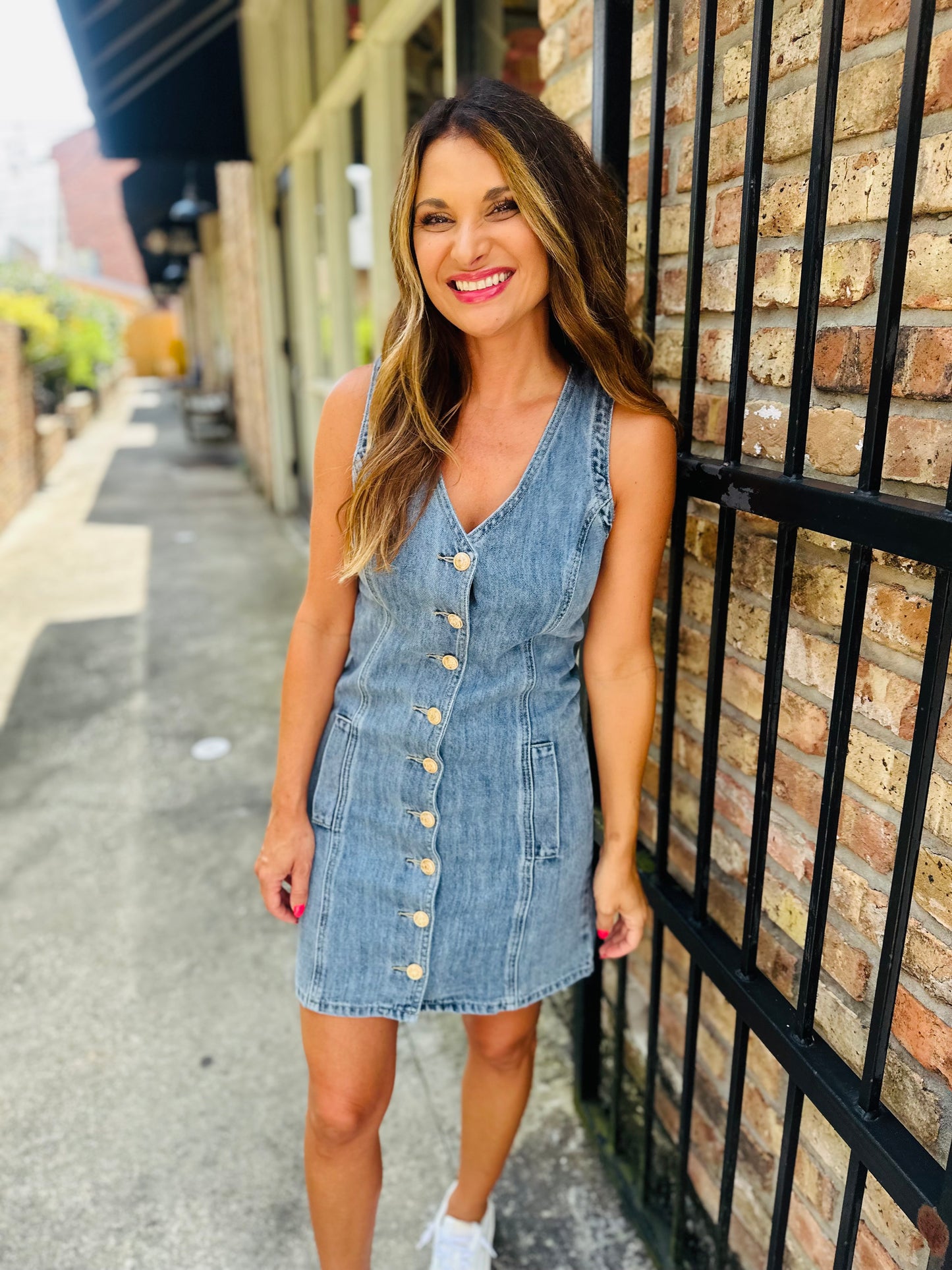 Made from a soft denim, the Tanela Dress is a closet staple. It features a slim fit, novelty button closure and a flattering v-neck.