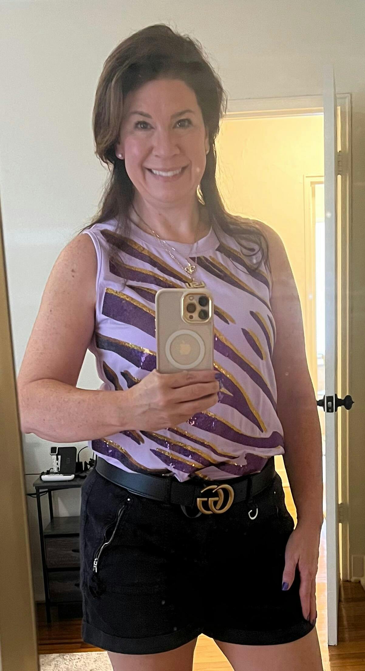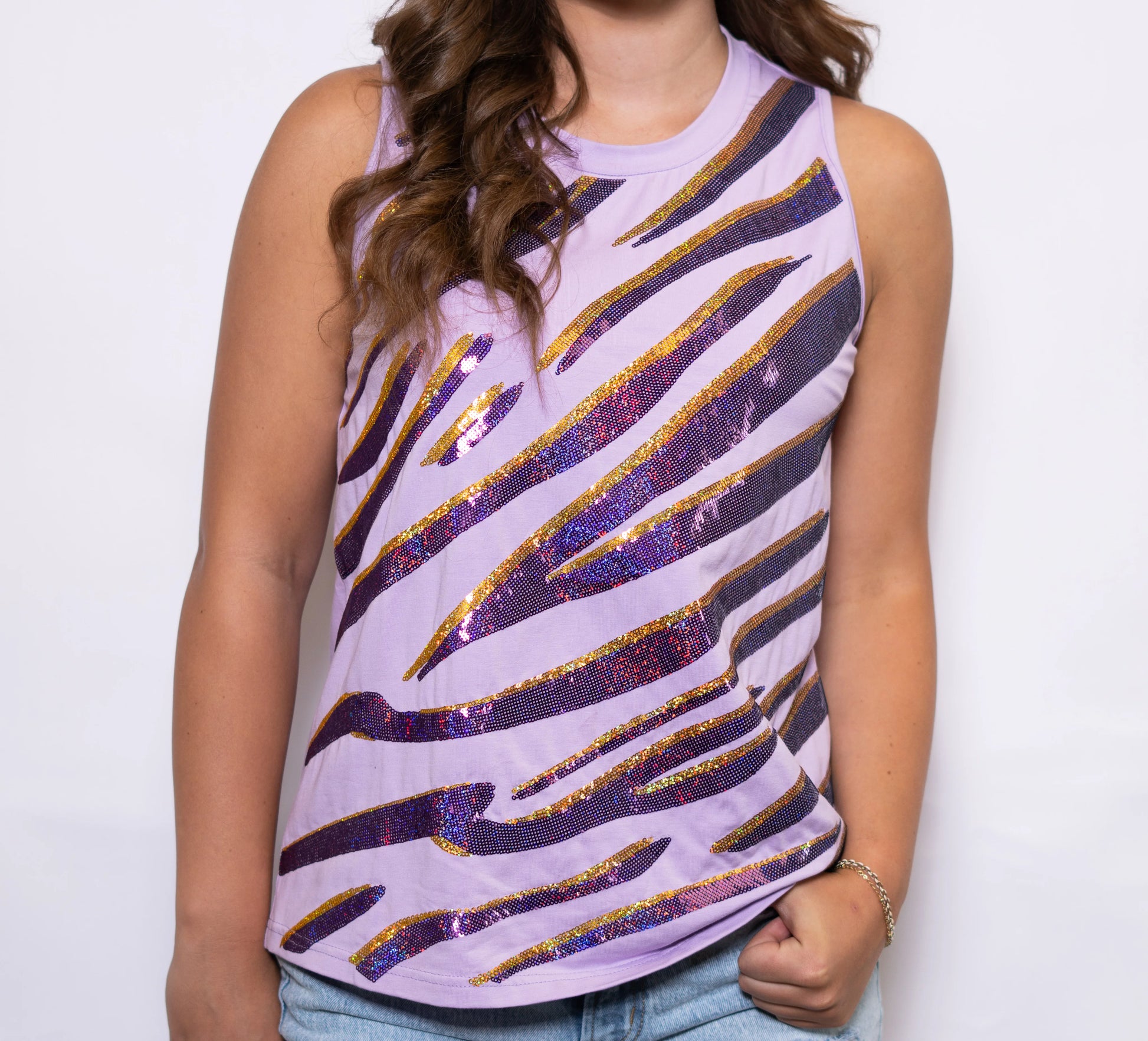 Show off your love for purple and gold with this playful tiger-striped tank! Featuring bold purple and gold sequined stripes on a buttery soft lavender fabric, this tank adds a fun, wild twist to your casual look. Perfect for sunny days, it combines comfort with eye-catching style effortlessly.