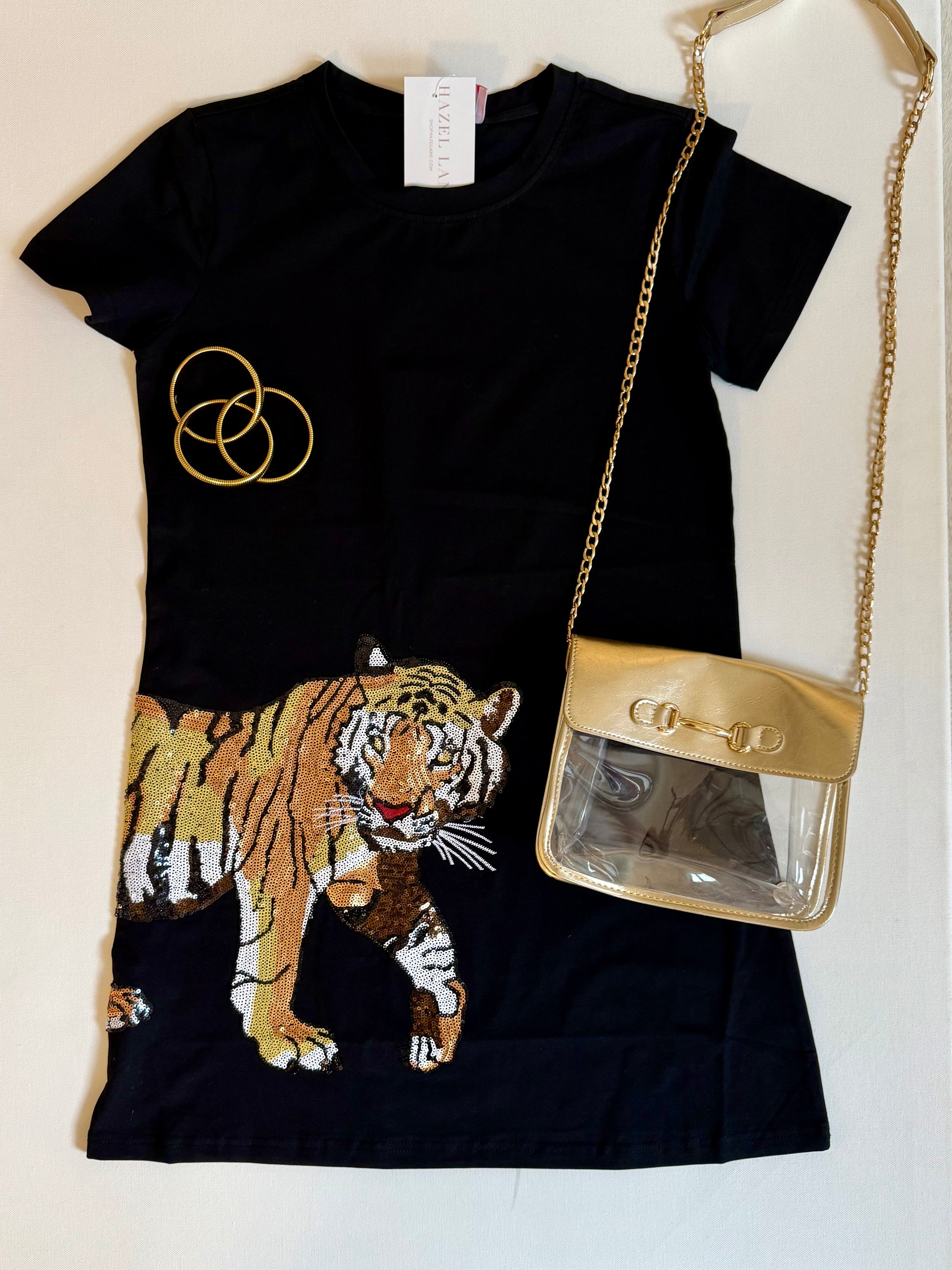 Unleash your wild side in the Tiger Wrap Around Dress in Black! With playful short sleeves and a flattering wrap tiger design, this dress brings tiger gameday vibes to your wardrobe. Perfect for showing your fierce spirit while staying comfortable and stylish all day long.