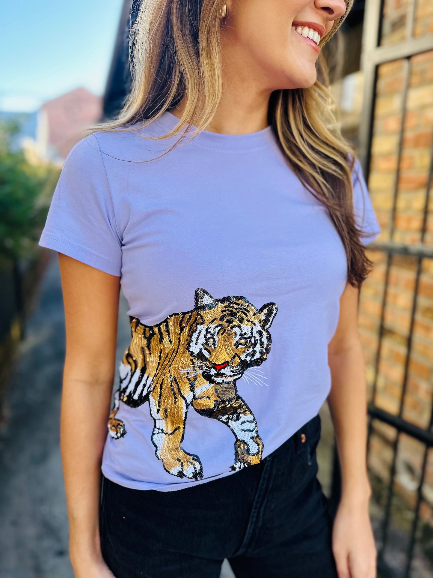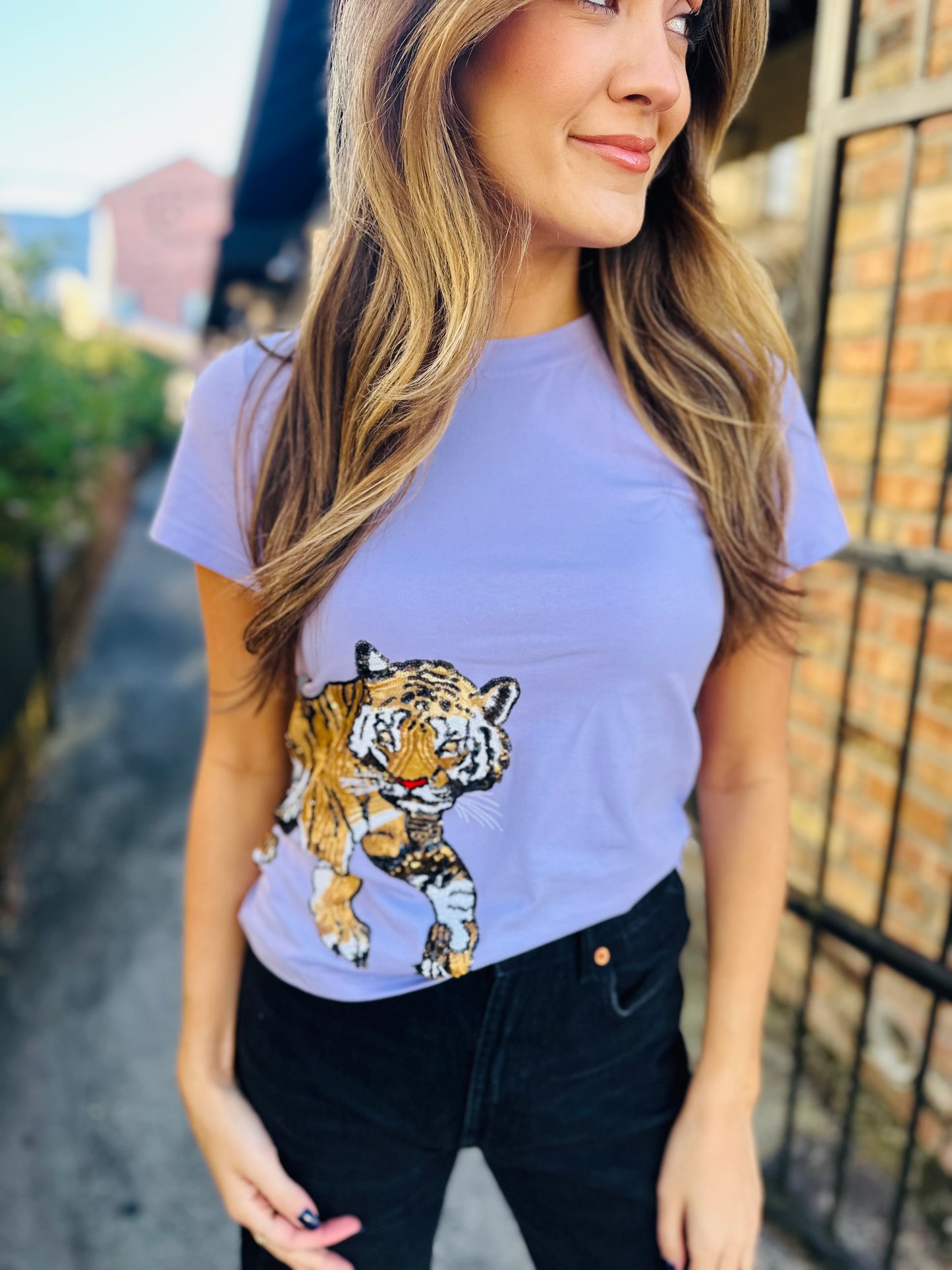 Add some sparkle to the game with the Tiger Wrap Around Tee! This playful tee features a unique design with a sparkly twist, perfect for showing off your team spirit. Stay stylish and comfortable as you cheer on your favorite team. Geaux Tigers!
