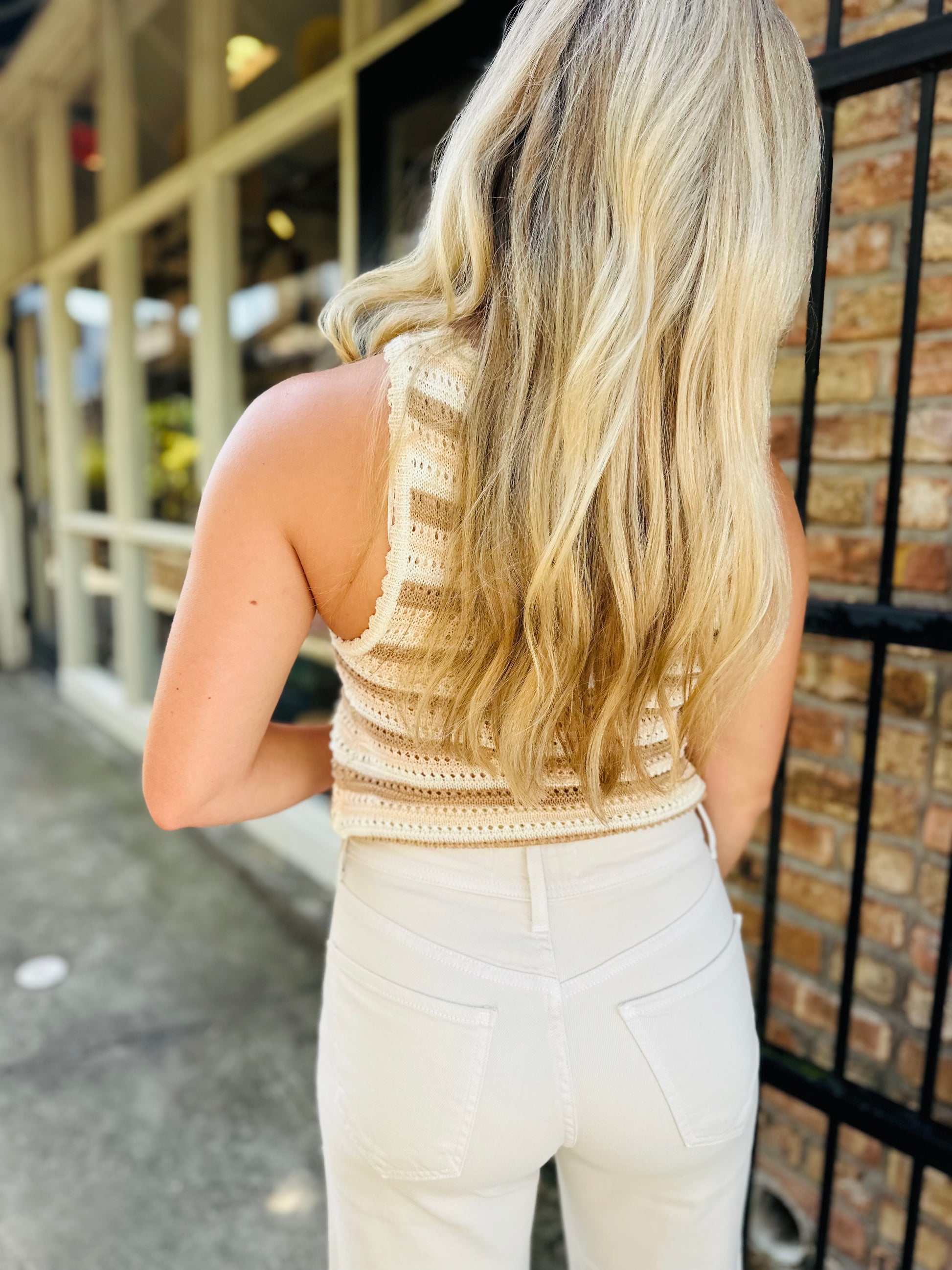 Get ready for the summer with our Tisha Striped Sweater Tank! This playful tank features a cream and multi-colored striped design that is perfect for any warm weather adventure. Stay stylish and comfortable with our Tisha tank, the ultimate summer essential.