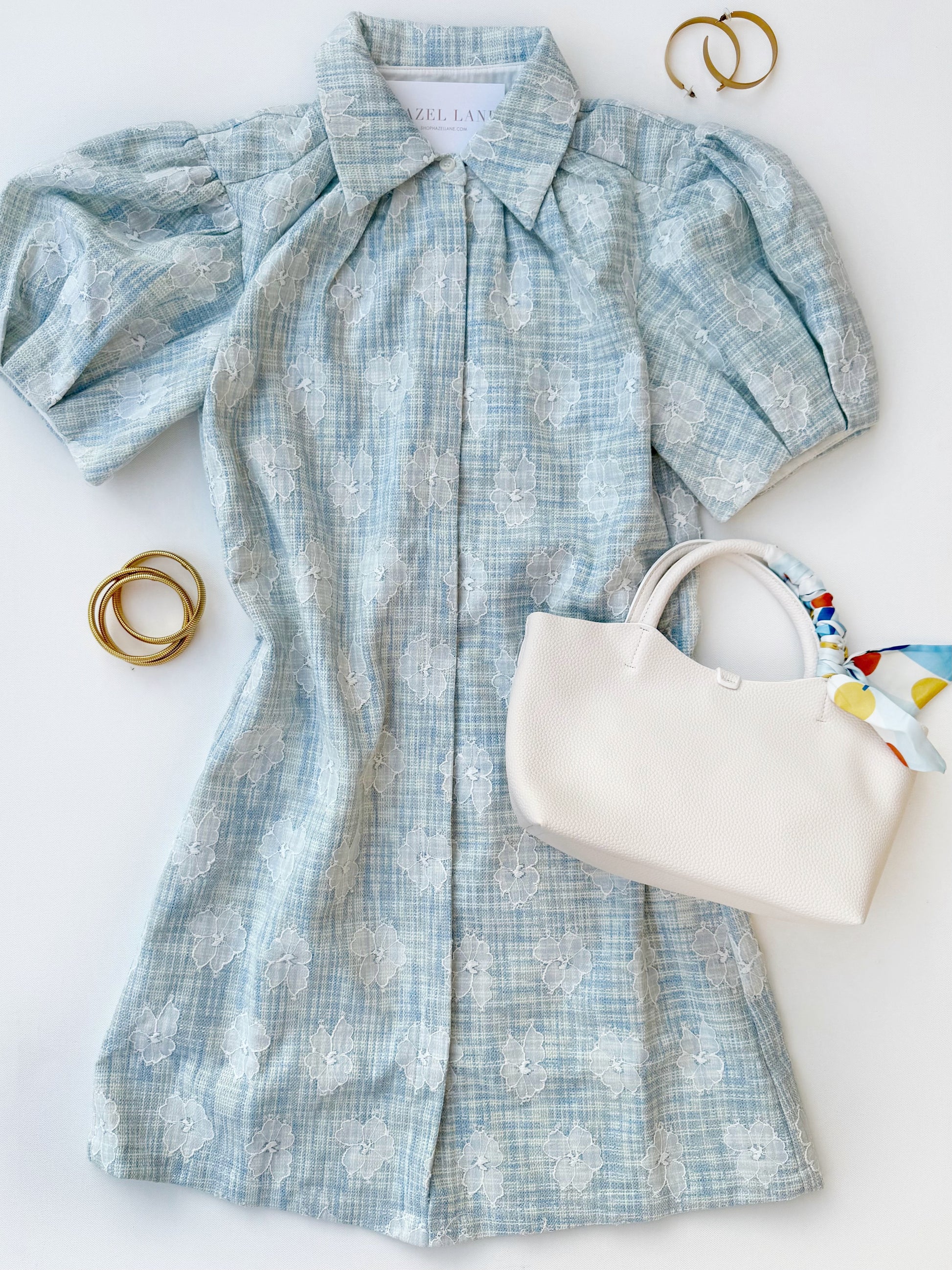 Step into charm with the Vivienne Dress in Blue Floral Tweed! Its textured, multi-colored fabric adds a fun twist to your wardrobe, making every twirl feel special. Perfect for days when you want to shine effortlessly with a playful, eye-catching look.