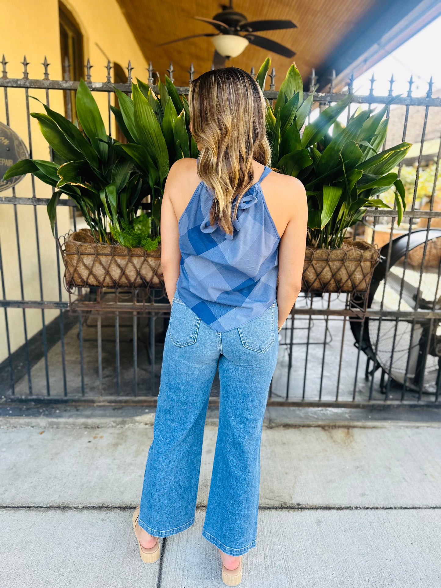 Celebrate summer in style with the Voyage Halter Top in Blue Multi. This playful cotton check design offers a breezy, comfortable fit perfect for sunny days and 4th of July festivities. Its vibrant pattern and halter neckline add a fun, flirty touch to your warm-weather wardrobe.
