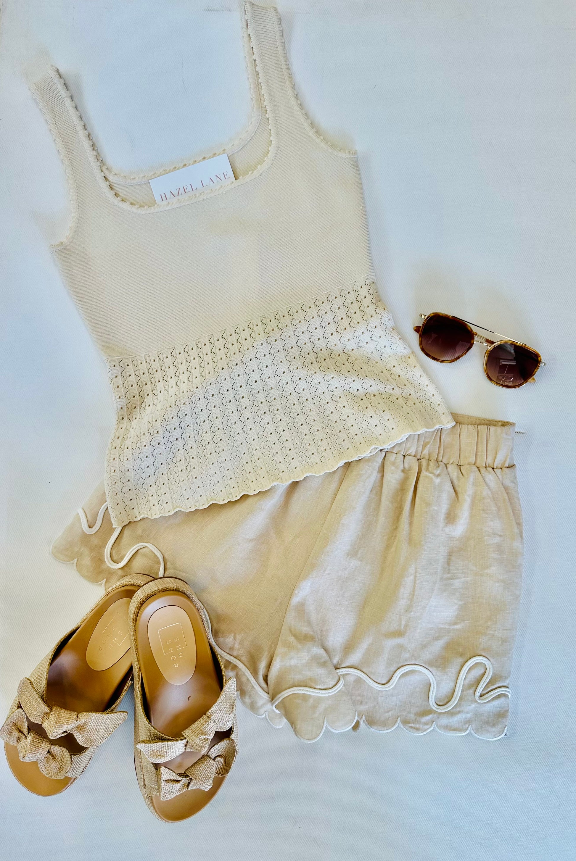 Elevate your warm-weather wardrobe with these dressy shorts featuring delicate wavy embroidery. The beige and off-white palette pairs effortlessly with heels or wedges for a polished look, while a fitted bodysuit or blouse completes the ensemble. Perfect for brunches, date nights, or elevated casual occasions.
