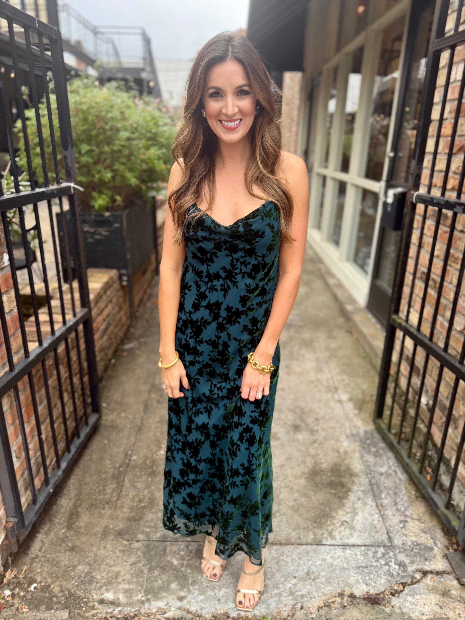 Slip into the Wisteria Maxi Dress in rich teal, where dark velvet florals create an enchanting blend of elegance and whimsy. Featuring a flattering cowl neck and adjustable straps, this dress ensures a perfect fit for any celebration. Whether you're a wedding guest or dressing for the holidays, its flowing silhouette offers comfort with a touch of playful charm. Embrace the season in style with a dress that feels as magical as the occasion.