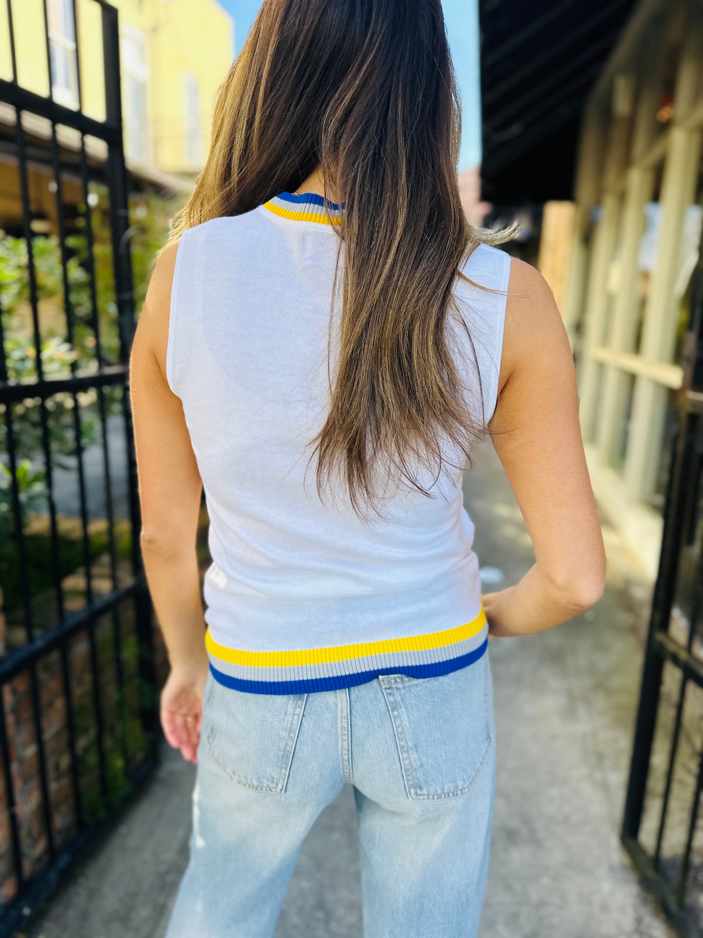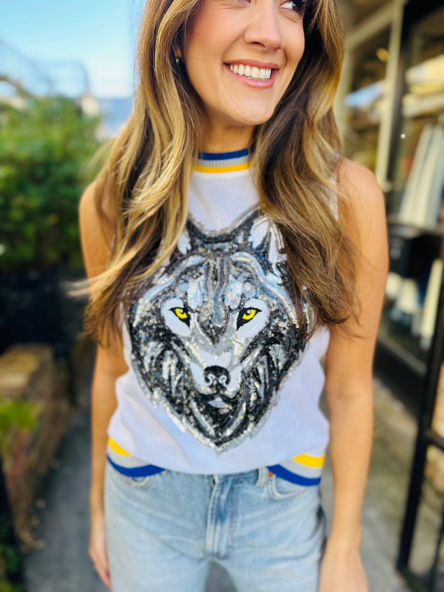 Show off your wild side with our Wolf Head Sweater Tank in white. Perfect for game day at St. Paul's School or any occasion when you want to stand out. Unleash your inner wolf and sparkle with style. Throw on a denim jacket this fall to wear in the cooler temps.