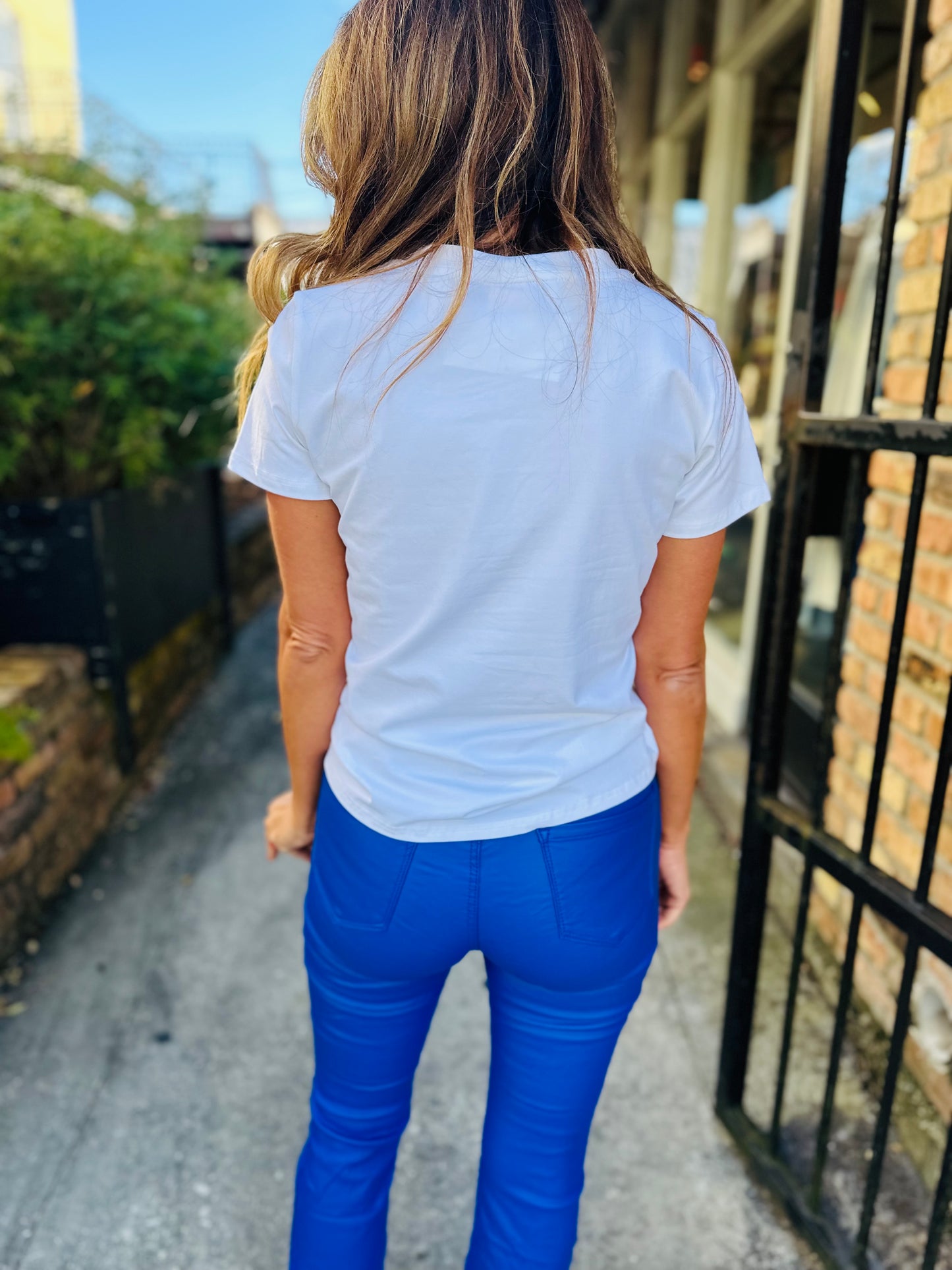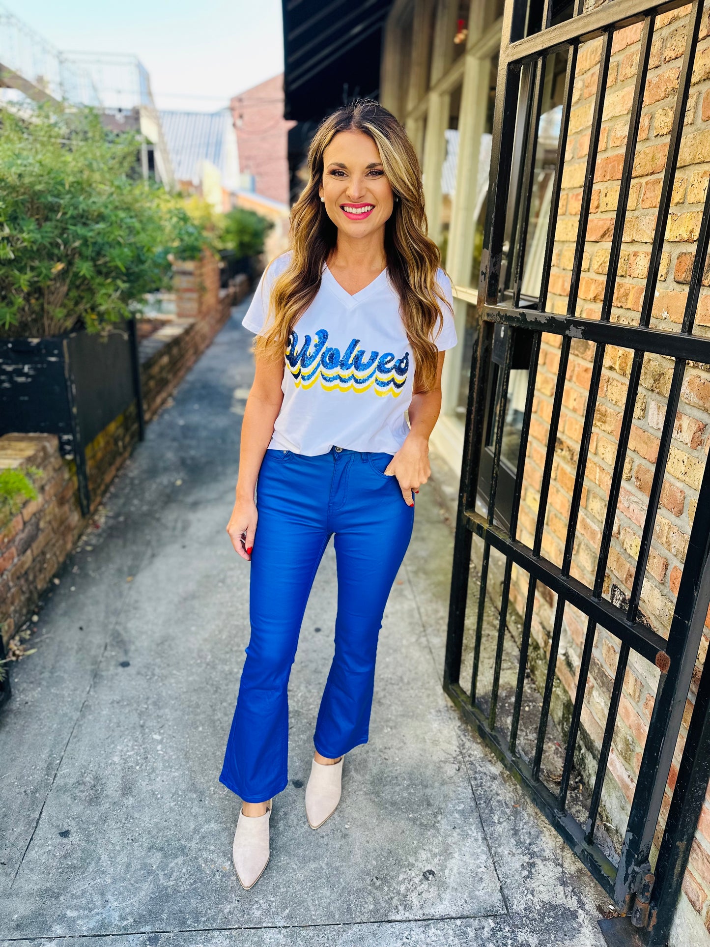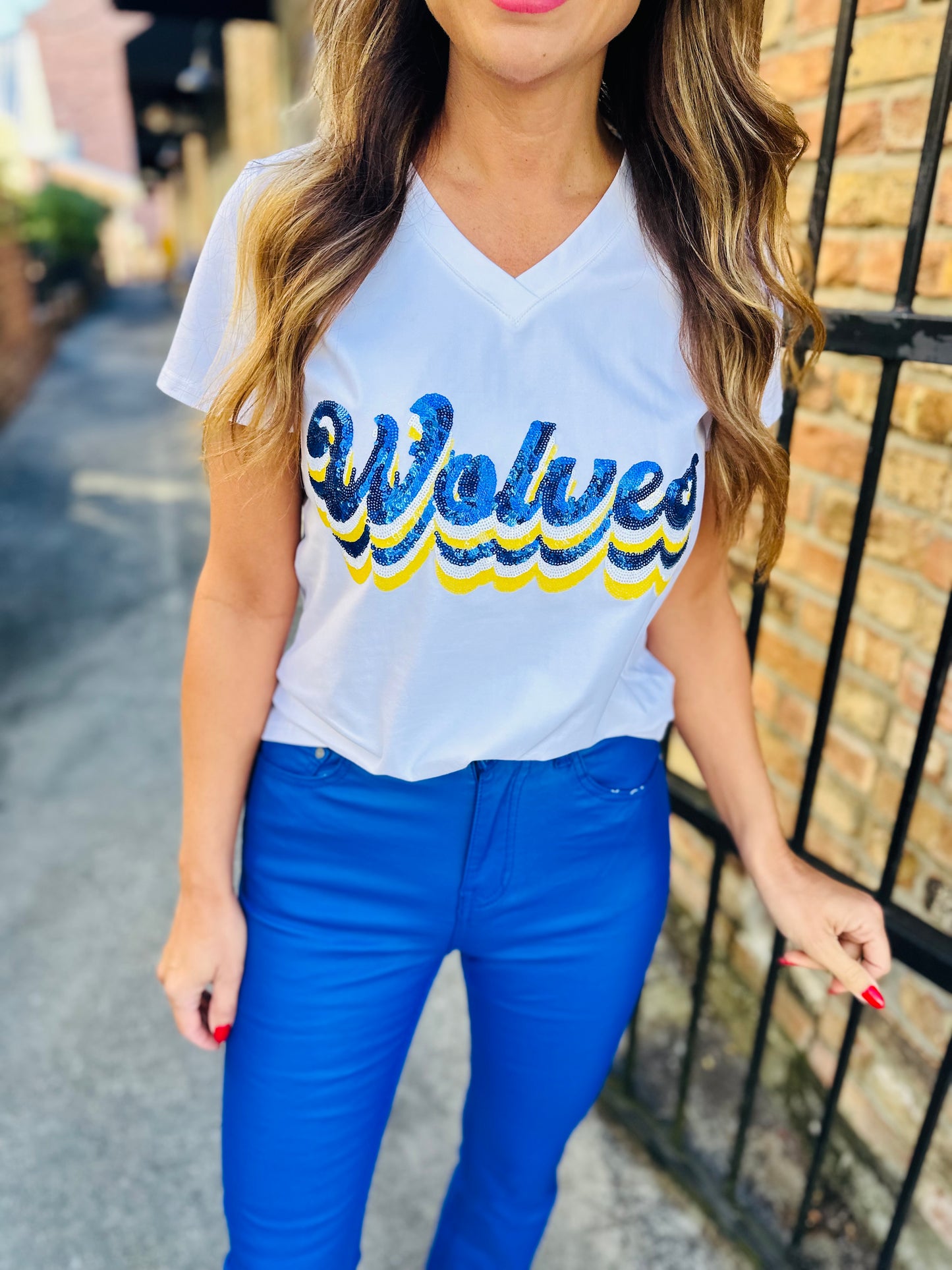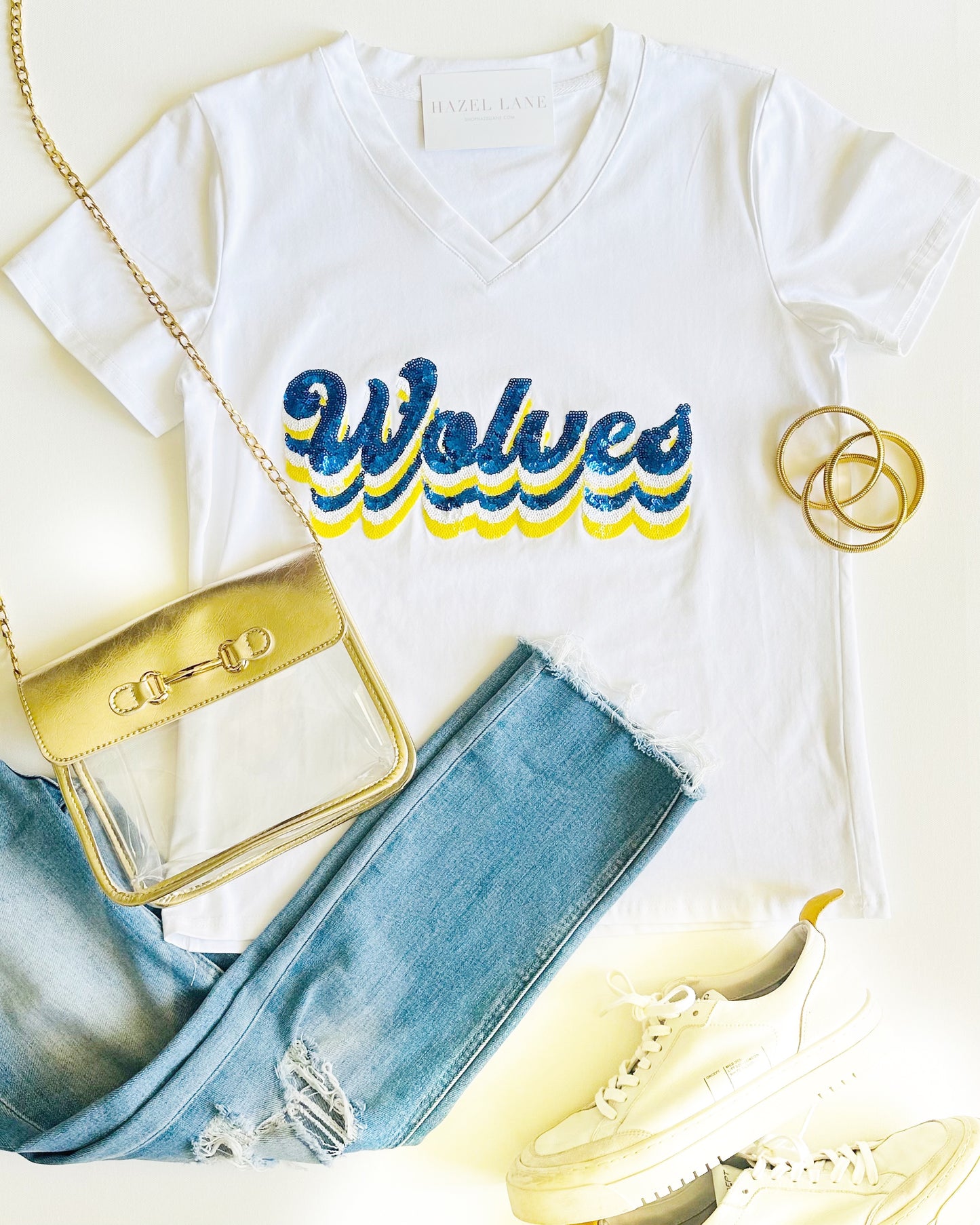 Show off your school spirit with the St. Paul's Wolves Script Tee for game day. This top features the word Wolves in full sequin script on the front of a solid white tee. Get your paws on one today! Throw on a denim jacket in the fall and be the best dressed at game day!