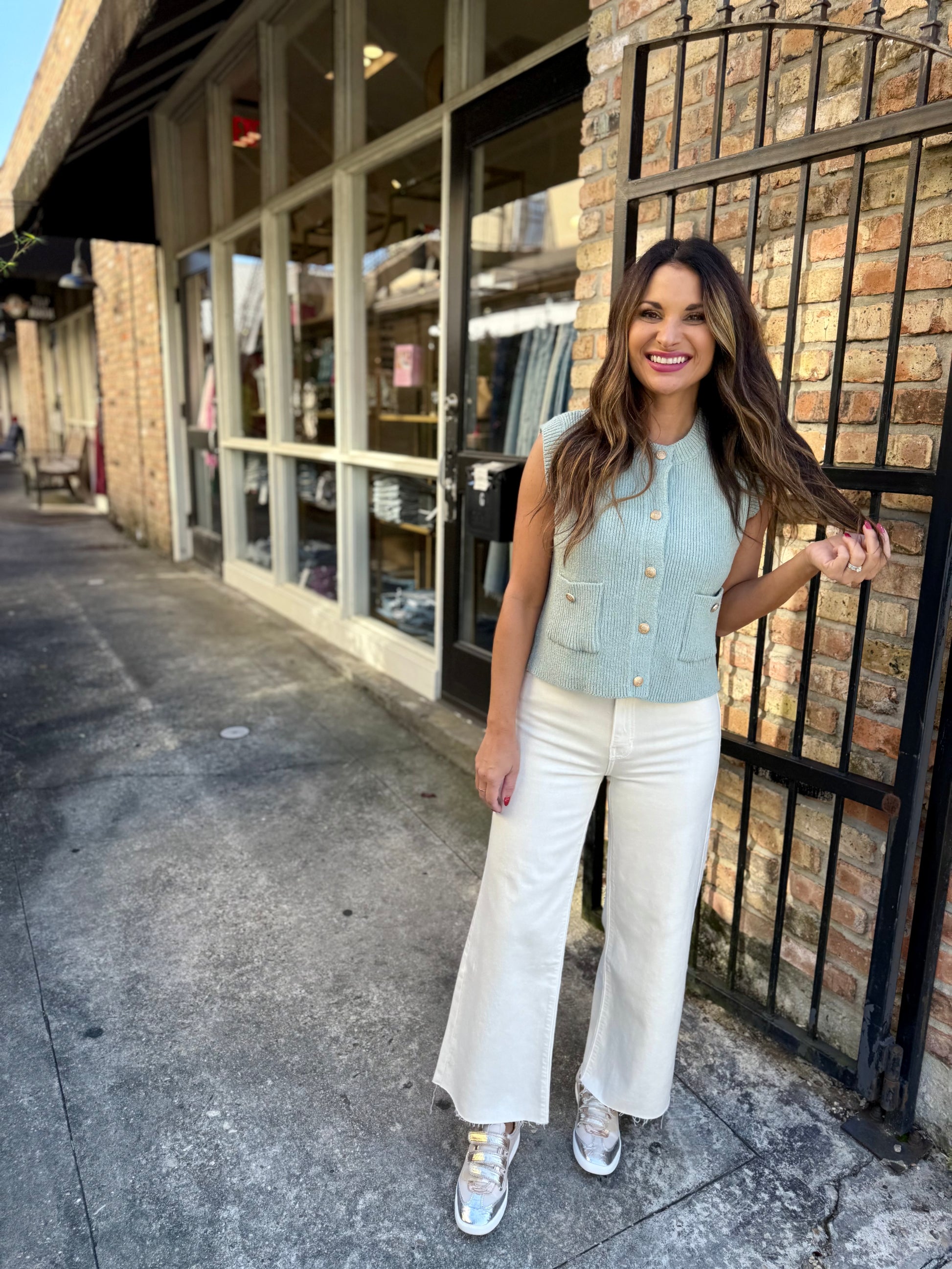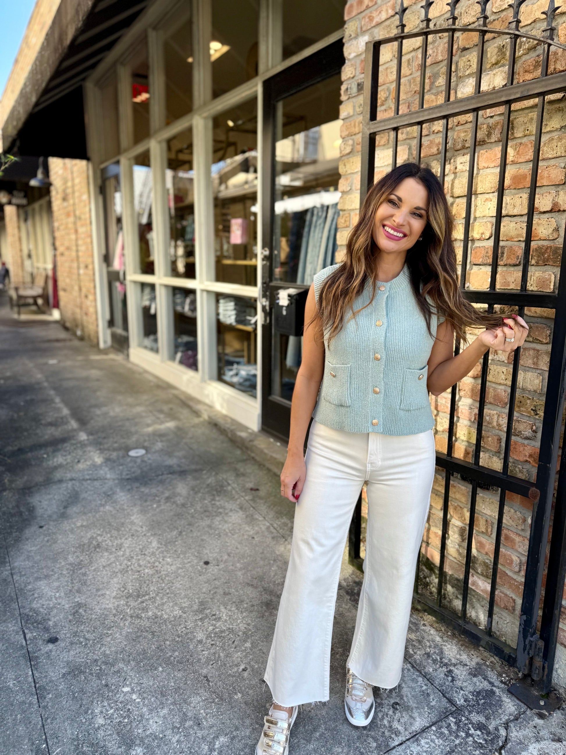 Level up with effortless style in this sleeveless knit vest! The round neckline and gold-tone button front create a timeless look, while practical patch pockets add everyday functionality. Ribbed trim detailing keeps everything polished and put-together. Perfect for pairing with a crisp pair of denim for instant sophistication.