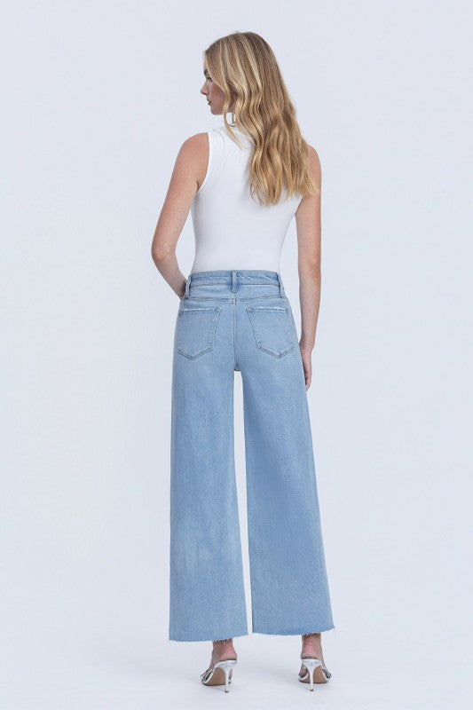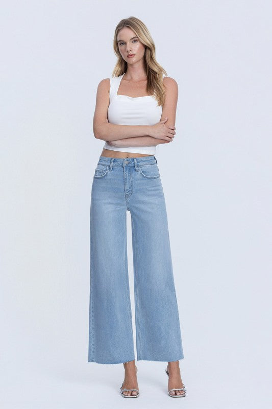 These high-rise wide-leg jeans are your new denim obsession! Crafted from stretchy comfort denim, they feature a flattering high waist, five functional pockets, and subtle distressed details for that effortlessly cool vibe. The raw hem and ankle length keep things modern and edgy, while the light wash brightens any outfit. Perfect for pairing with everything from crop tops to oversized sweaters—comfort meets style in the best way possible.