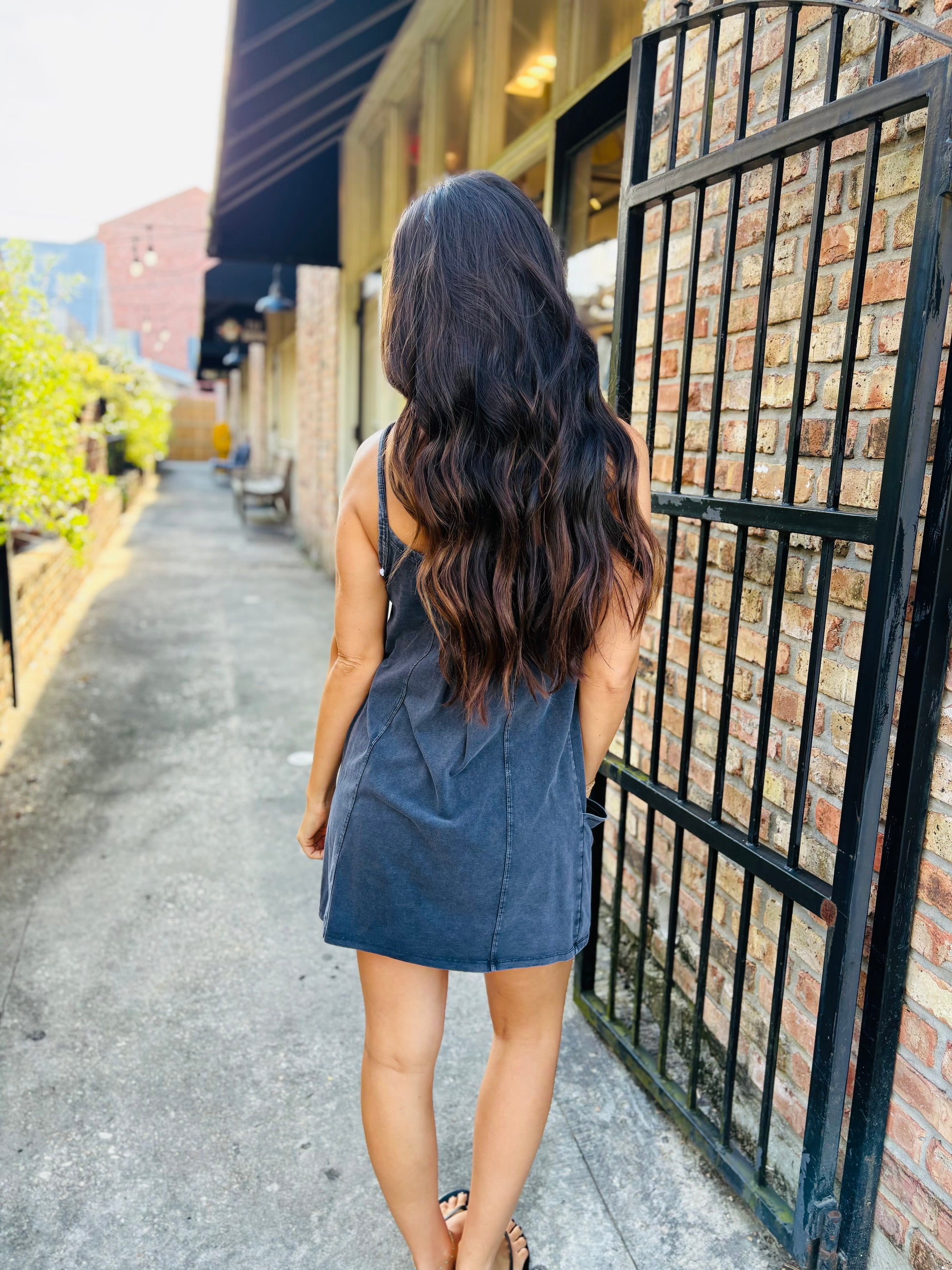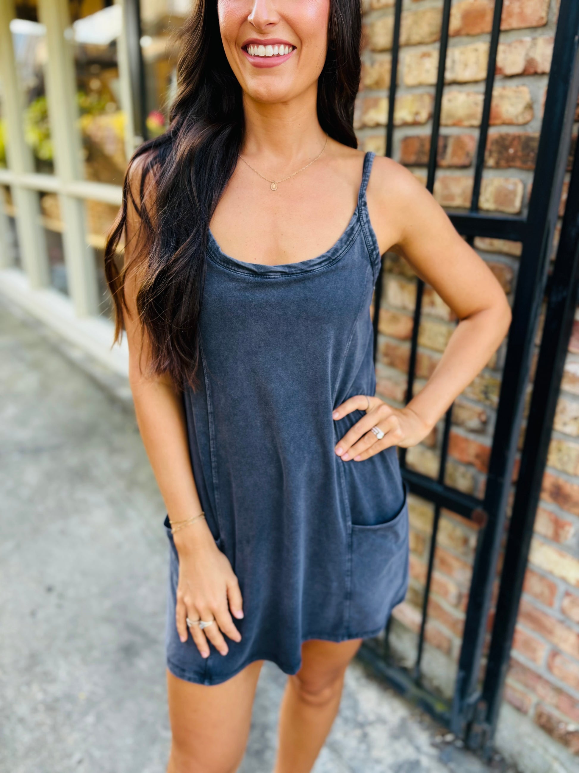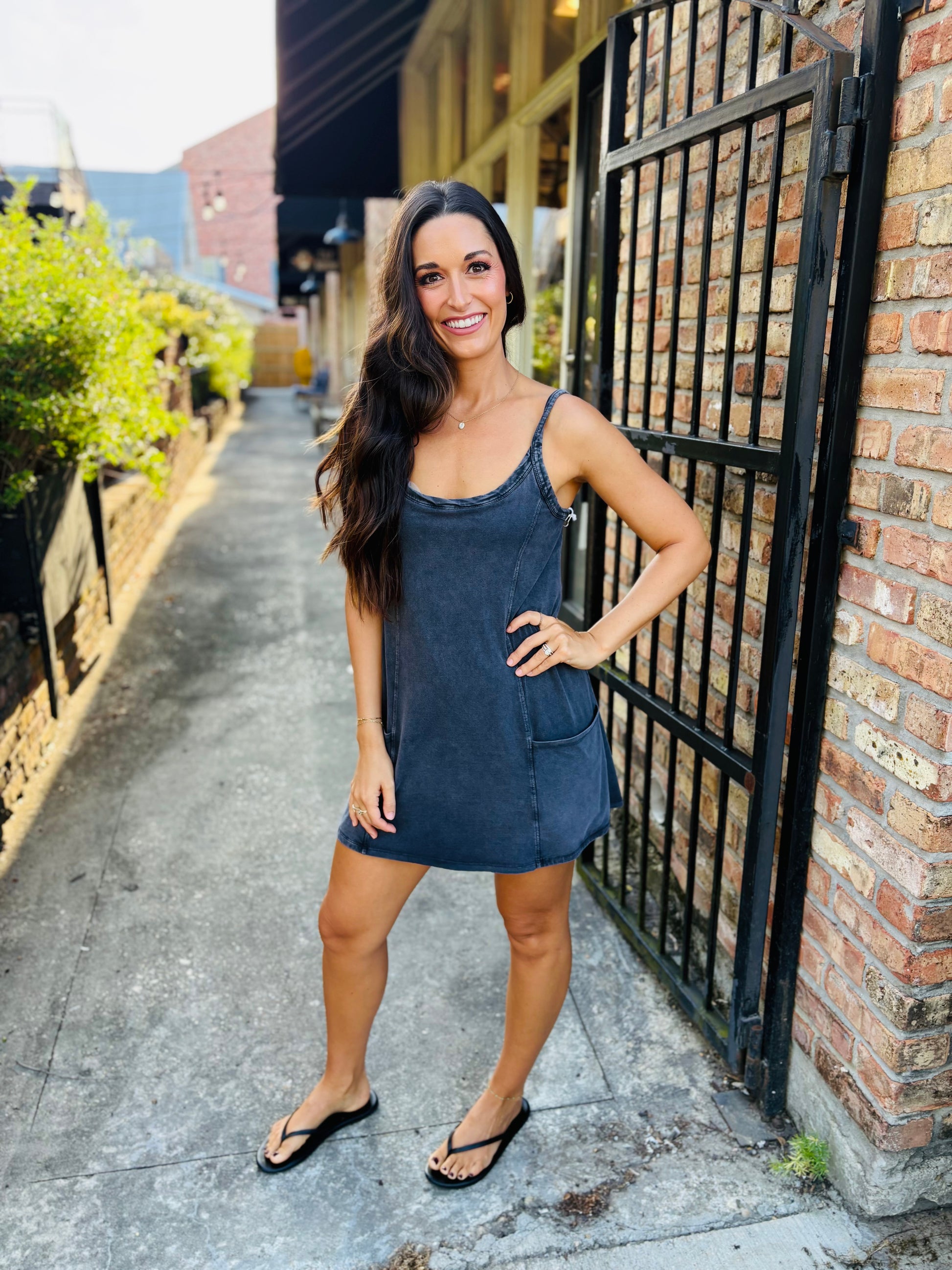Built for movement and made for comfort, this casual mini dress blends sporty function with an easy, throw-on feel. Crafted from soft cotton spandex jersey, it features a fitted inner onesie, thin, stretchy straps, and a scoop neckline, with pleated back details and patch pockets that keep things playful and practical.