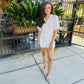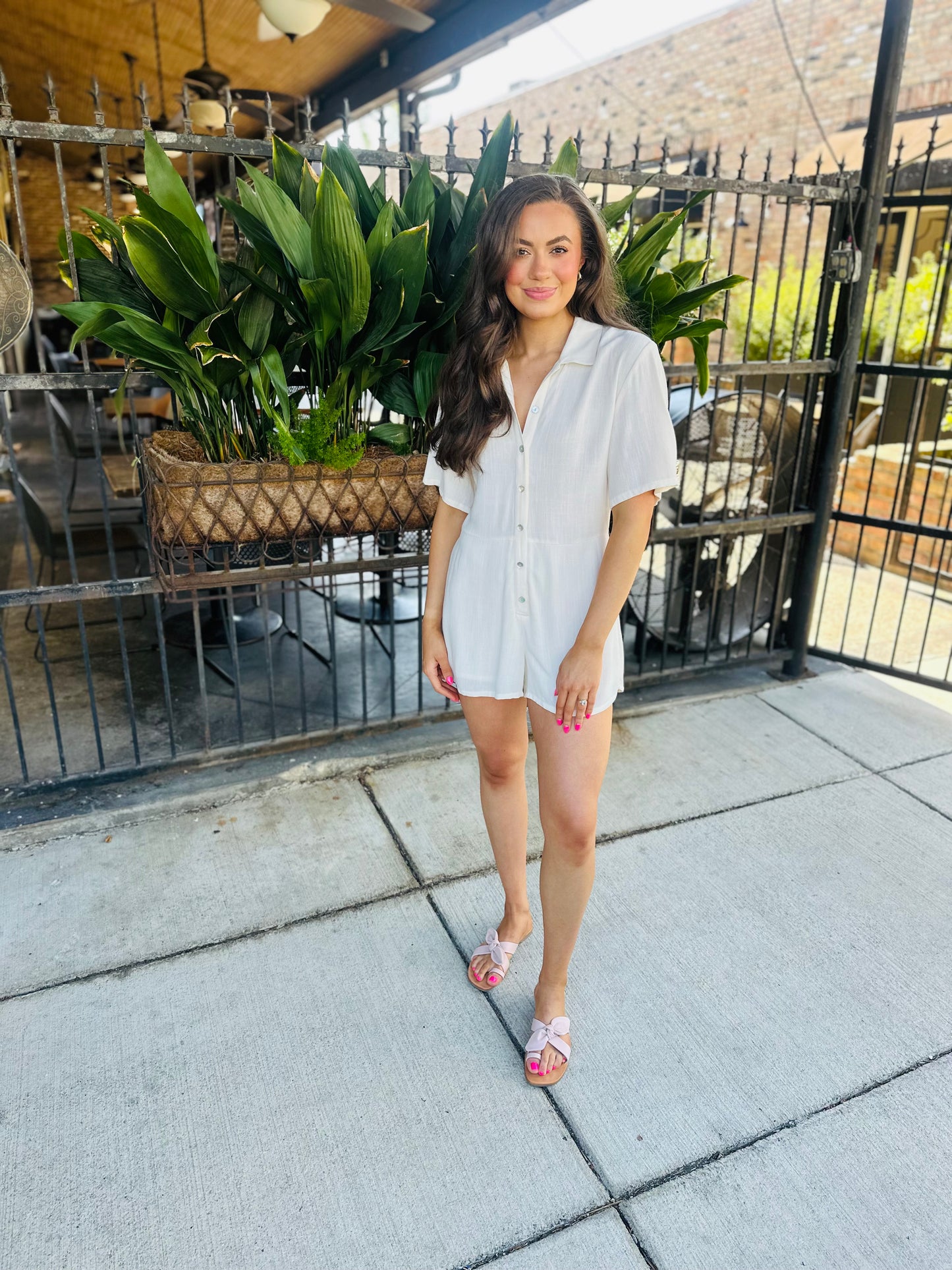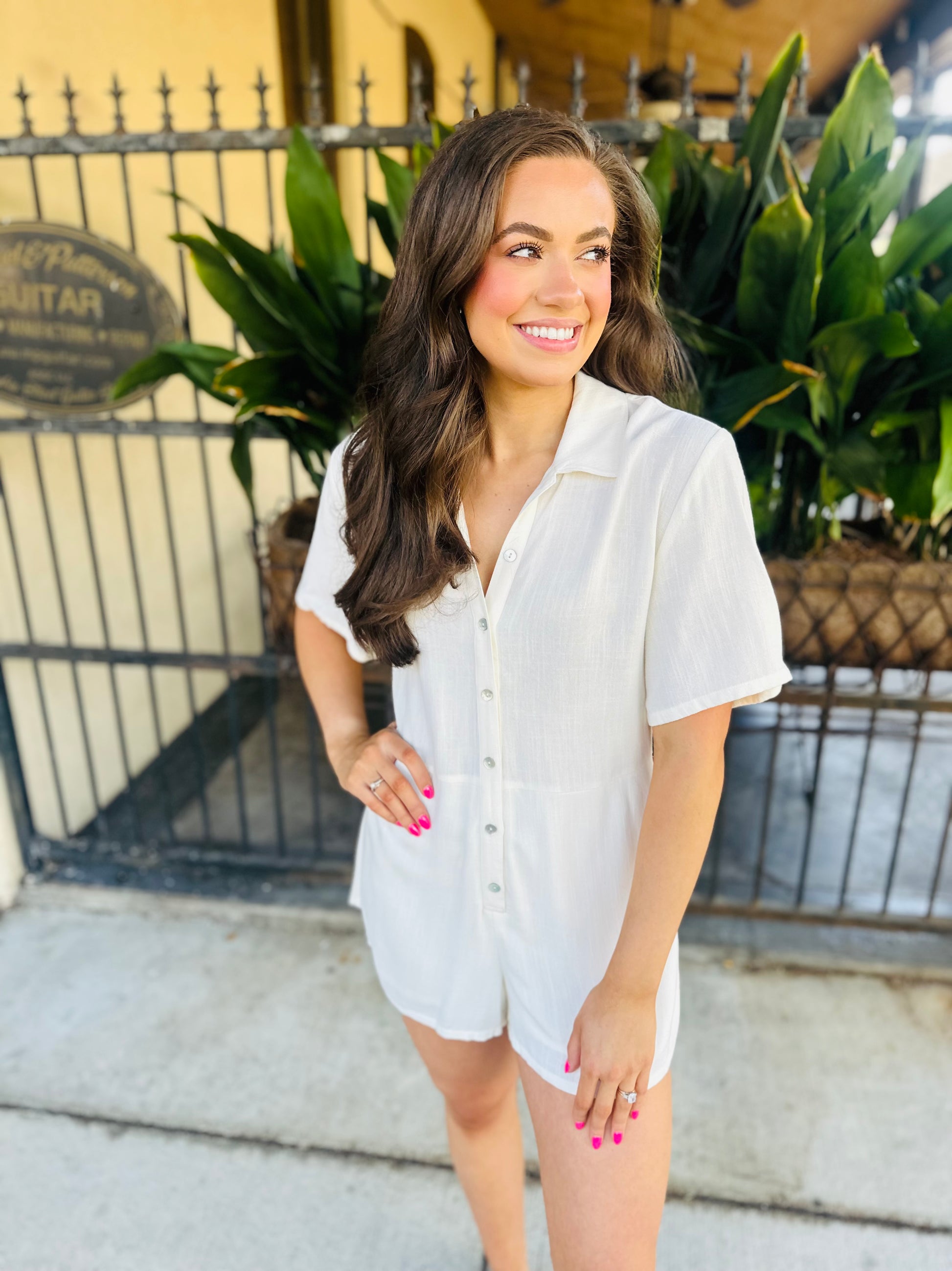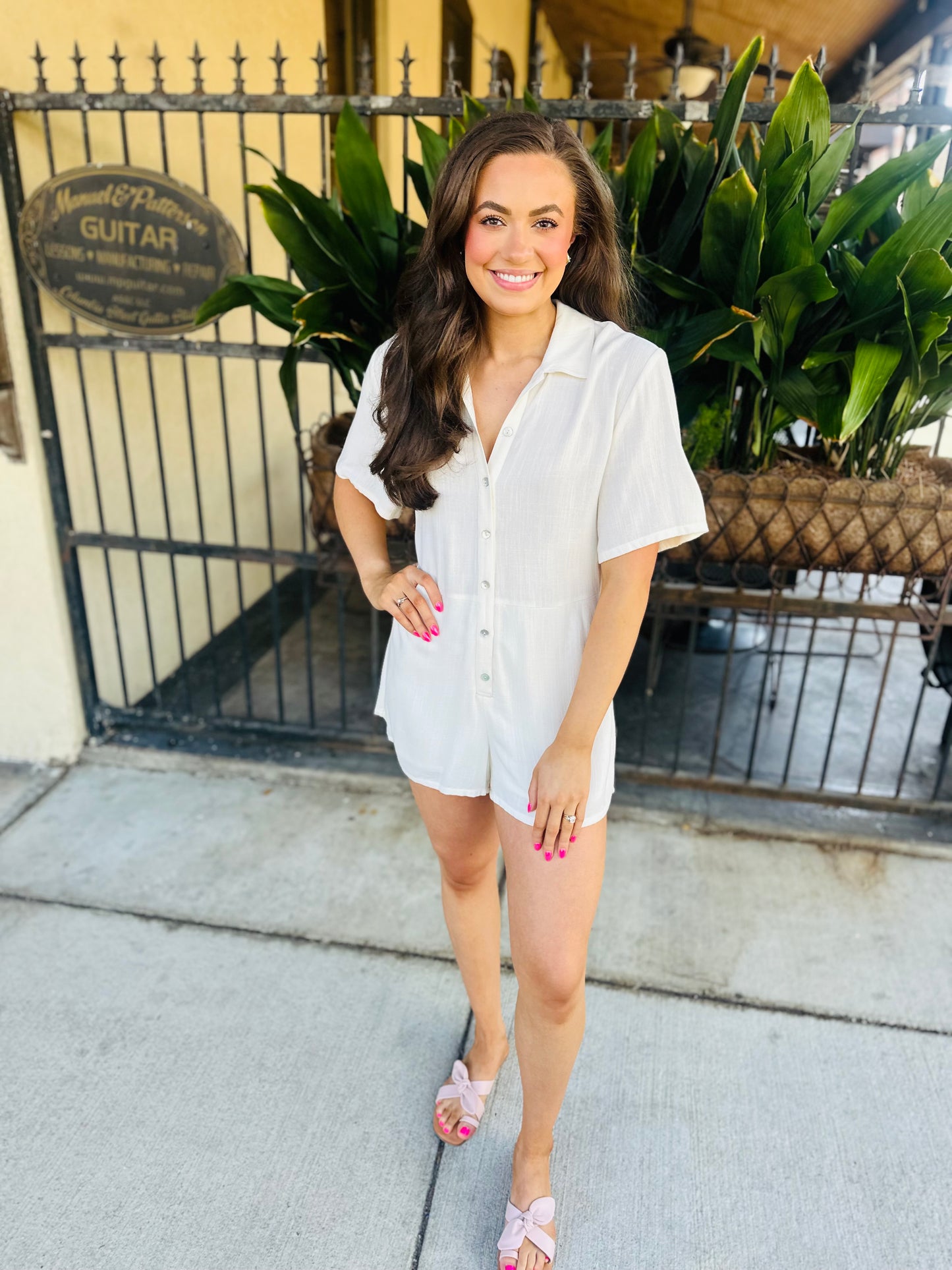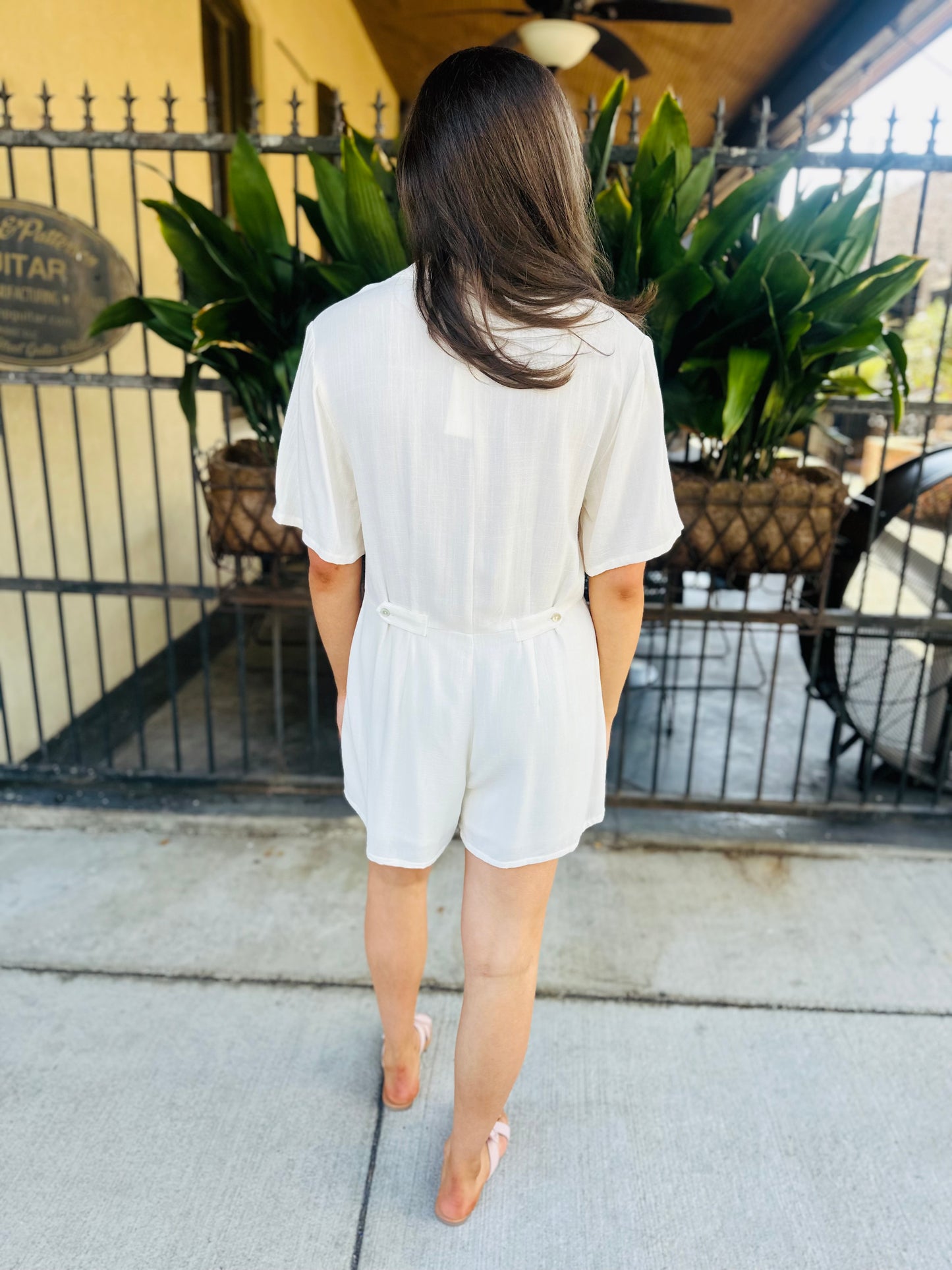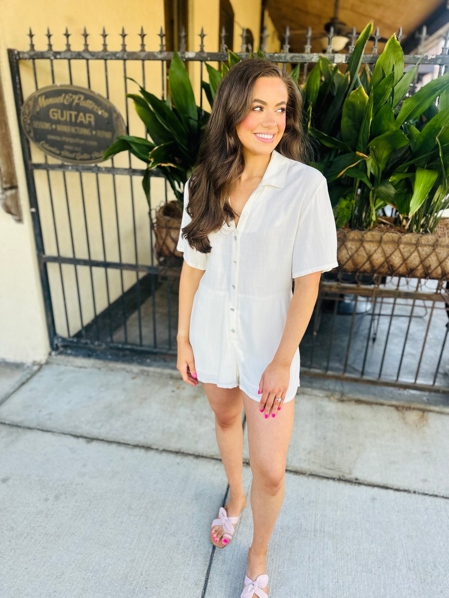 This relaxed linen romper is the ultimate one-and-done style, with a collared neckline, short sleeves, and lined shorts. Adjustable back tabs accentuate your waist, just button up and go.