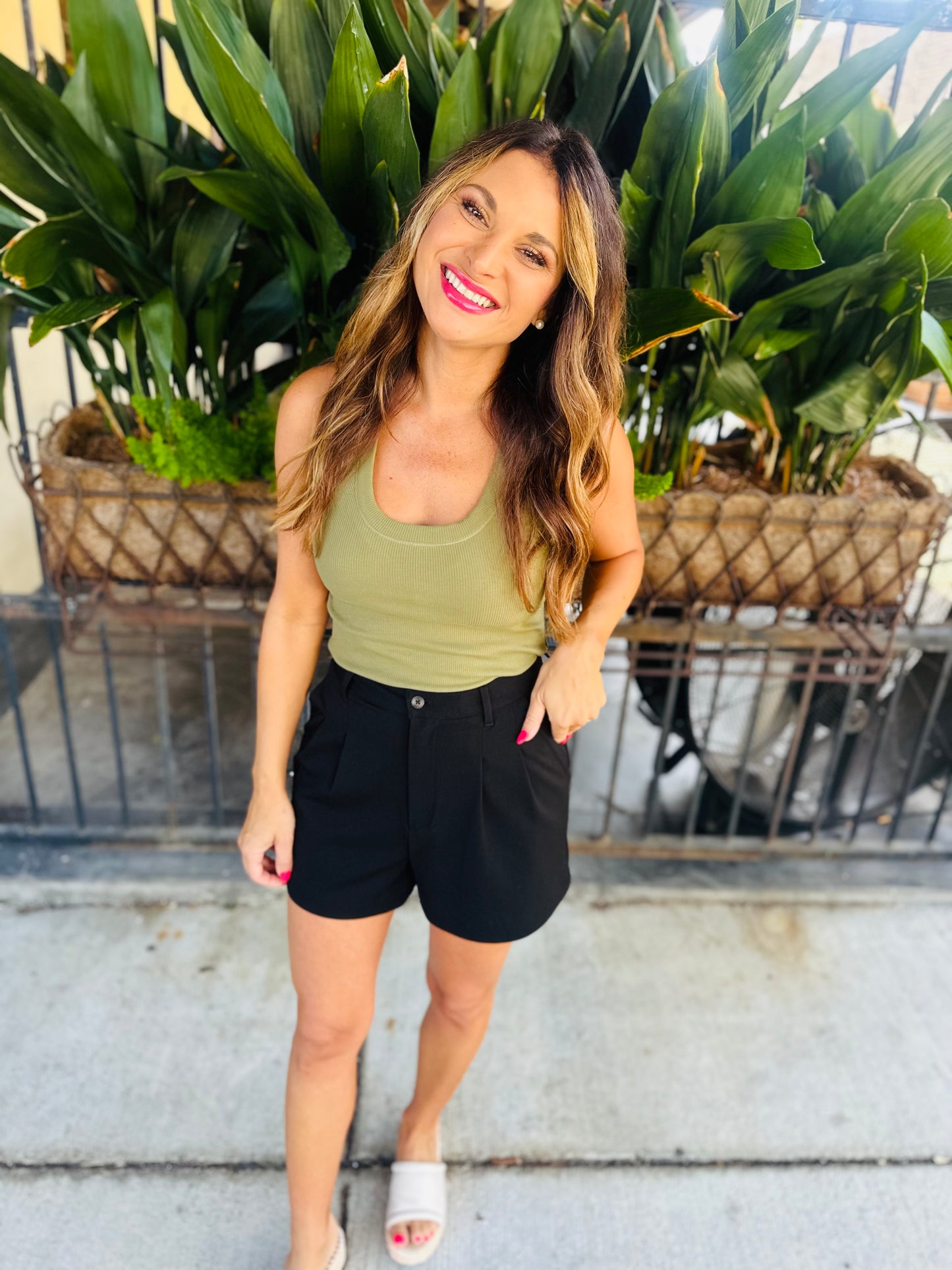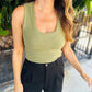 One of our most popular Essential tanks, made of our softly textured feather rib fabric, is a must-have whether worn on its own or as a fitted layer. We love this basic bra-friendly tank tucked or untucked.